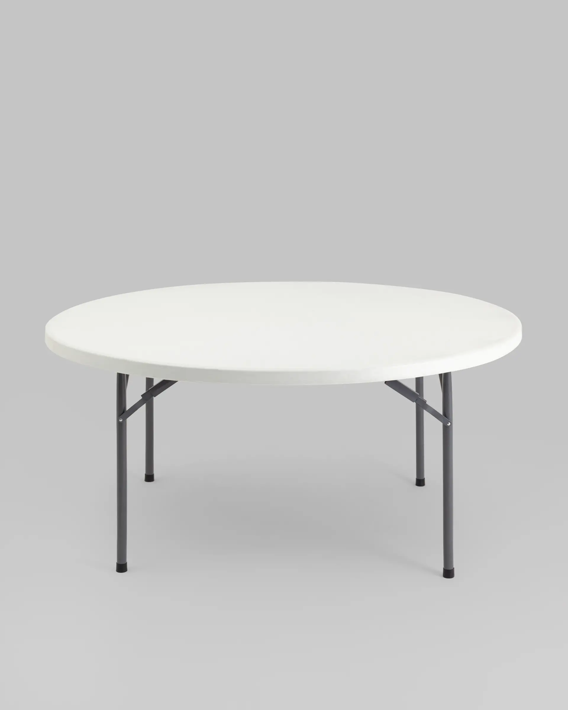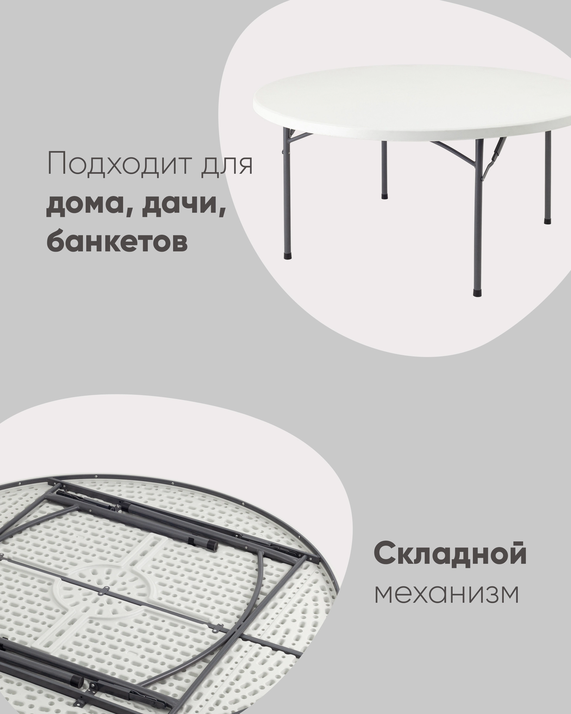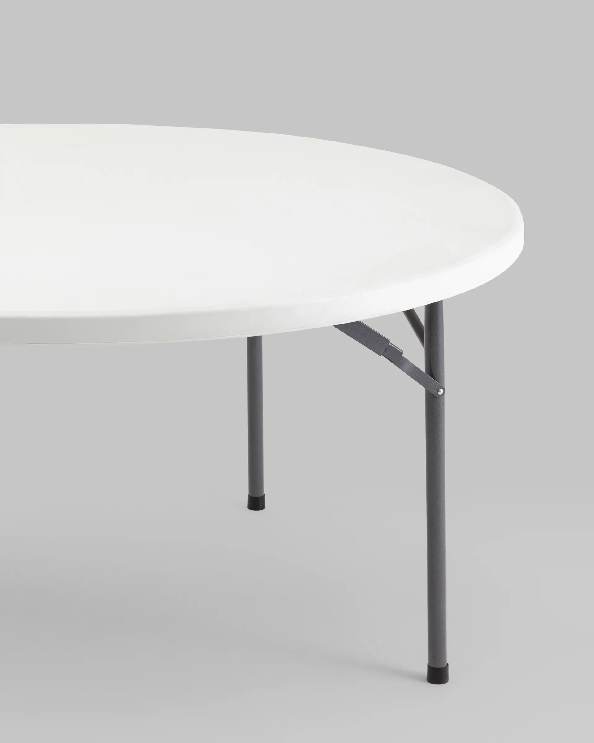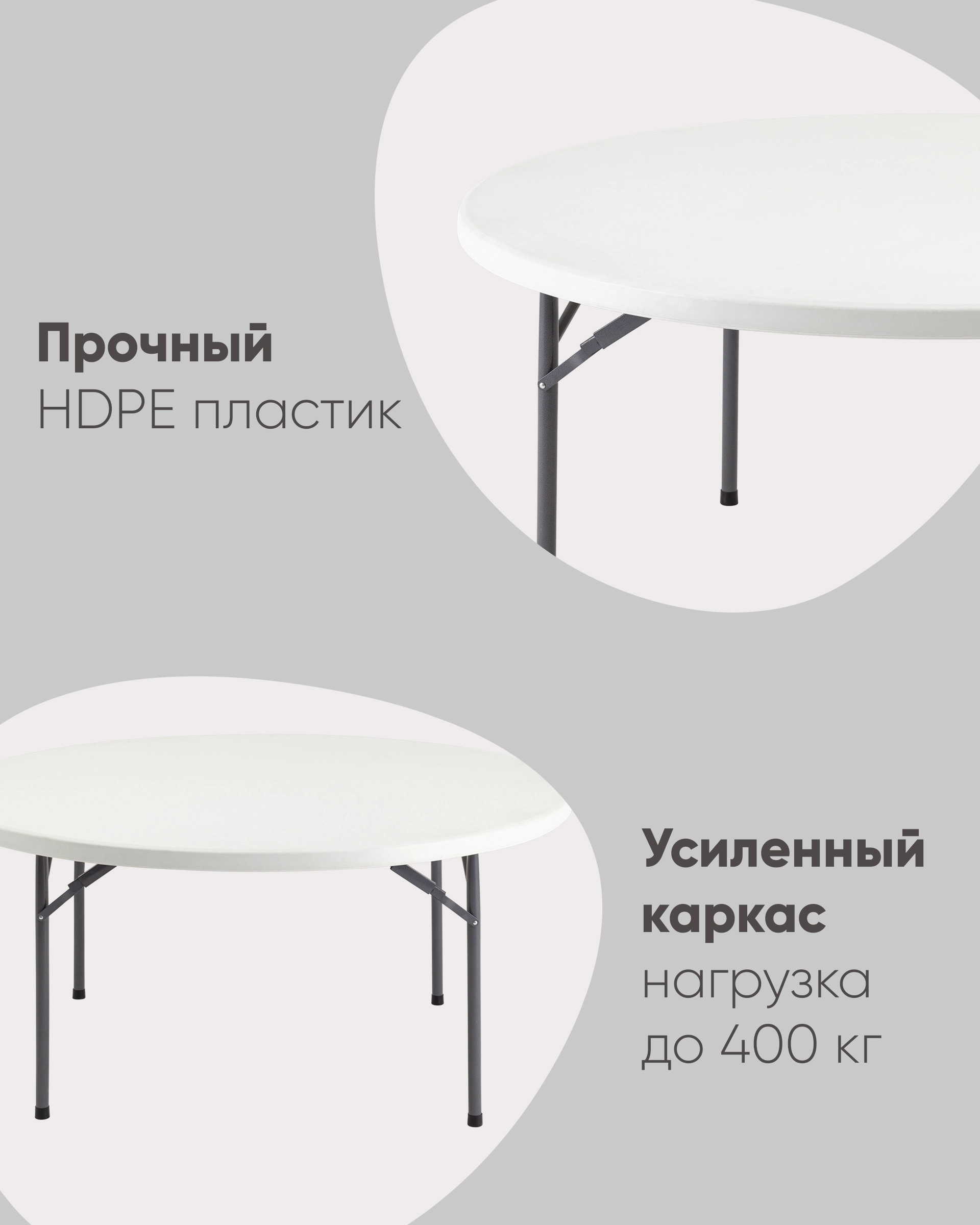 Стол круглый, 160*74 см. Для каркаса используется стальная труба особой прочности 32*1 мм, а столешница, толщиной 5 см, выполнена из 100% не переработанного полиэтилена HDPE (полиэтилен высокой плотности). Считается одним из более безопасных видов пластика. HDPE пластик выдерживает высокие нагрузки, не трескается при ударной нагрузке, эластичен в диапазоне температур от –70 до +100 °С.