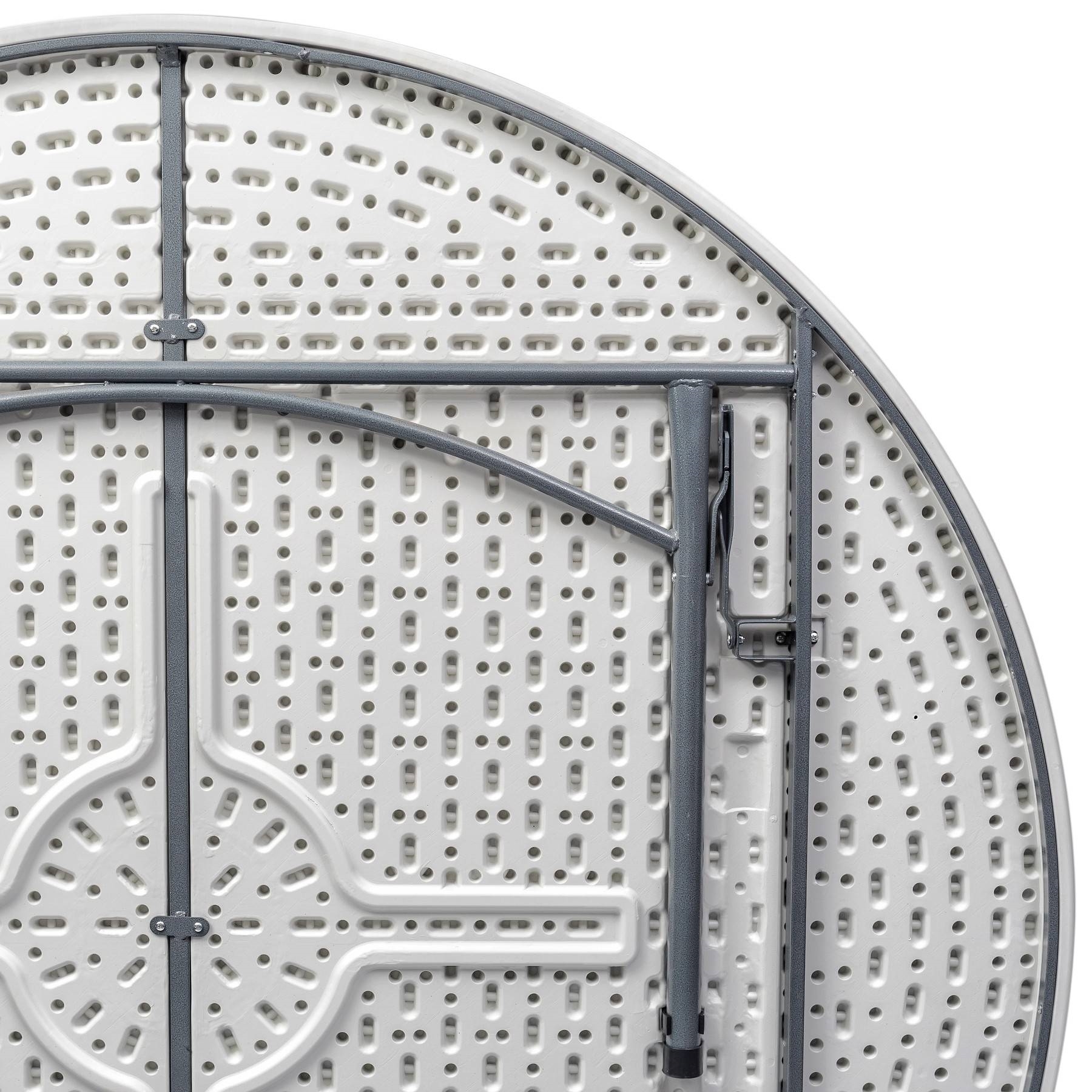 Стол круглый, 180*74 см. Для каркаса используется стальная труба особой прочности 32*1 мм, а столешница, толщиной 5 см, выполнена из 100% не переработанного полиэтилена HDPE (полиэтилен высокой плотности). Считается одним из более безопасных видов пластика. HDPE пластик выдерживает высокие нагрузки, не трескается при ударной нагрузке, эластичен в диапазоне температур от –70 до +100 °С.