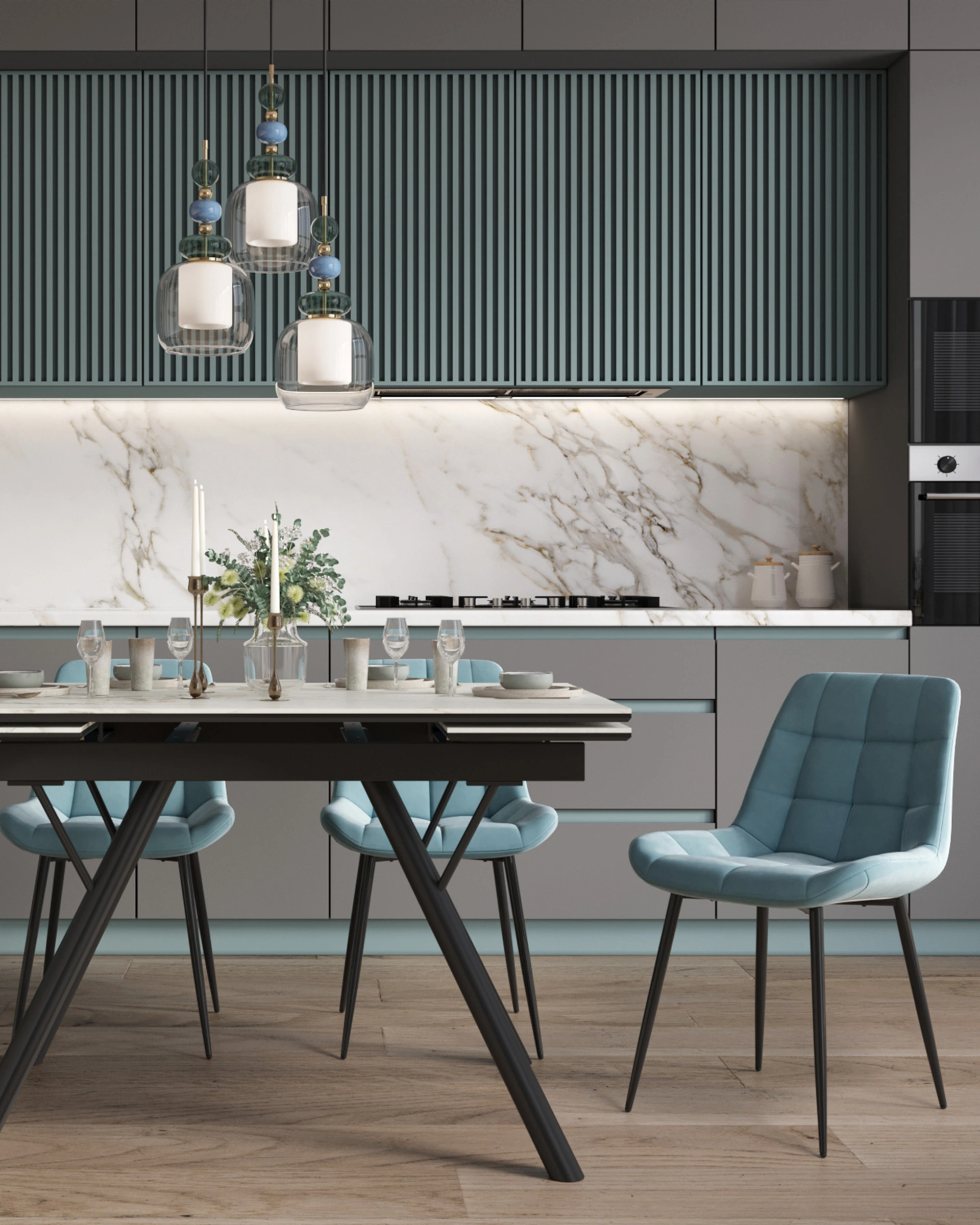 Стол обеденный раскладнойЛибертикавпечатляет своей стильной эстетикой и продуманными деталями. Белая керамическая столешница украшена утончённым мраморным рисунком с мягкими серыми и бежевыми прожилками, придающими интерьеру светлый и изысканный акцент. Такая поверхность выглядит дорого и современно, подчёркивая вкус и статус хозяев.