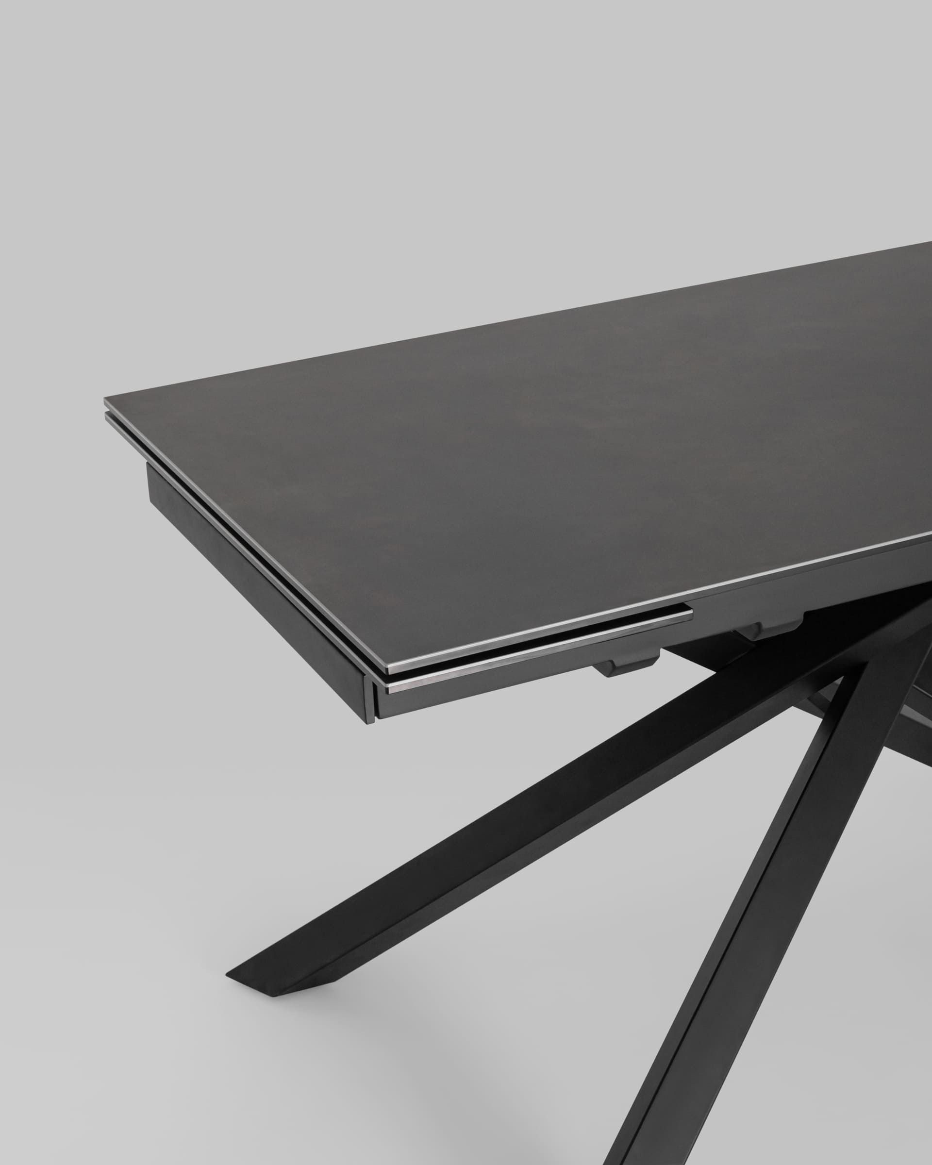 Обеденный стол Альянс с раскладной столешницей. Прямоугольная столешница выполнена из цельной керамики. Материал долговечен, устойчив к термическим и механическим воздействиям. При необходимости длину стола можно увеличить на дополнительные 30 или 60 см за счет спрятанных по бокам раздвижных элементов. Раздвижной механизм прост в использовании и не требует много времени для сборки. Металлические ножки надёжно удерживают всю конструкцию и придают столу оригинальный вид. Обеденный стол Альянс впишется в любой интерьер в современном стиле и станет украшением кухни и обеденной зоны.