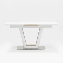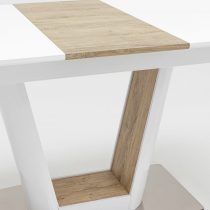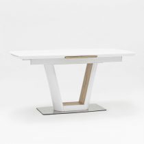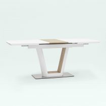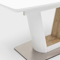 Столешница выполнена из прочного и долговечного МДФ. Столешница и ножка стола выполнены в едином стиле, светлая глянцевая поверхность идеально сочетается с деревянными вставками. Красивая форма стола позволит легко вписать его в современный интерьер, стол украсит кухню, гостиную или современное кафе, ресторан.