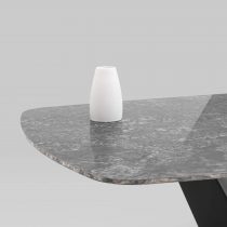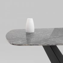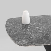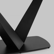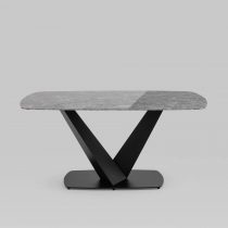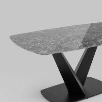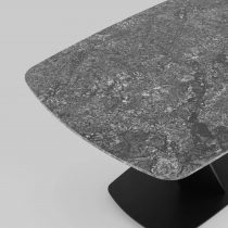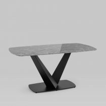 Столешница сочетает в себе прочную керамику, покрытую слоем закалённого стекла для практичности и стиля. Материалы устойчивы к перепадам температуры, к чрезмерной влаге, любые загрязнения легко устранить. Поверхность повторяет рисунок изысканного мрамора, излучая комфорт и спокойствие. Металлический каркас черного матового цвета из двух объёмных балок образуют простую и надежную конструкцию. Роскошное сочетание цветов позволяет подобрать к столу любые комплекты стульев в современном стиле.