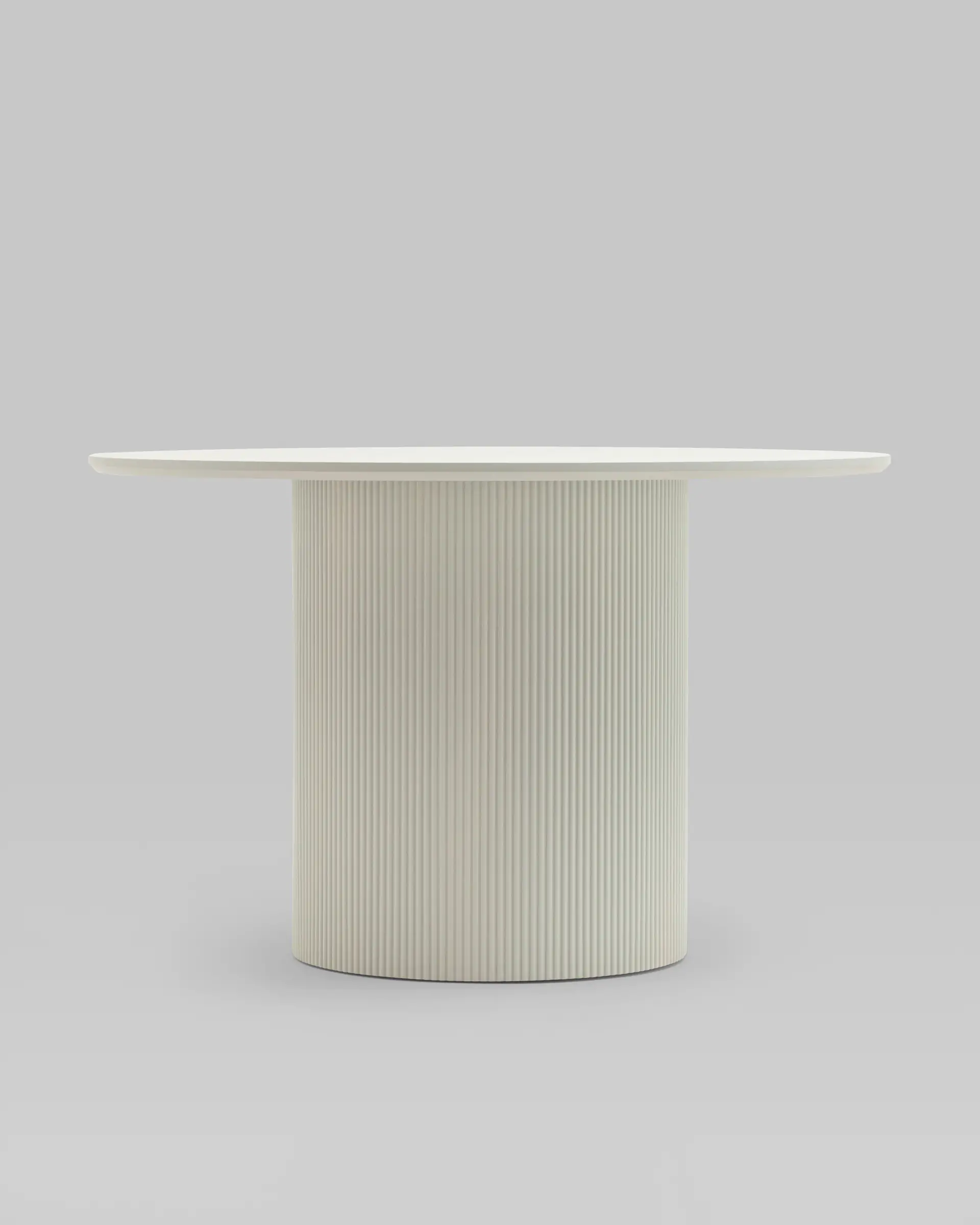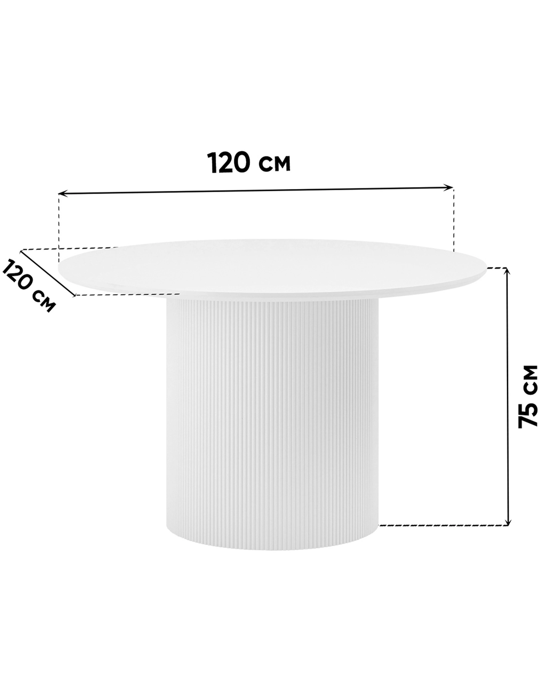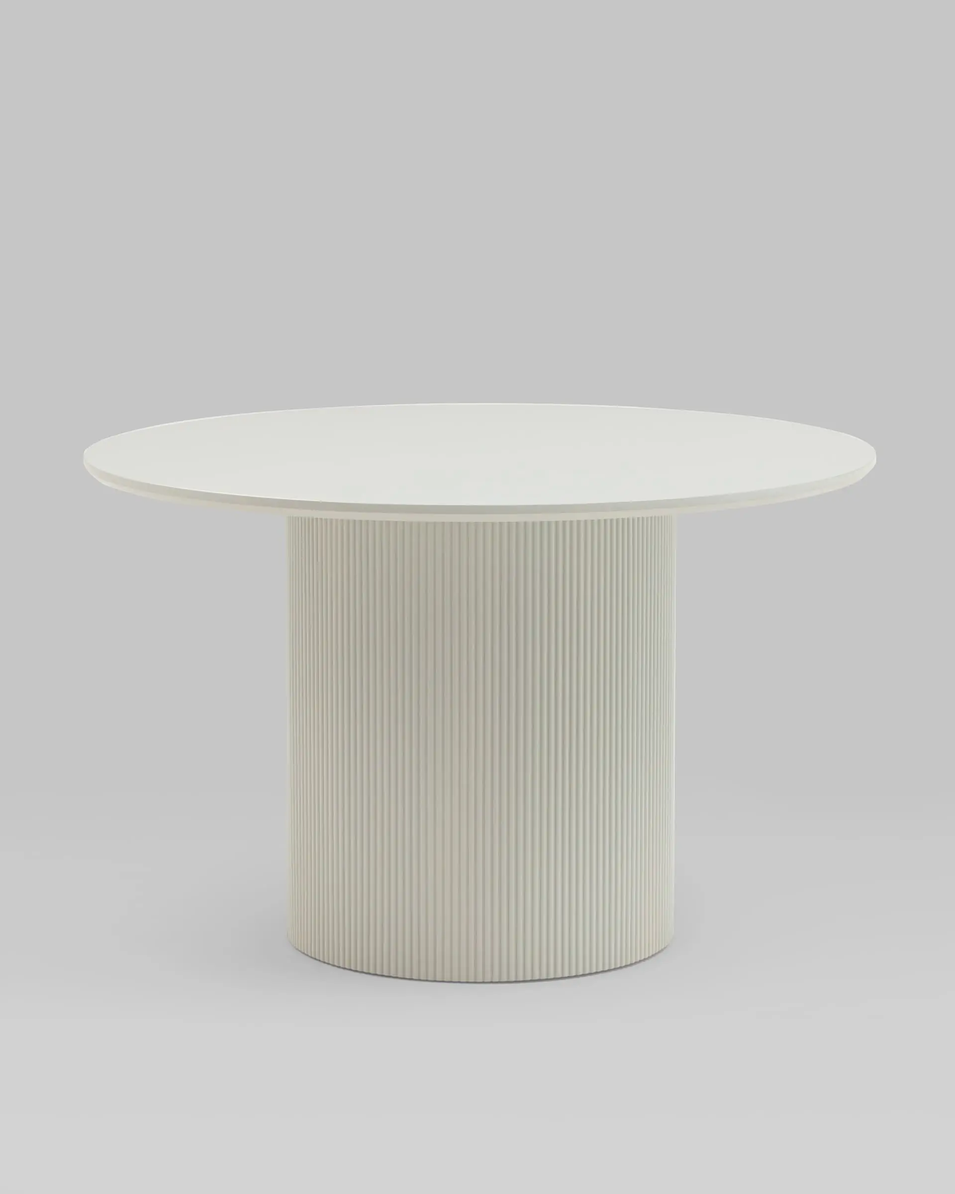 Столешница выполнена из прочного и долговечного МДФ. Светлая поверхность столешницы гармонично сочетается с массивной основой серого цвета. Простая круглая форма стола позволит легко вписать его в современный интерьер, стол украсит кухню, гостиную или современное кафе, ресторан. Опорное плиссированное основание стола в лаконичном дизайне надёжно удерживает всю конструкцию и дополняет монолитный образ.