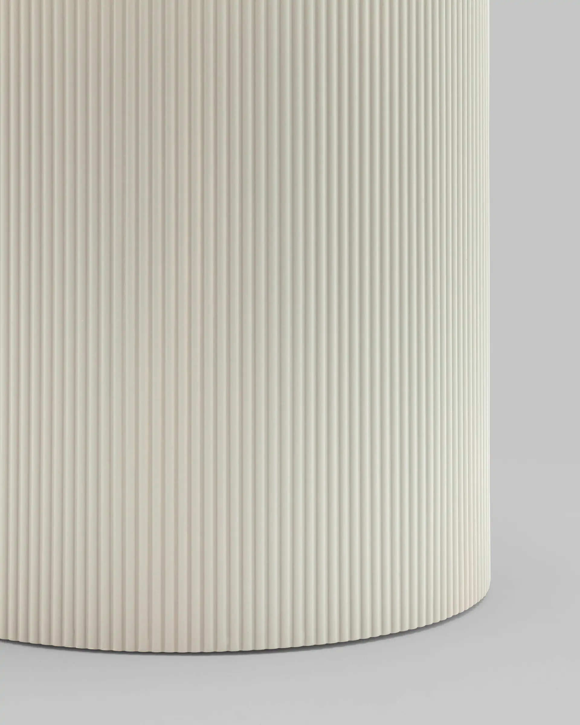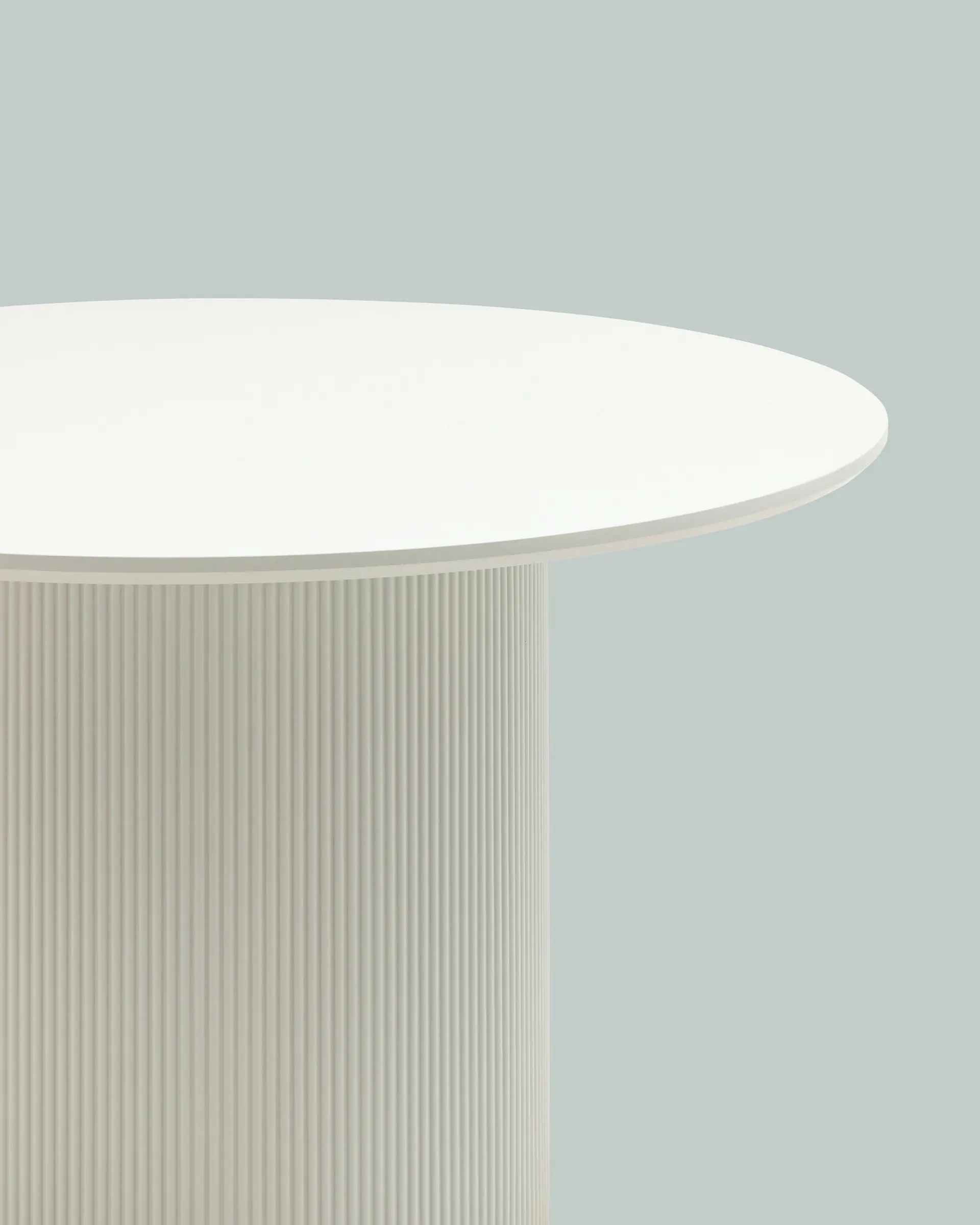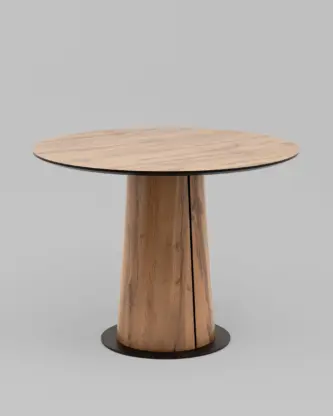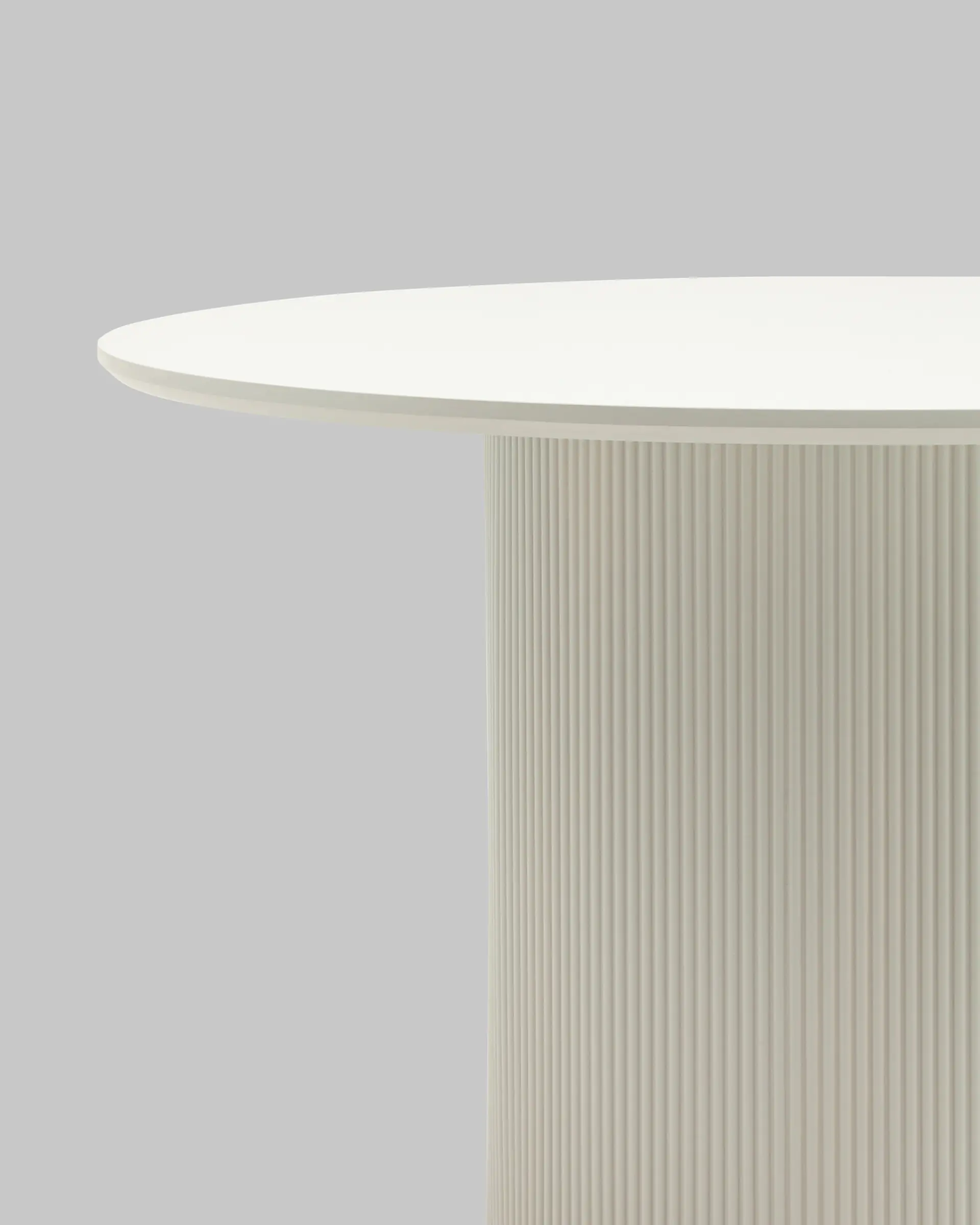 Столешница выполнена из прочного и долговечного МДФ. Светлая поверхность столешницы гармонично сочетается с массивной основой серого цвета. Простая круглая форма стола позволит легко вписать его в современный интерьер, стол украсит кухню, гостиную или современное кафе, ресторан. Опорное плиссированное основание стола в лаконичном дизайне надёжно удерживает всю конструкцию и дополняет монолитный образ.