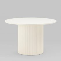 Столешница выполнена из прочного и долговечного МДФ. Светлая поверхность столешницы гармонично сочетается с массивной основой серого цвета. Простая круглая форма стола позволит легко вписать его в современный интерьер, стол украсит кухню, гостиную или современное кафе, ресторан. Опорное плиссированное основание стола в лаконичном дизайне надёжно удерживает всю конструкцию и дополняет монолитный образ.