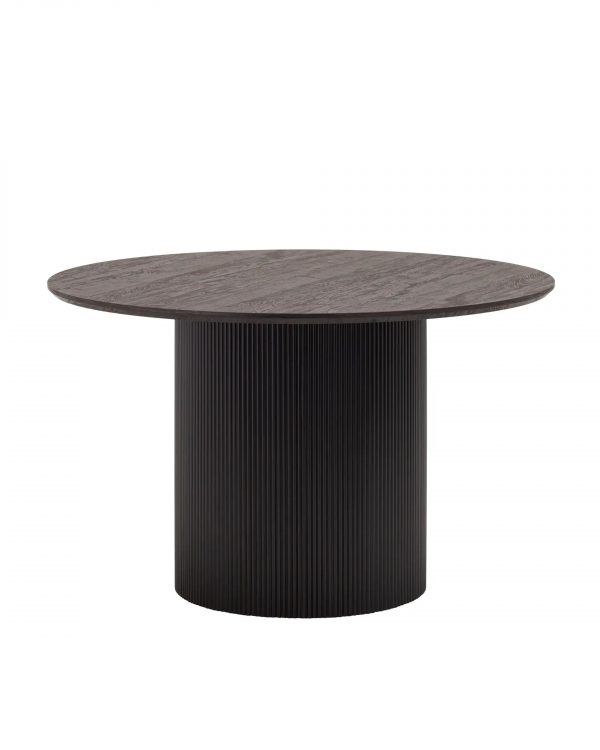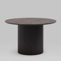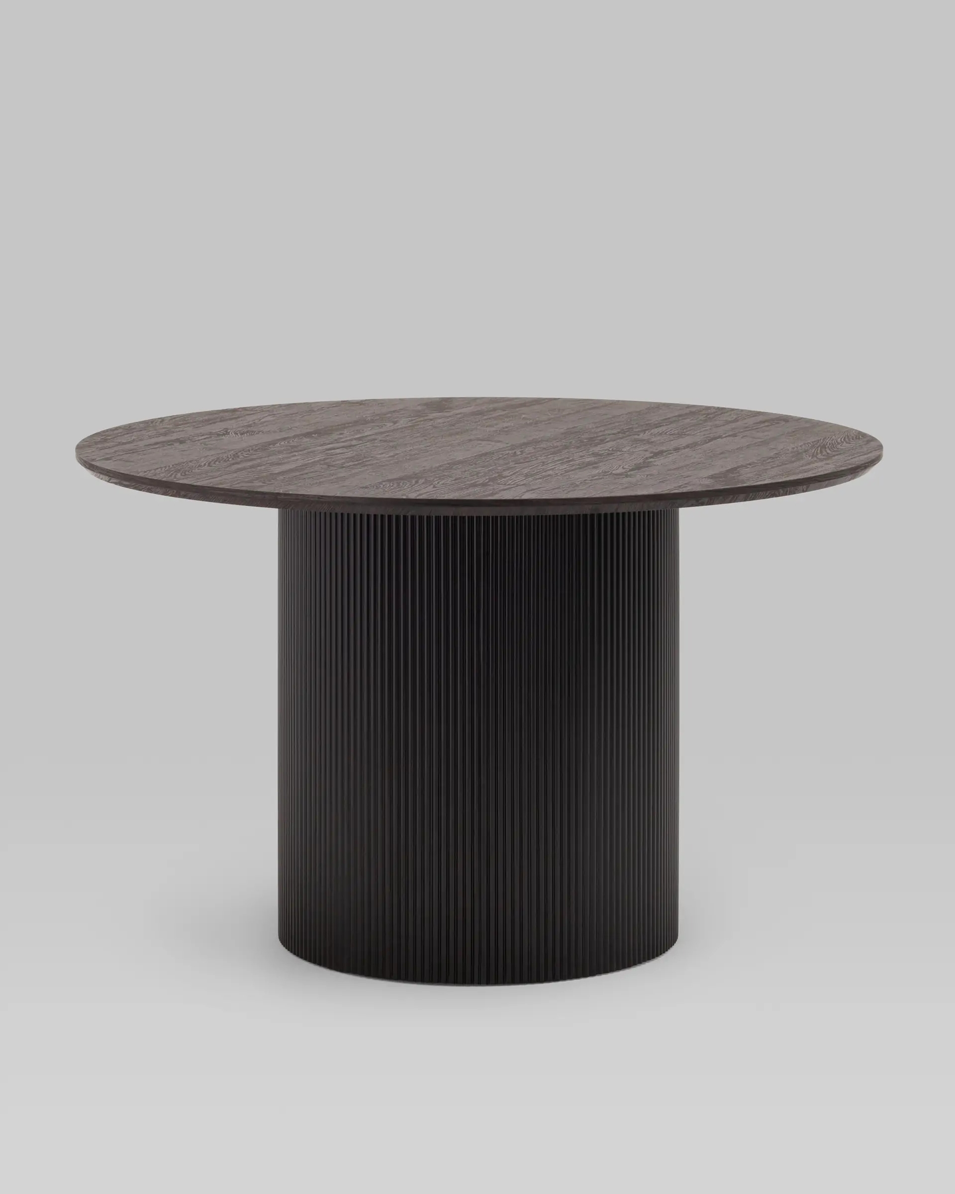 Столешница выполнена из прочного и долговечного МДФ. Столешница под темное дерево гармонично сочетается с массивной основой черного цвета. Простая круглая форма стола позволит легко вписать его в современный интерьер, стол украсит кухню, гостиную или современное кафе, ресторан. Опорное плиссированное основание стола в лаконичном дизайне надёжно удерживает всю конструкцию и дополняет монолитный образ.