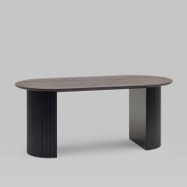 Столешница выполнена из прочного и долговечного МДФ. Темная поверхность столешницы гармонично сочетается с массивными ножками черного цвета. Простая овальная форма стола позволит легко вписать его в современный интерьер, стол украсит кухню, гостиную или современное кафе, ресторан. Опорные плиссированные ножки в лаконичном дизайне надёжно удерживают всю конструкцию и дополняют монолитный образ.