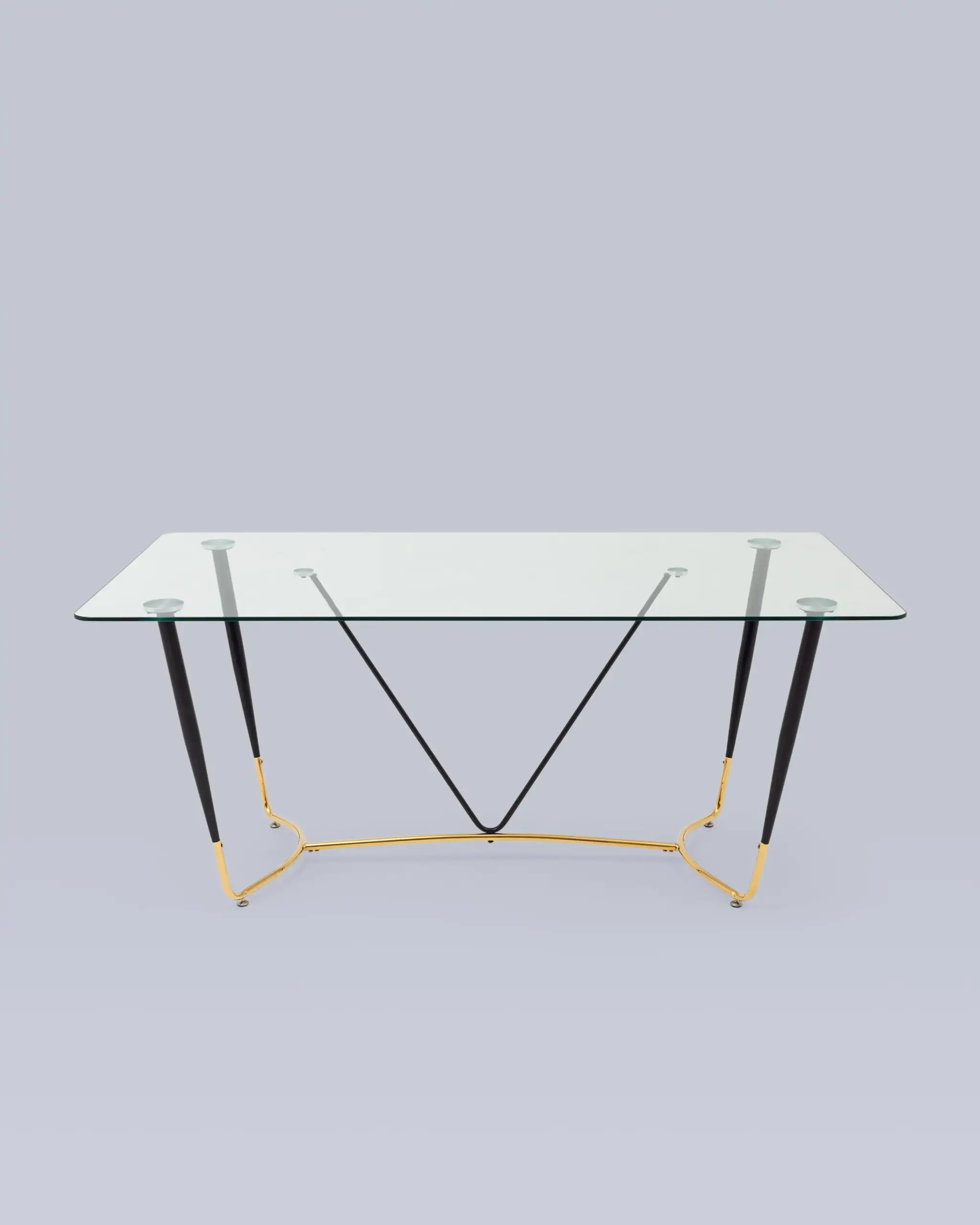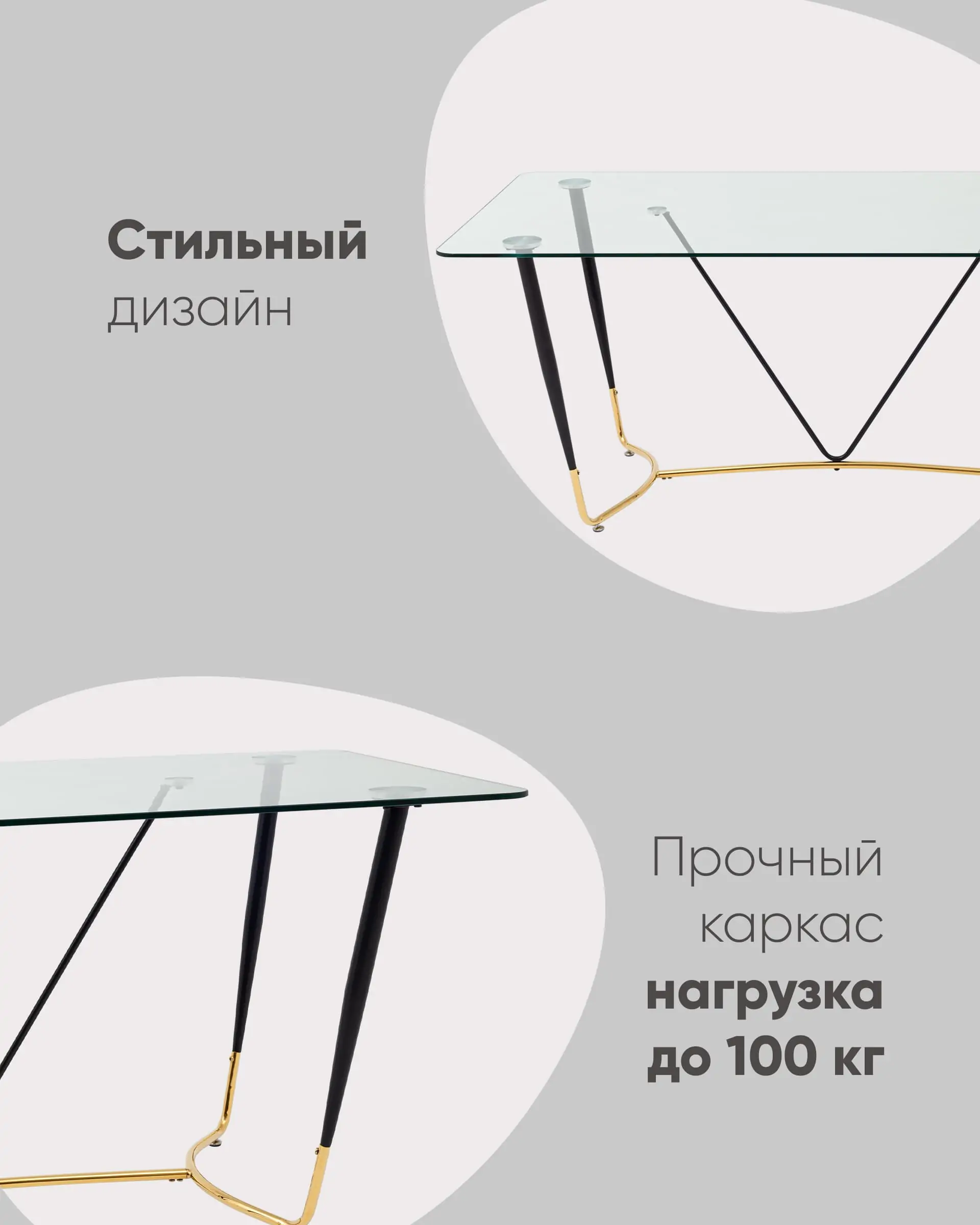Стильный обеденный стол с прозрачной столешницей. Закаленное стекло прочный и экологически чистый материал, простой в уходе и устойчив к любим загрязнениям, идеальный вариант для кухни. Прозрачная столешница с закруглёнными углами придает столу эстетичный внешний вид и легкость. Металлический каркас в черно-золотом цвете прекрасно сочетается со столешницей. Выдерживает нагрузку до 100 кг, основание оснащено подпятниками для предотвращения порчи напольного покрытия. Стол Даймакс дополнит любой современный интерьер кухни или зала.