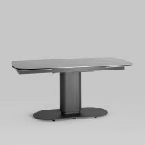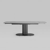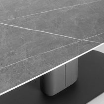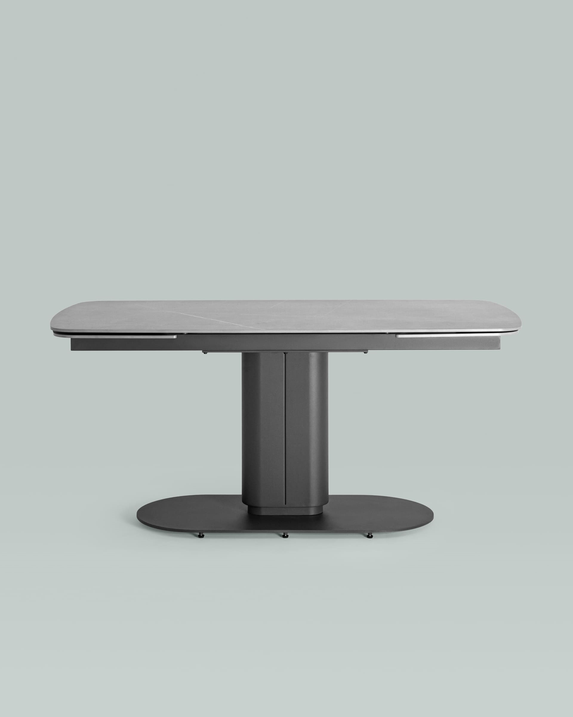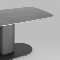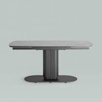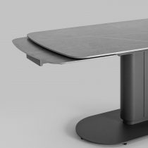 Столешница сделана из керамики – устойчивый, прочный и экологический материал. Закруглённые углы и матовая поверхность придают лёгкость и лаконичный образ. По бокам стола расположены дополнительные раздвижные элементы, которые увеличивают полезную площадь столешницы на 40 или 80 см в длину. Монолитная ножка имеет обтекающие формы и закруглённые углы, повторяя мотив всей конструкции. Основание оснащено защитными заглушками, которые не позволяют металлическим частям соприкасаться с полом и портить покрытие при перемещении.