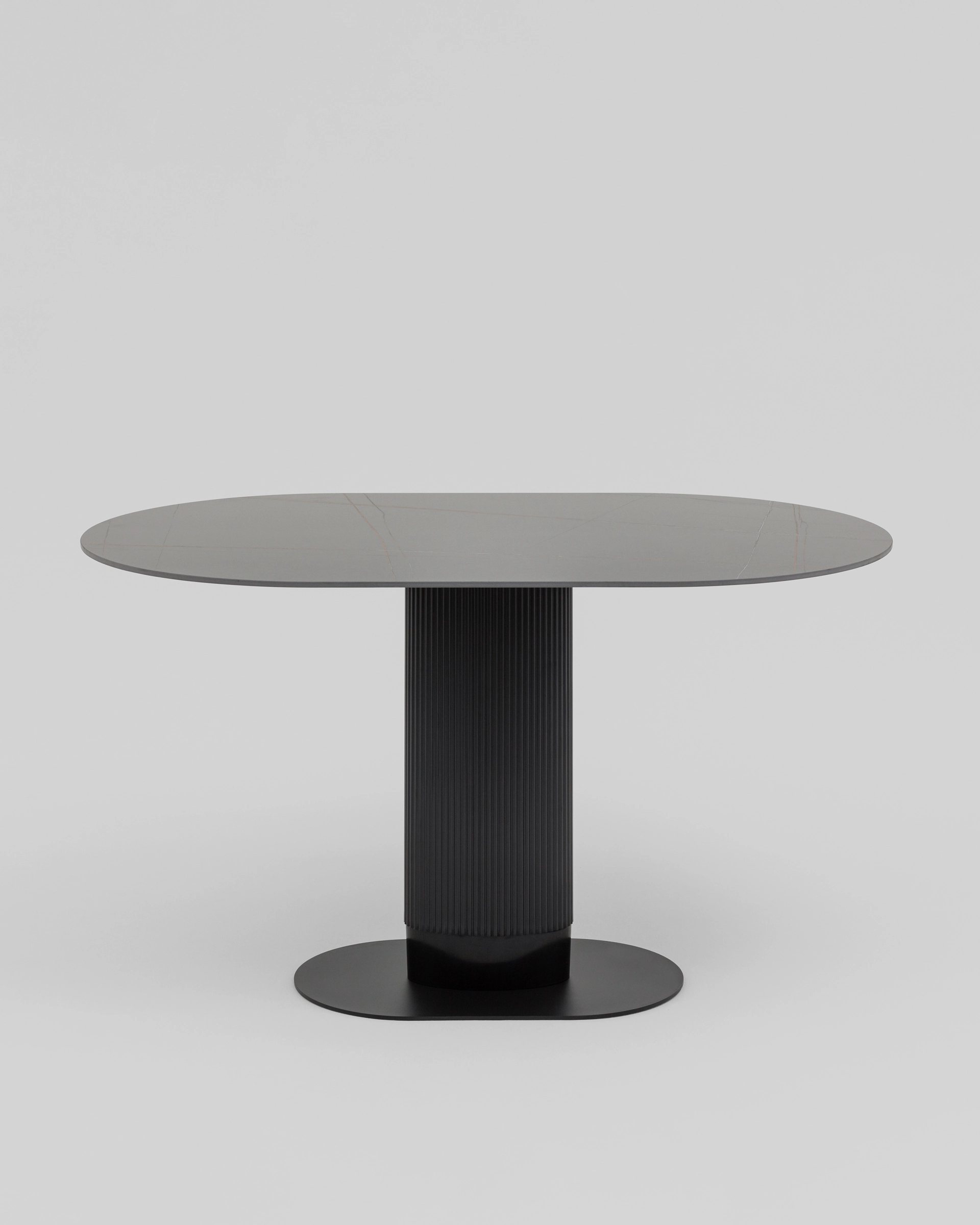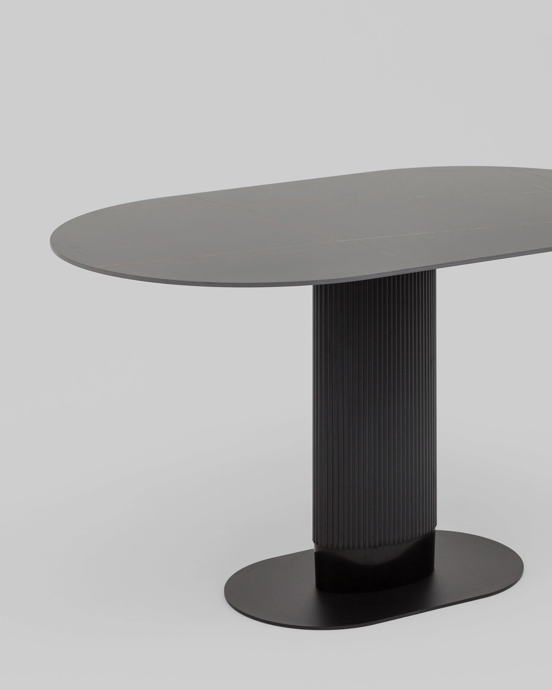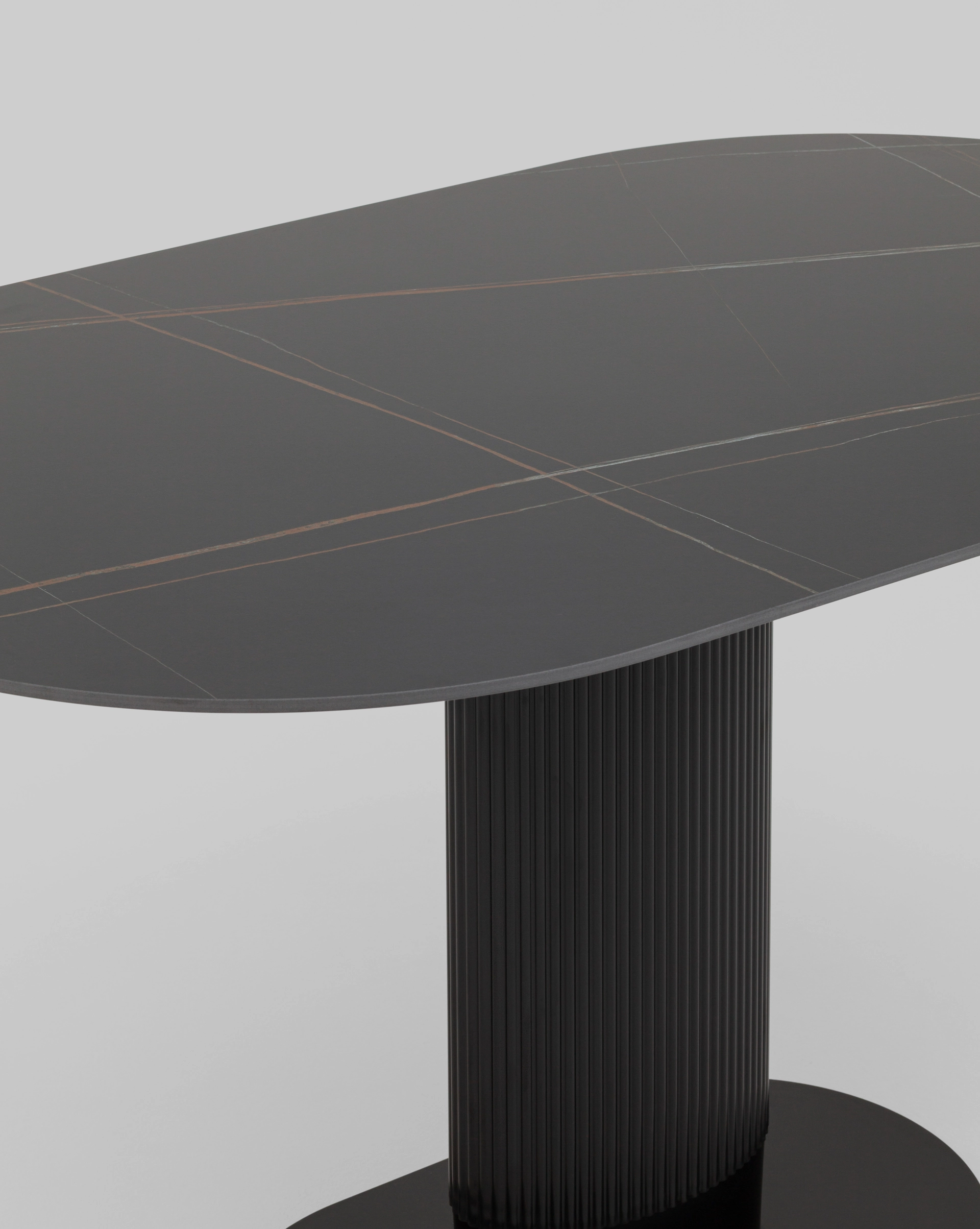 Столешница выполнена из керамики черного цвета, которая знаменита прочностью и долговечностью, поверхность устойчива к различным внешним воздействиям. Опорное плиссированное основание стола в лаконичном дизайне надежно удерживает всю конструкцию и дополняет монолитный образ.