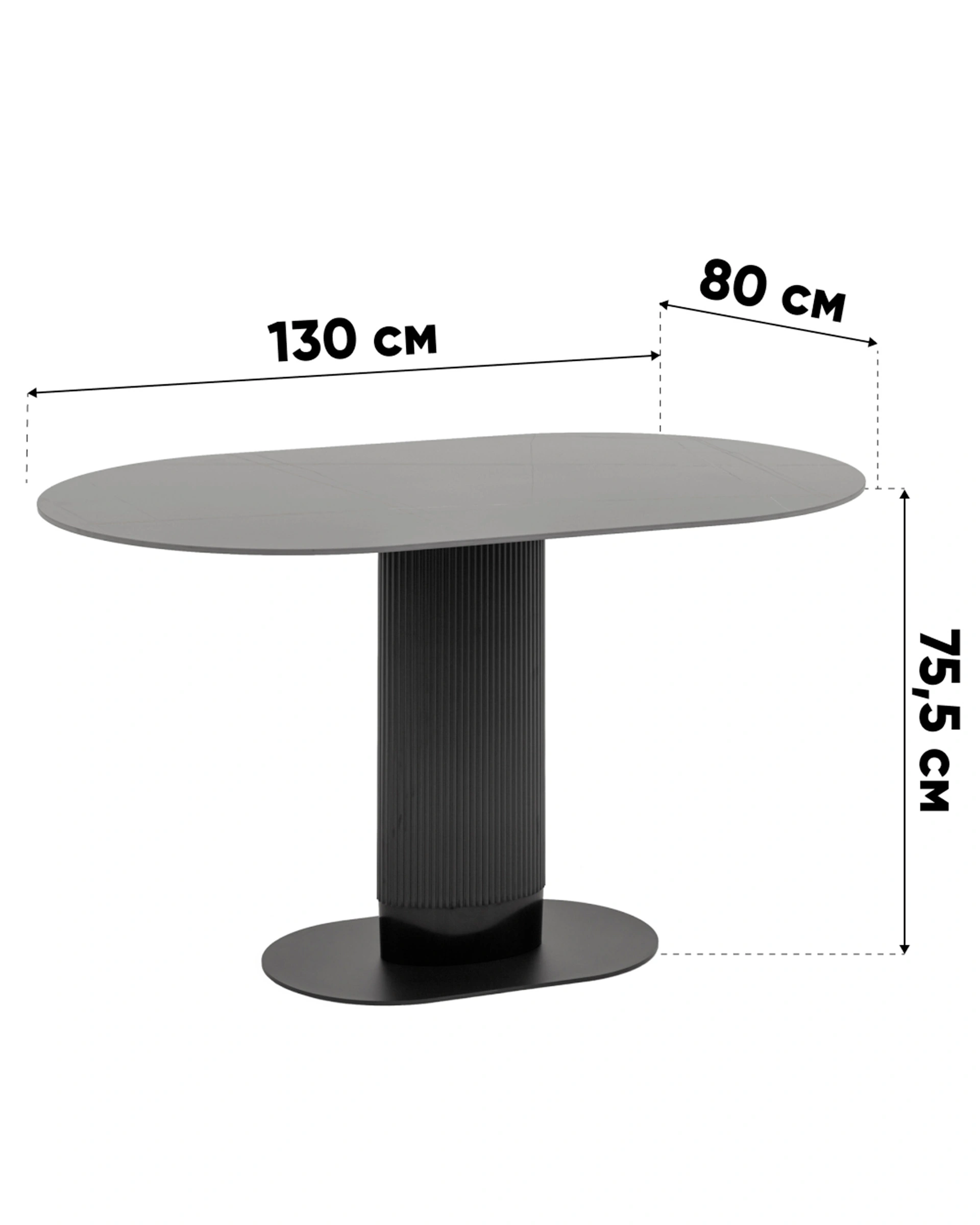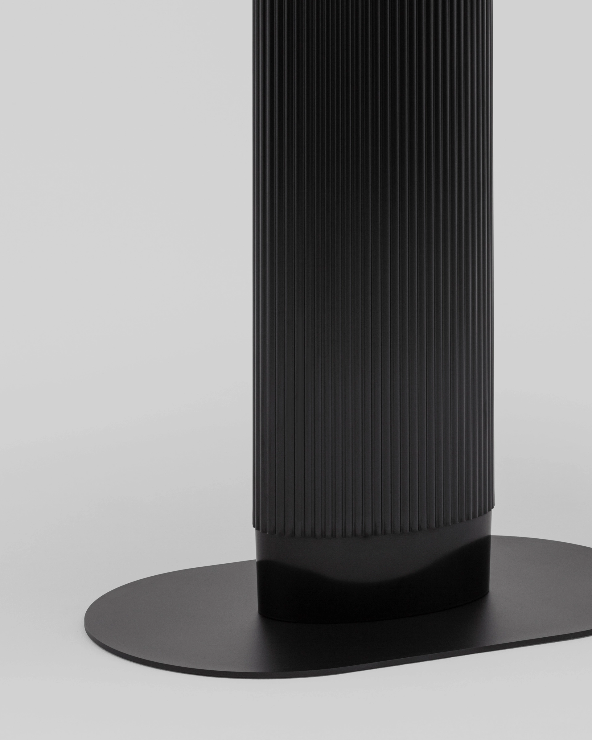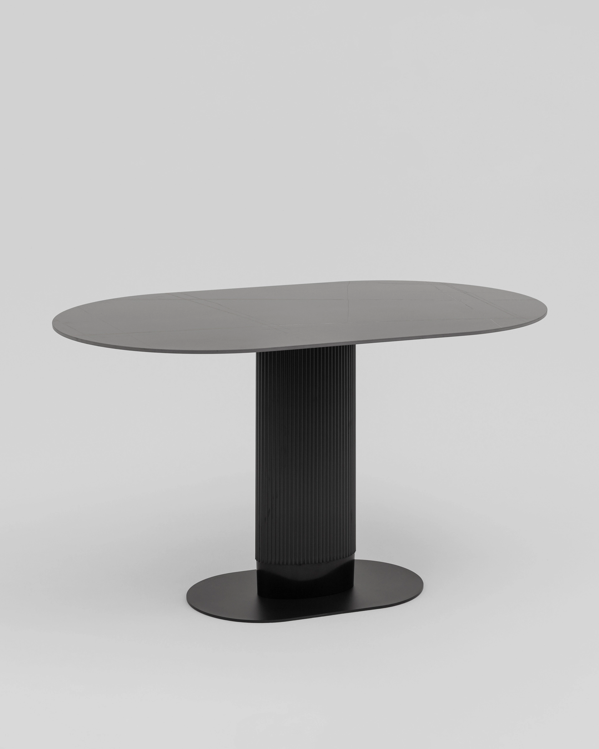 Столешница выполнена из керамики черного цвета, которая знаменита прочностью и долговечностью, поверхность устойчива к различным внешним воздействиям. Опорное плиссированное основание стола в лаконичном дизайне надежно удерживает всю конструкцию и дополняет монолитный образ.