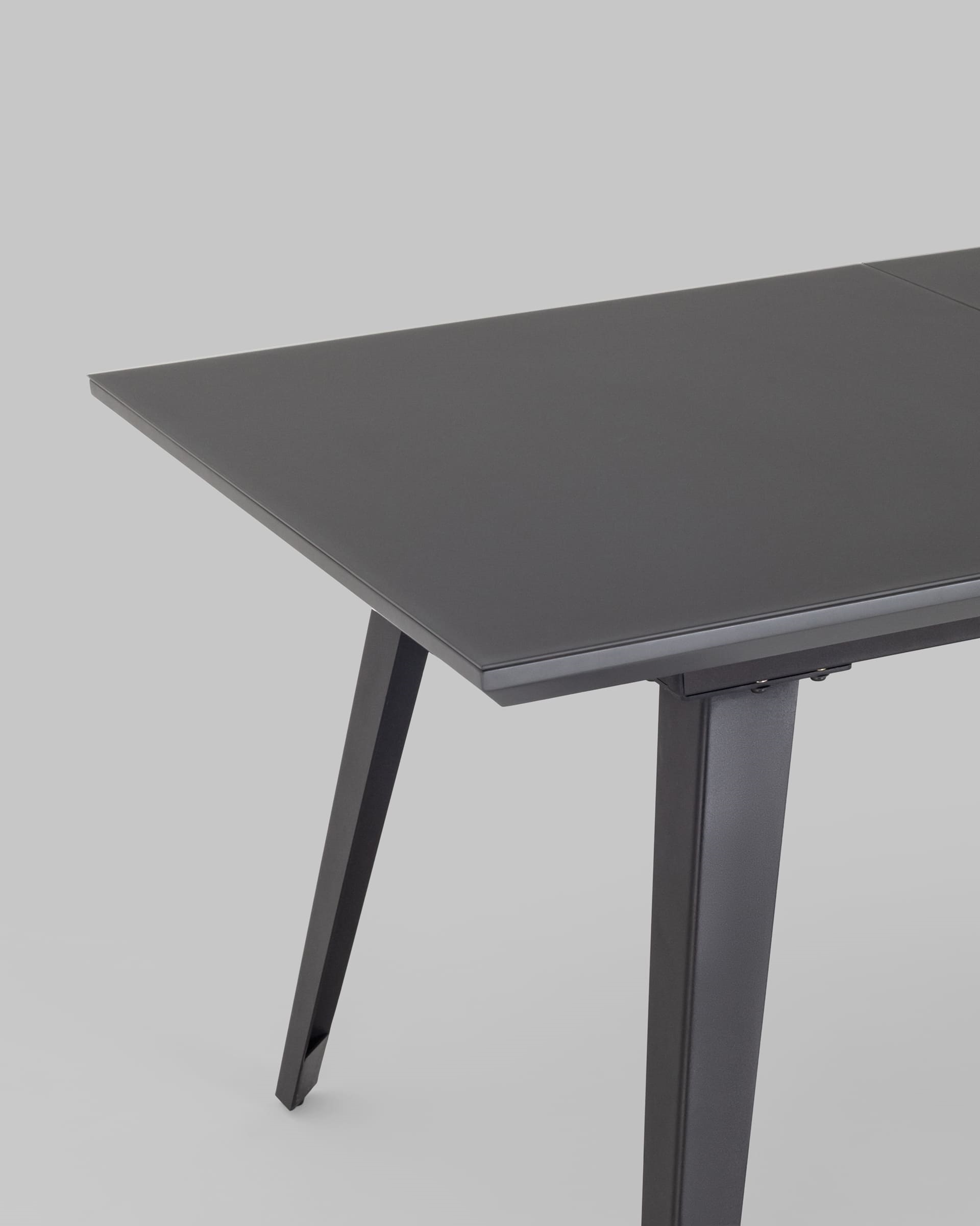 Столешница выполнена из стекла, прикрепленной к основе из МДФ, в сером оттенке. Ножки изготовлены из металла, покрытого порошковой краской в тон столешнице.