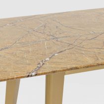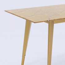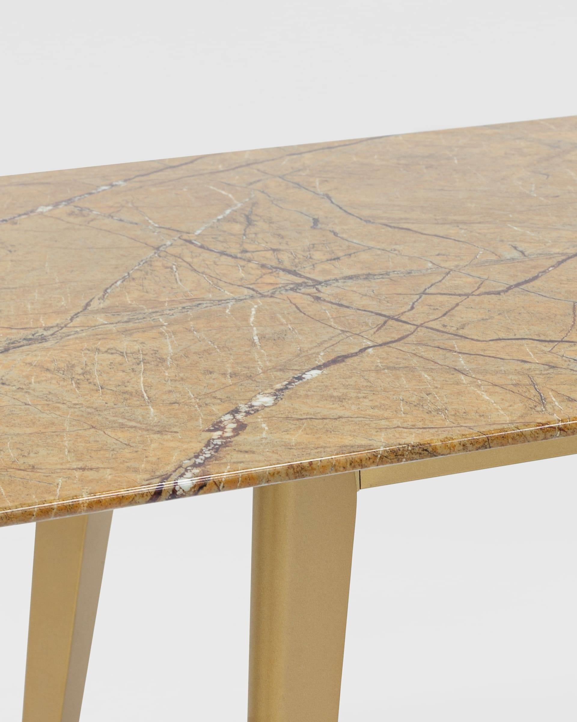 Обеденный стол с красивой стеклянной столешницей насыщенного цвета охры с рисунком под мрамор.