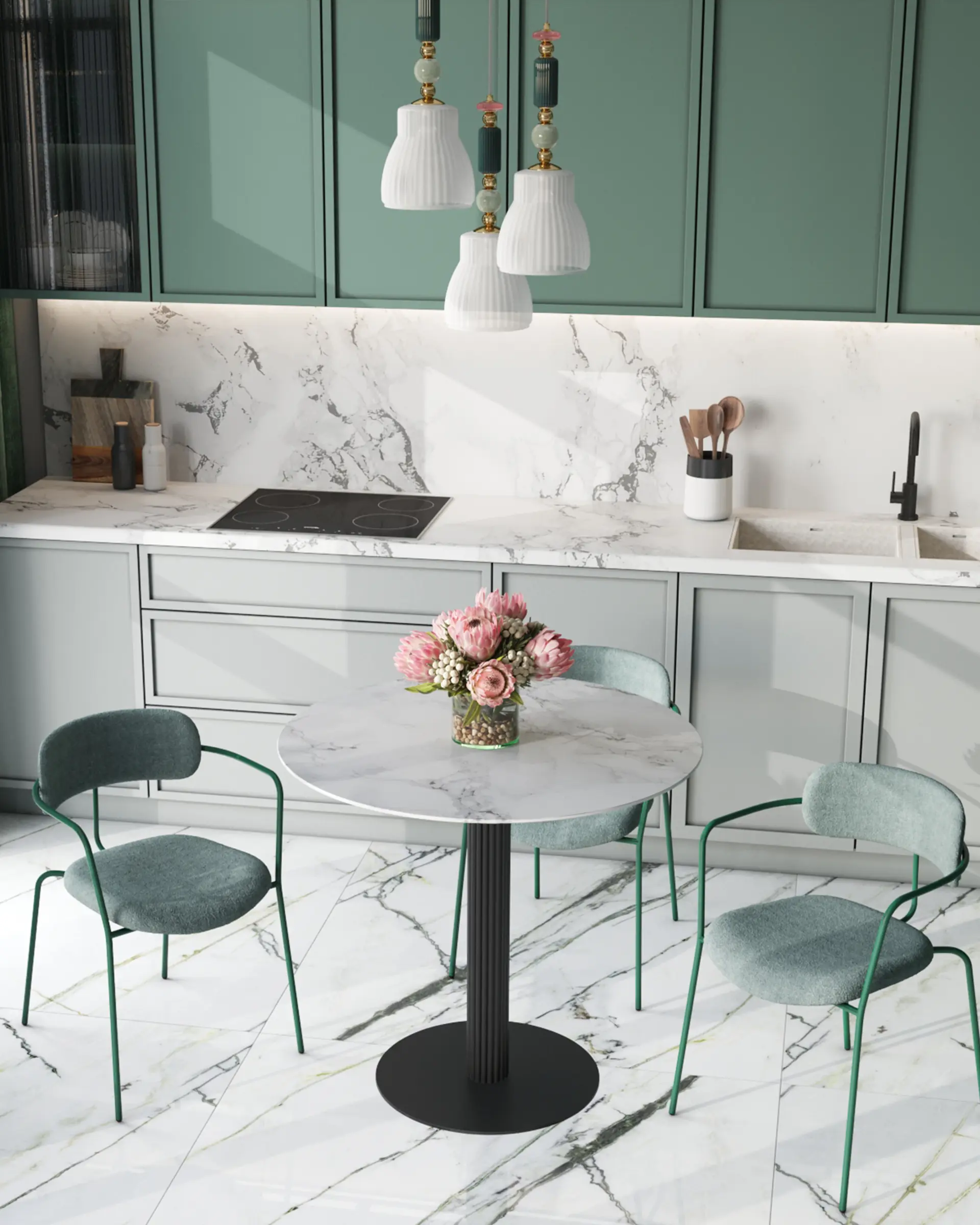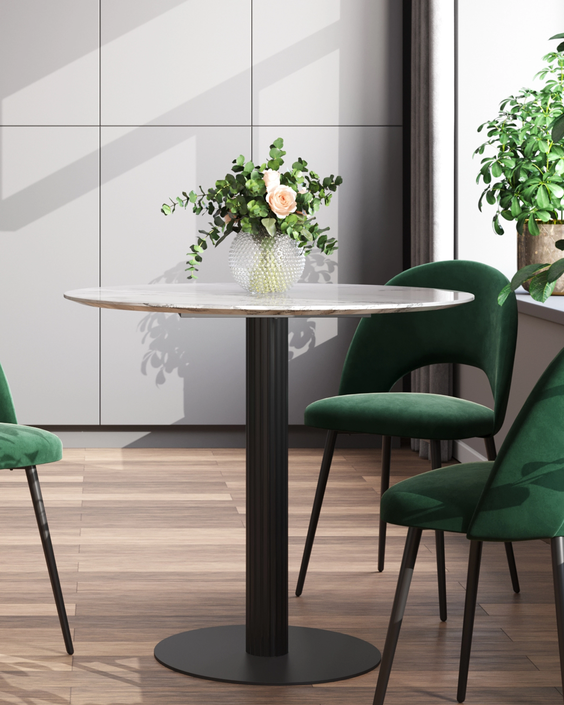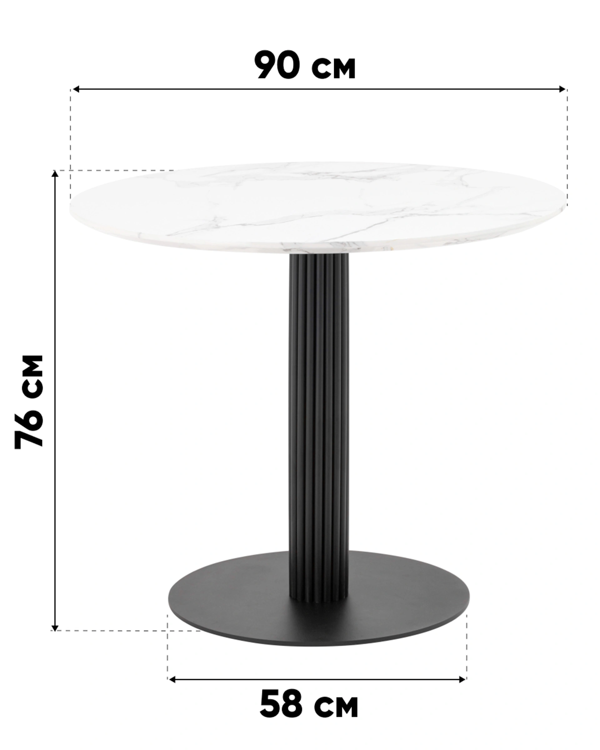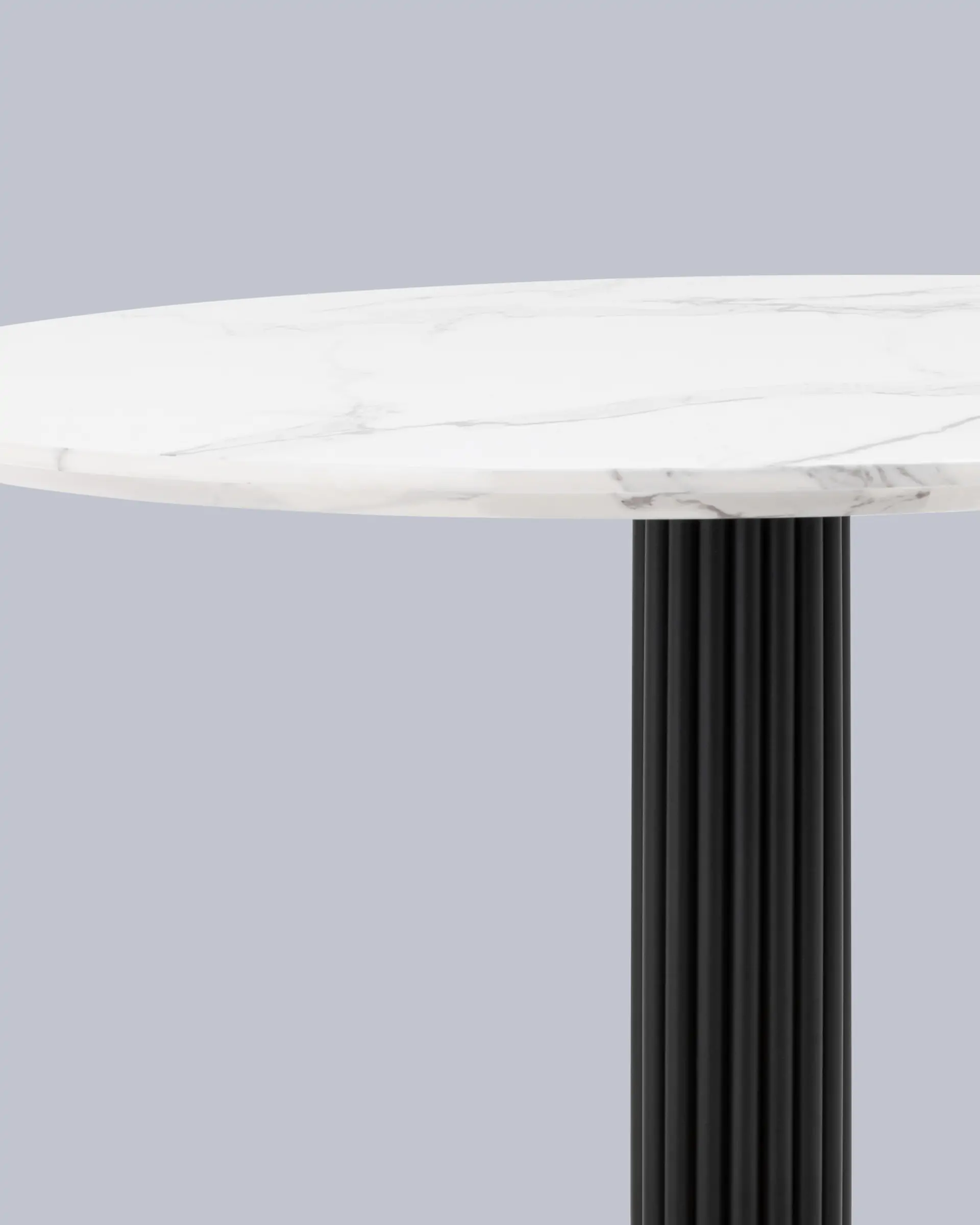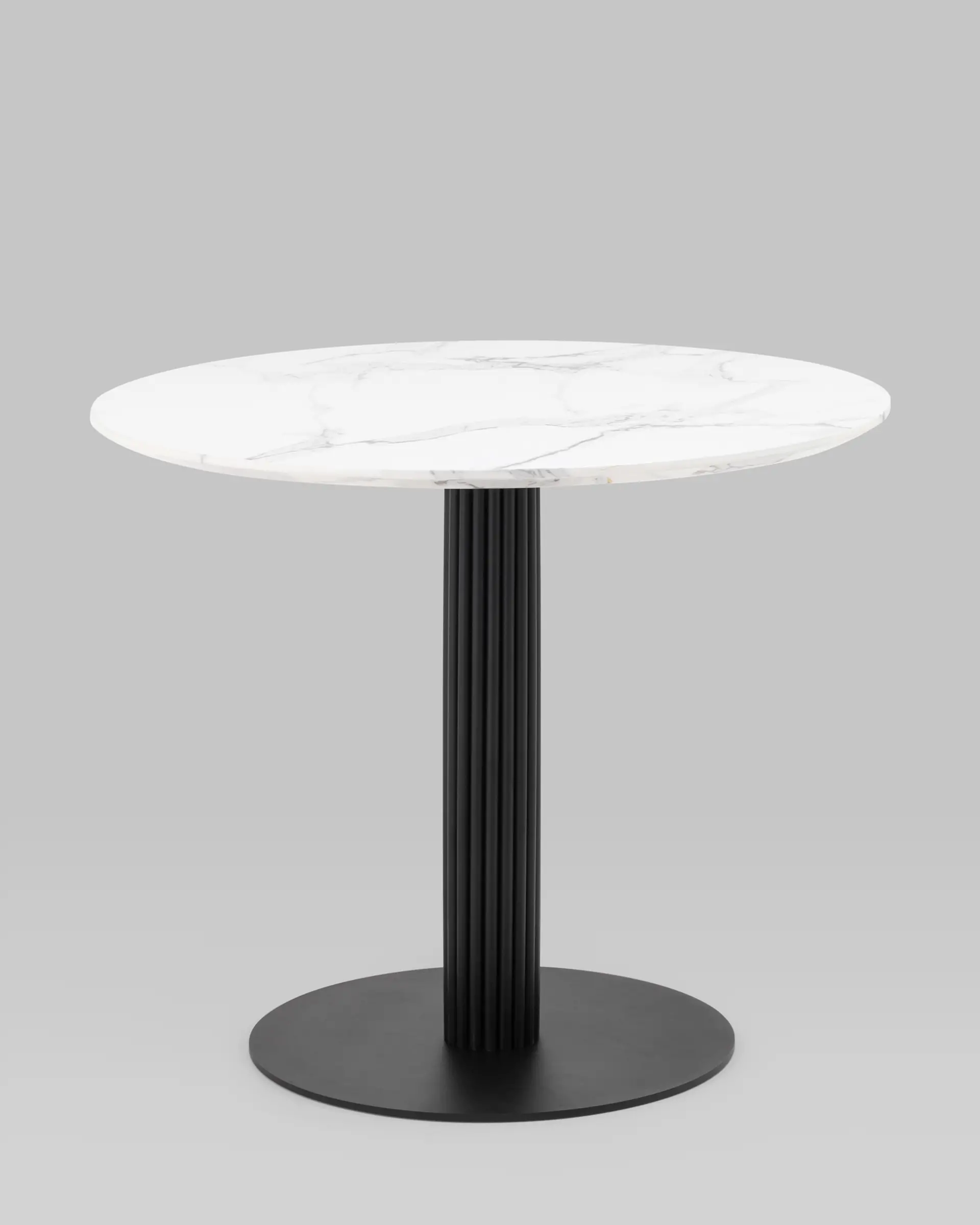 Стильный стол с металлическим плиссе основанием. Круглая столешница с рисунком белого мрамора выполнена из МДФ – прочного, экологически безопасного материала, который устойчив к перепадам температур и повышенной влажности. Поверхность столешницы декорирована рисунком белого мрамора, который идеально сочетается с металлическим основанием в черном цвете. Диаметр столешницы 90 см.