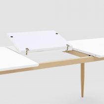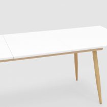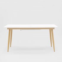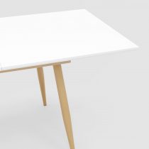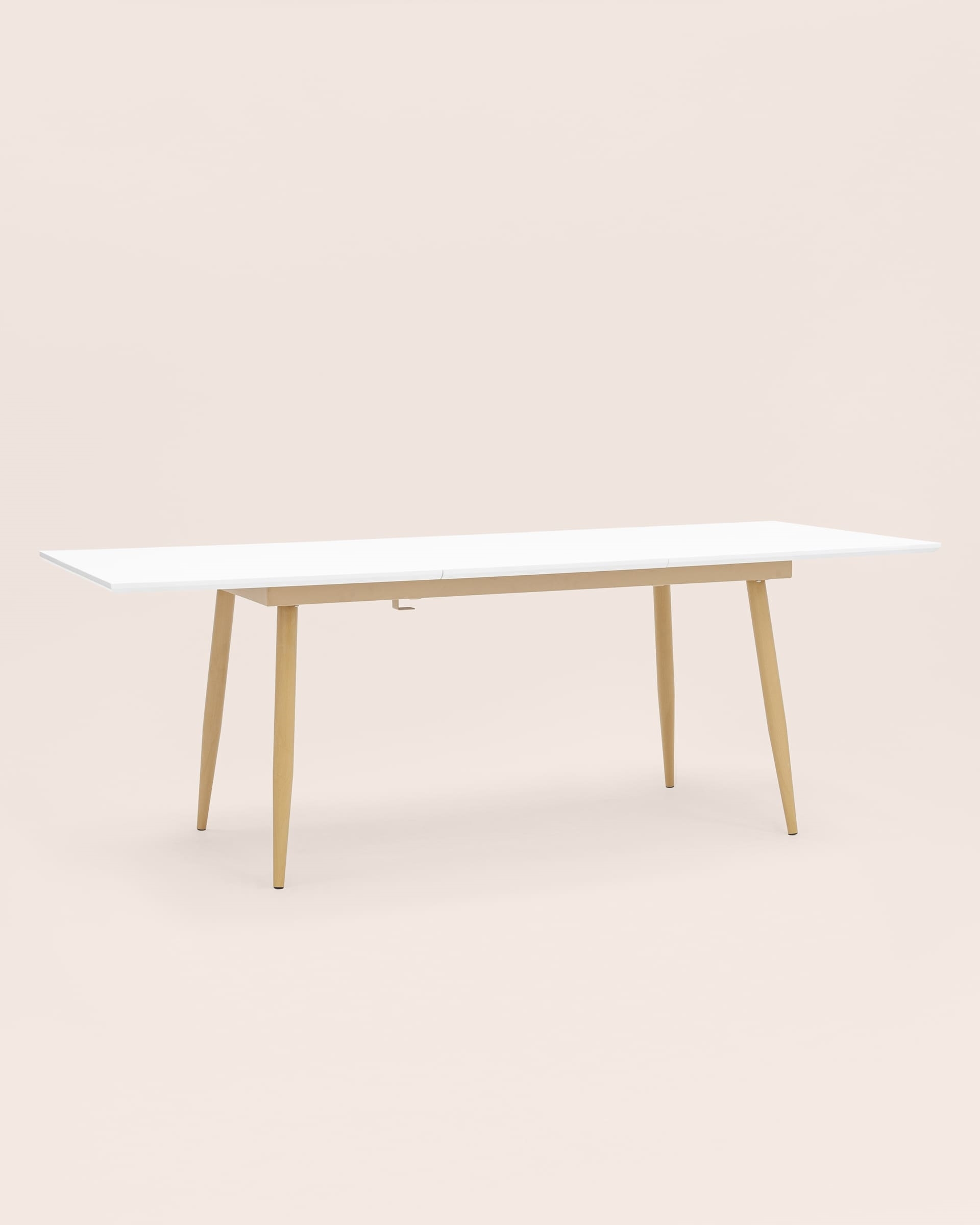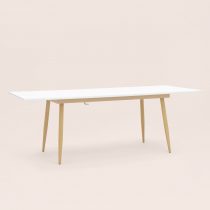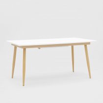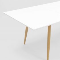 Обеденный стол с прямоугольной столешницей. Цвет столешницы белый. Ножки металлические, покрашены в цвет светлого дерева.