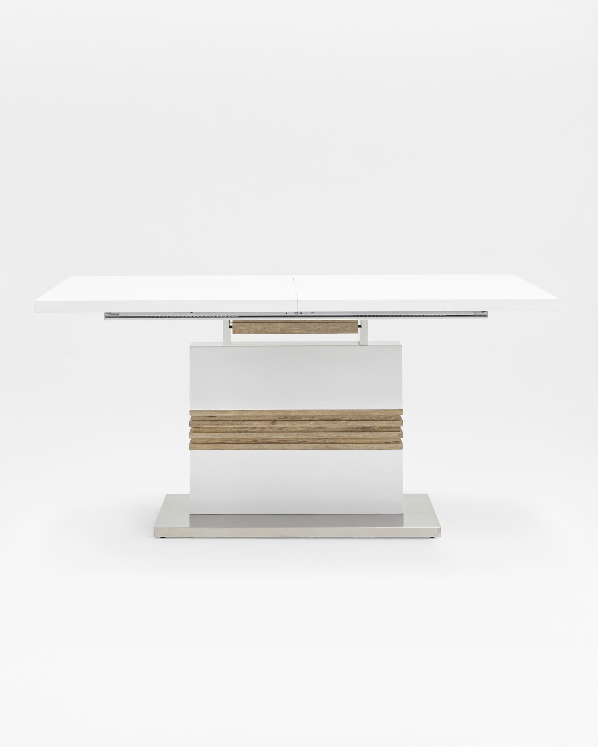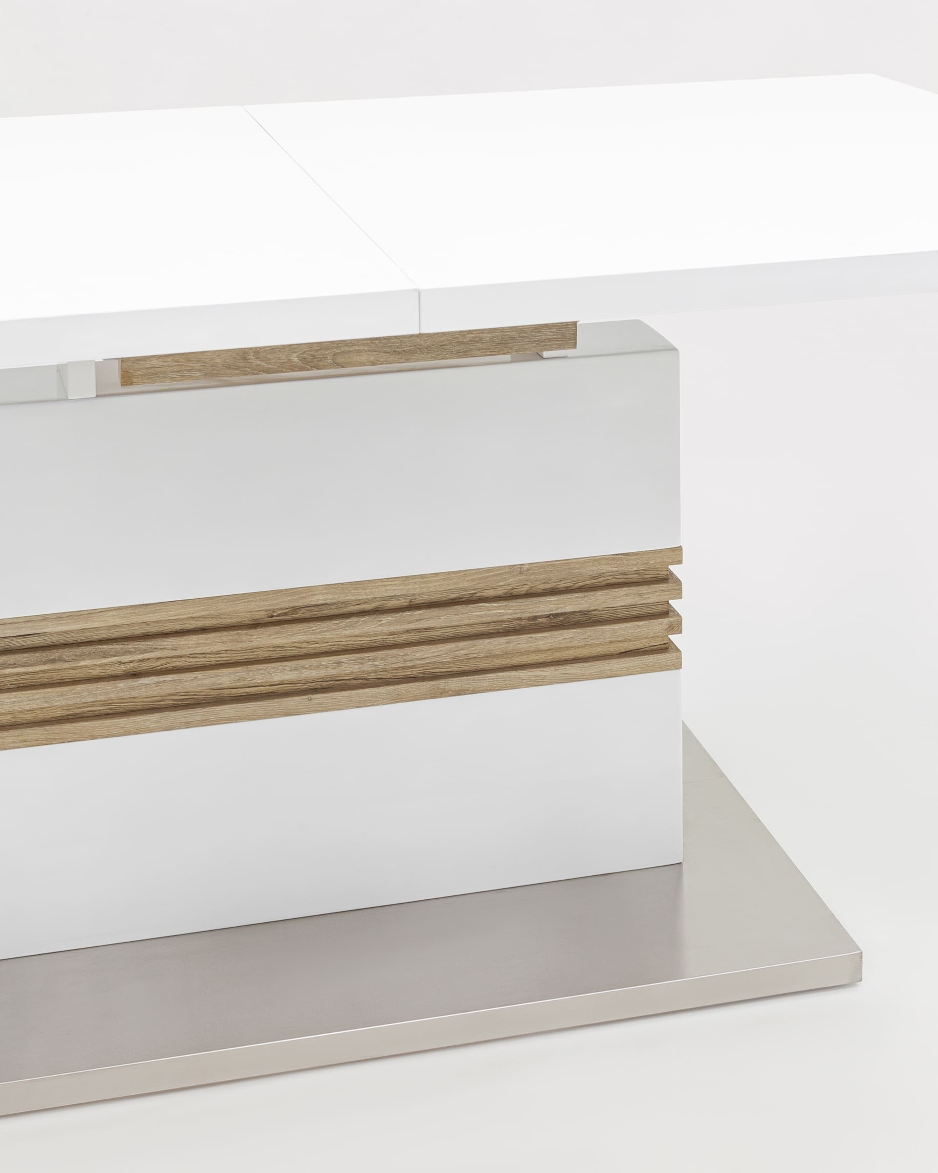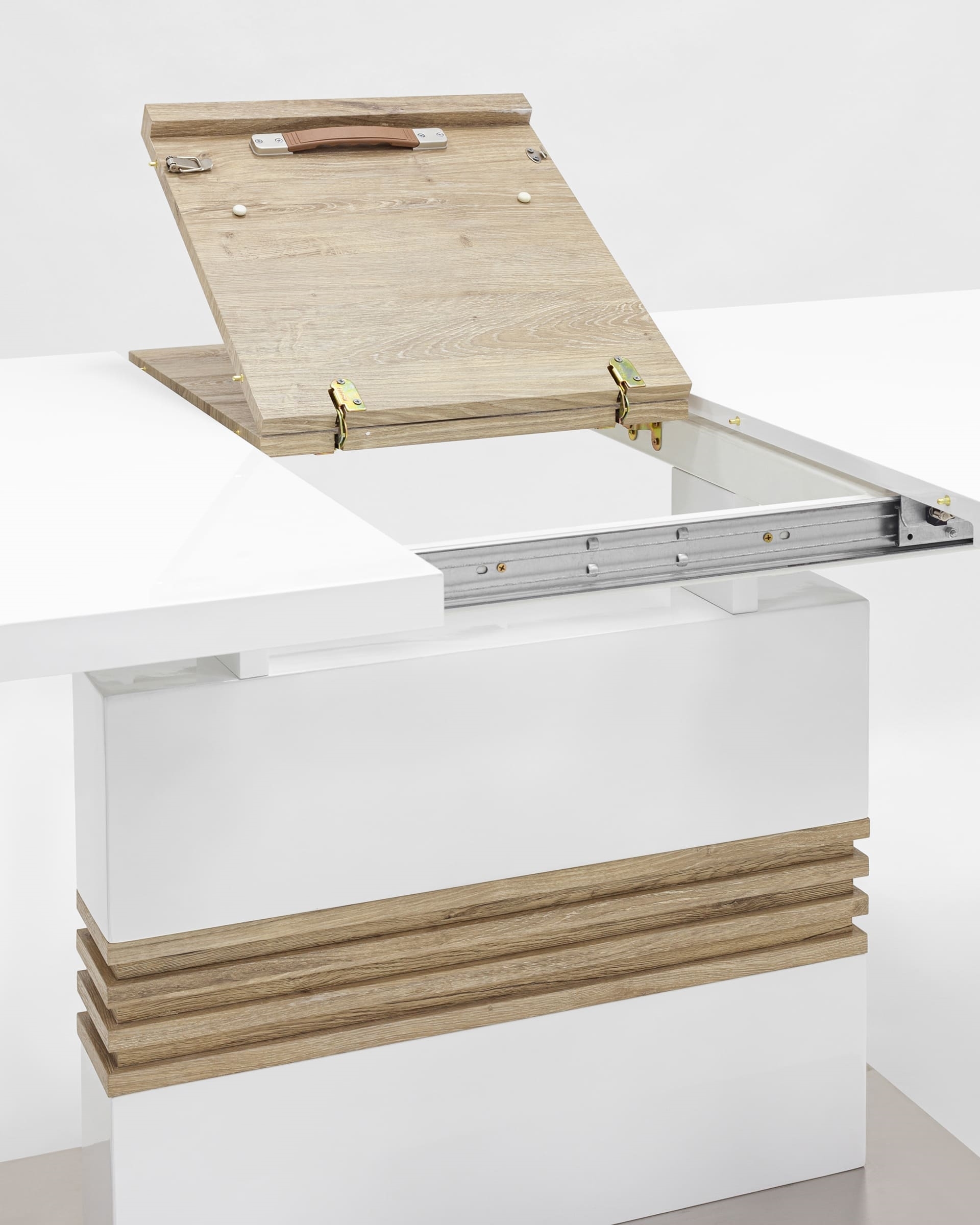 Дополнительная вкладка стола выполнена из МДФ с бумажным шпоном цвета беленого дуба. На вкладке предусмотрена петля для комфортного открытия стола одной рукой.