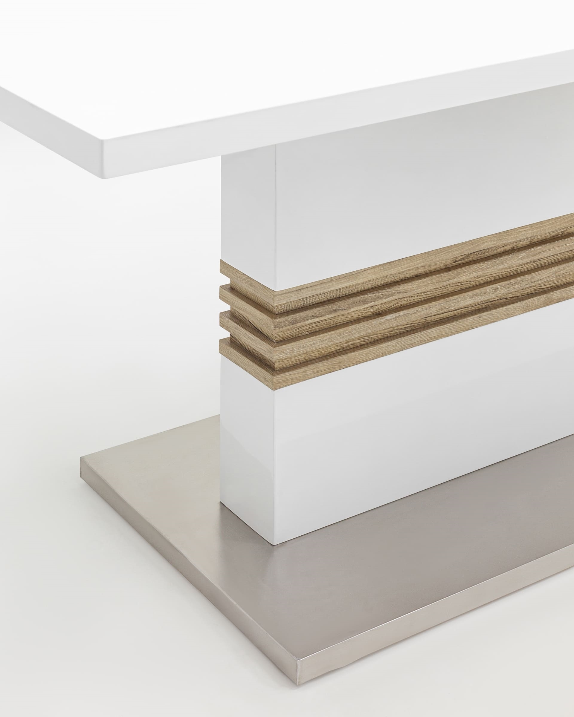 Столешница выполнена из прочного и долговечного МДФ. Светлая глянцевая поверхность столешницы гармонично сочетается с декорированной тумбой. Красивая форма стола позволит легко вписать его в современный интерьер, стол украсит кухню, гостиную или современное кафе, ресторан.