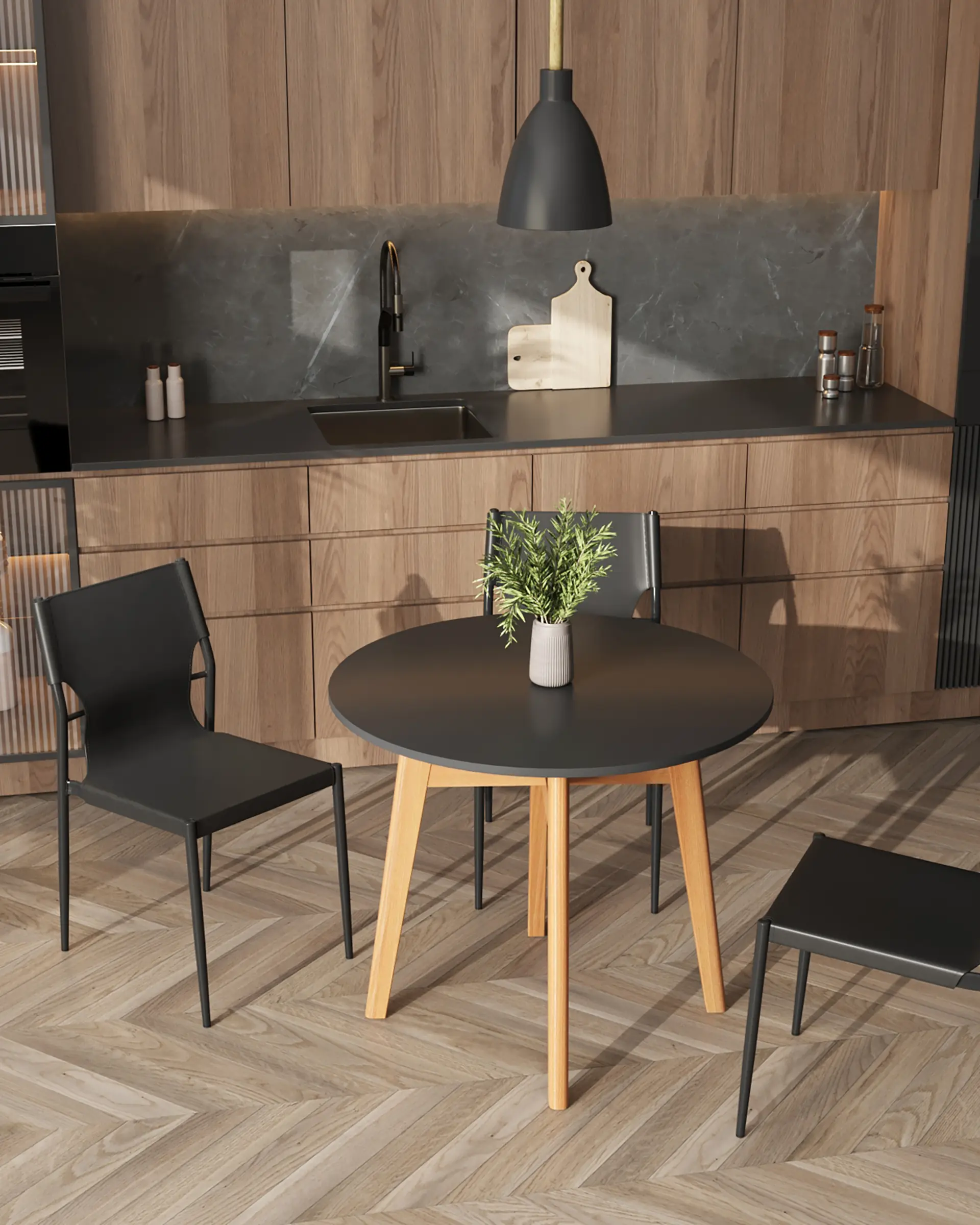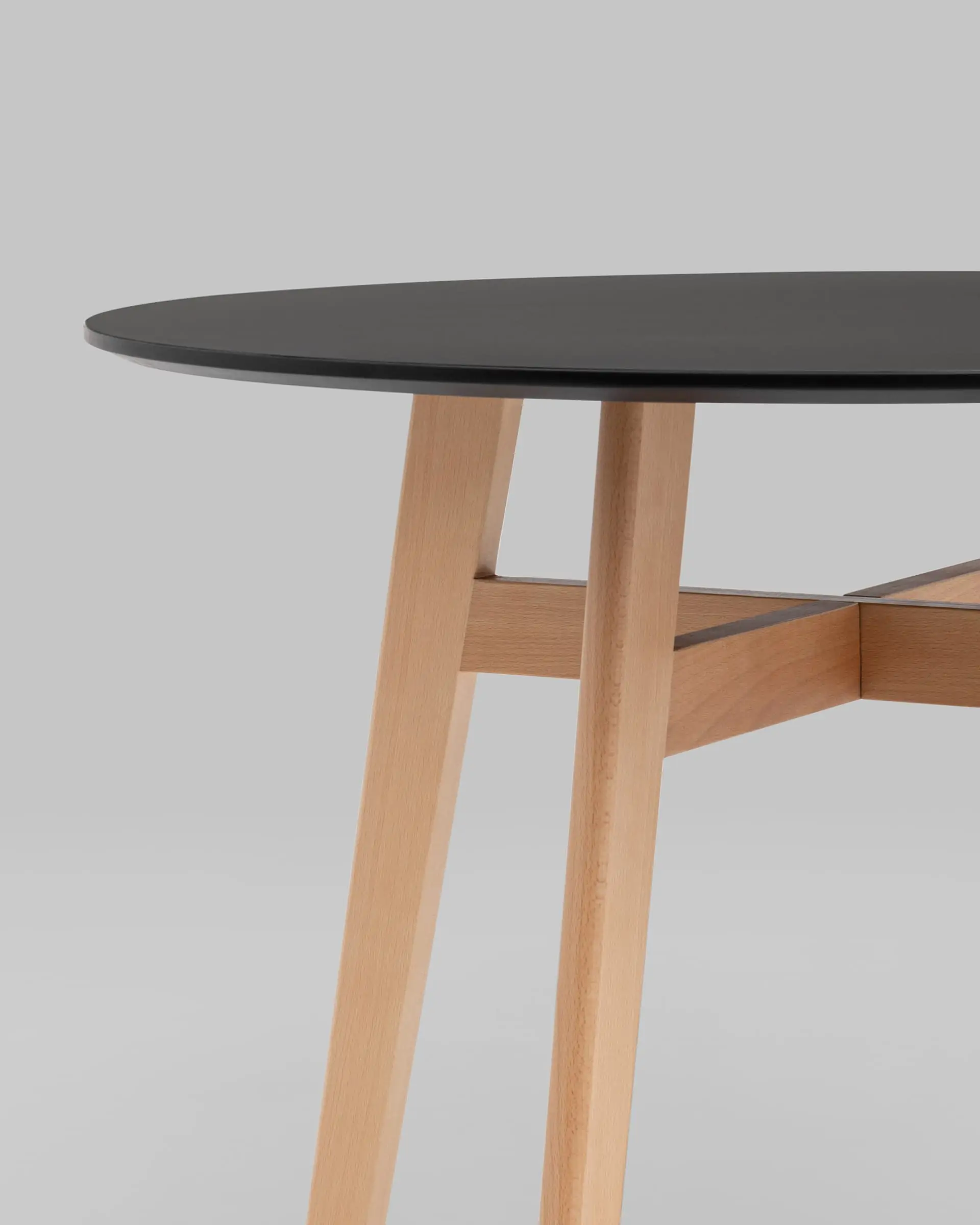 Круглая столешница выполнена из МДФ, окрашенного в черный цвет. Ножки стола изготовлены из массива дерева.