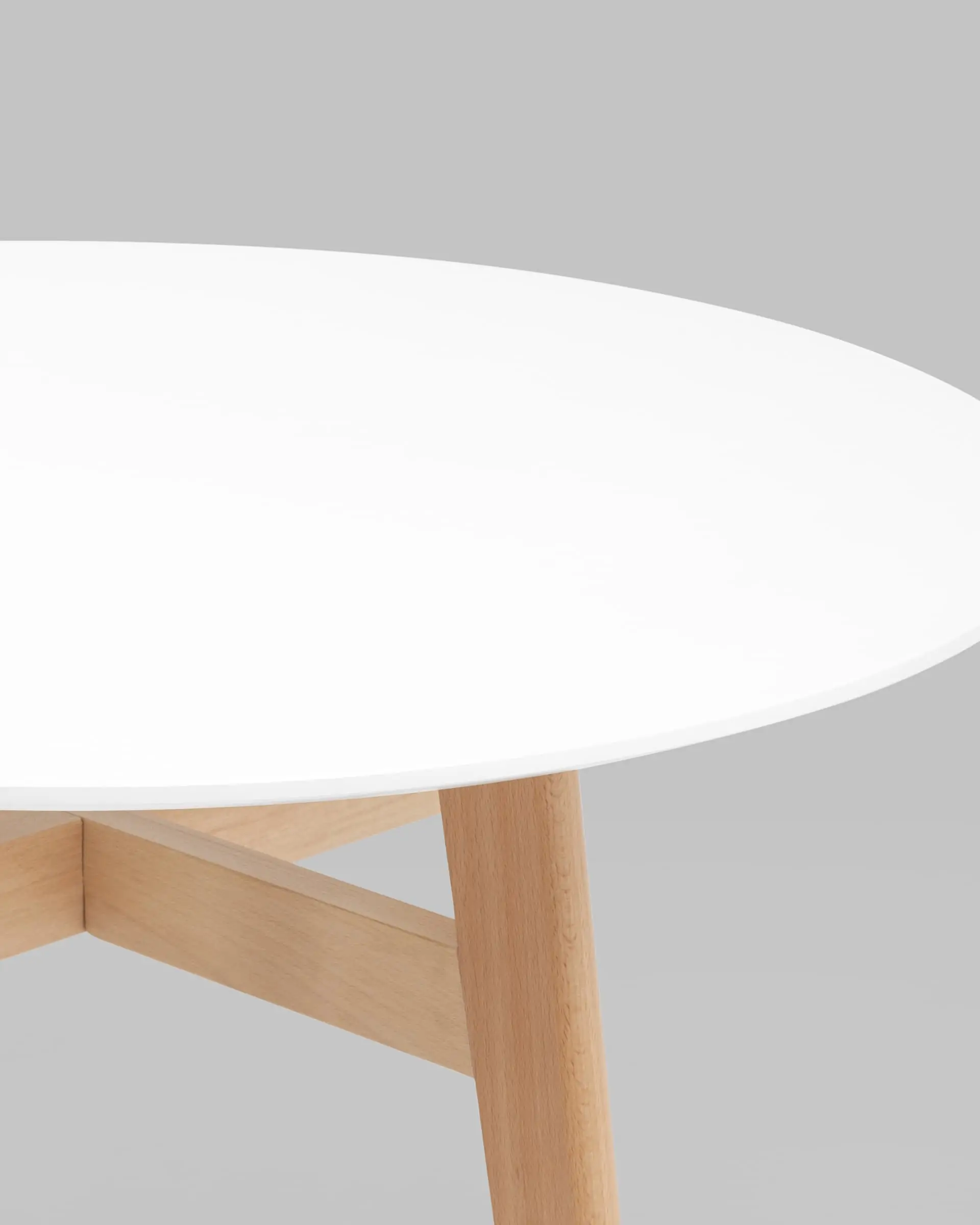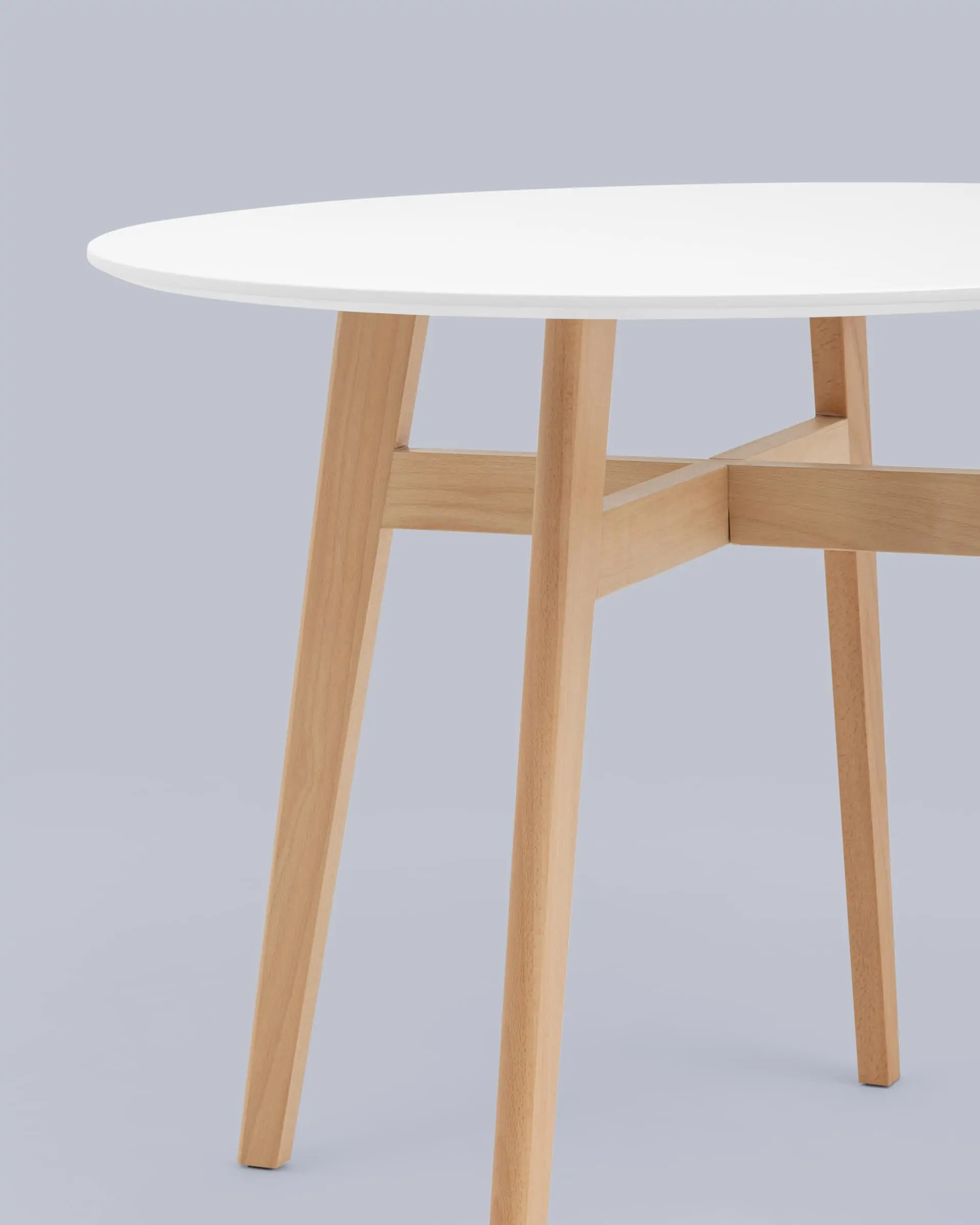 Круглая столешница выполнена из МДФ, окрашенного в белый цвет. Ножки стола изготовлены из массива дерева.