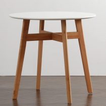 Круглая столешница выполнена из МДФ, окрашенного в белый цвет. Ножки стола изготовлены из массива дерева.