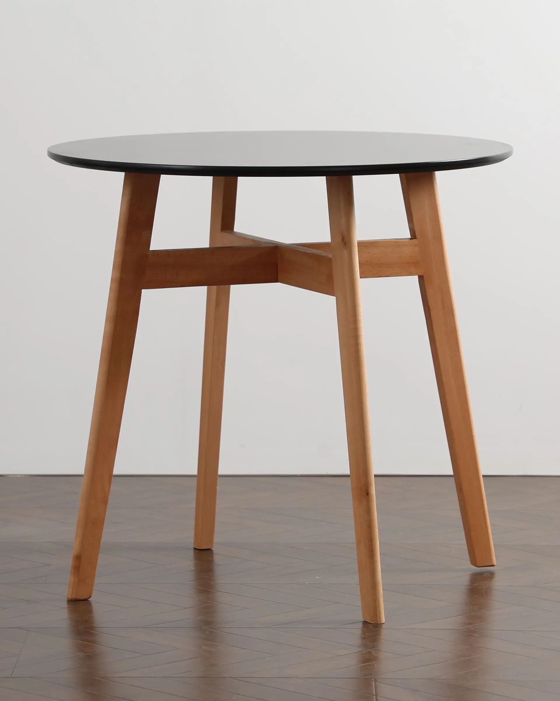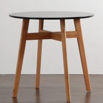 Круглая столешница выполнена из МДФ, окрашенного в черный цвет. Ножки стола изготовлены из массива дерева.