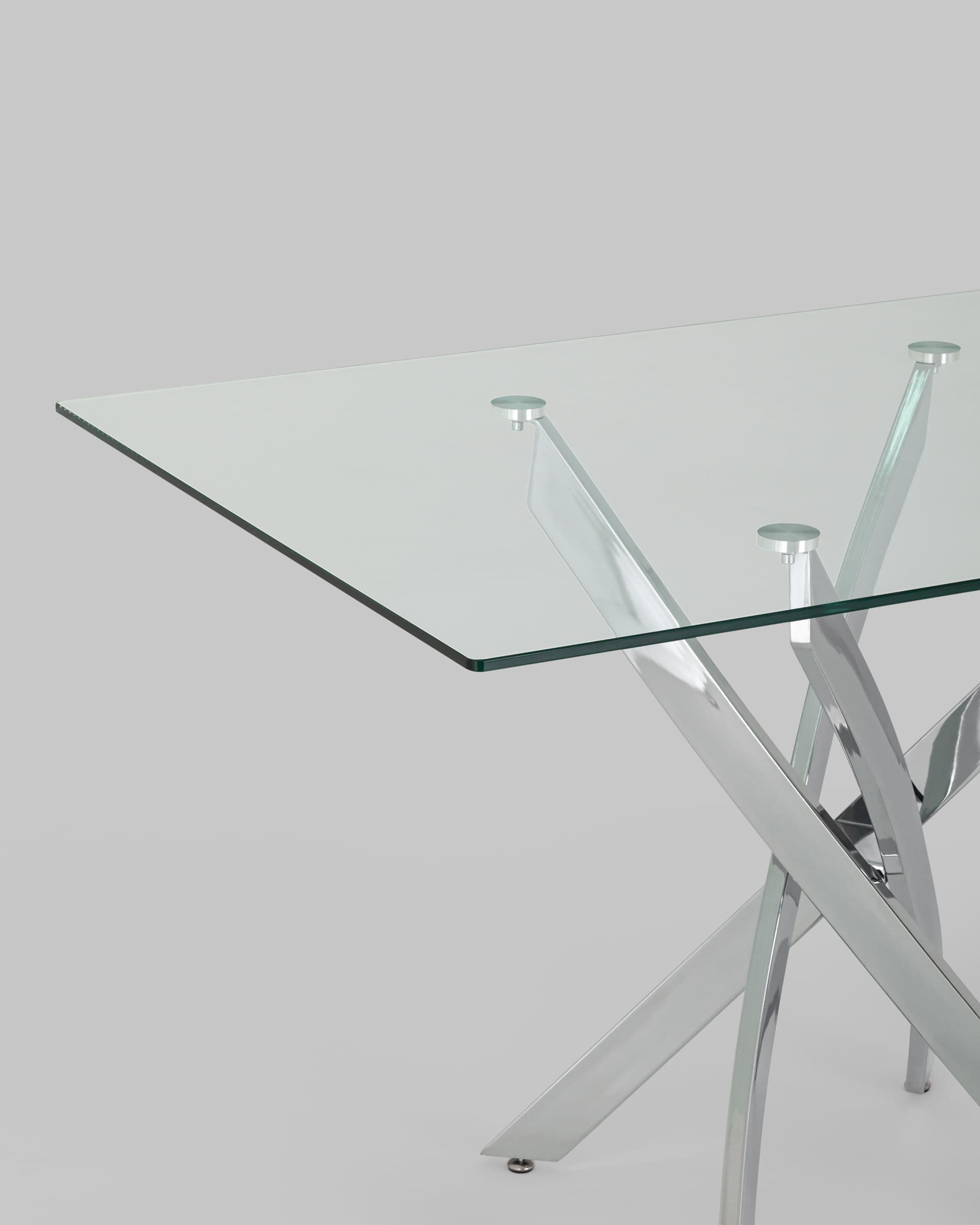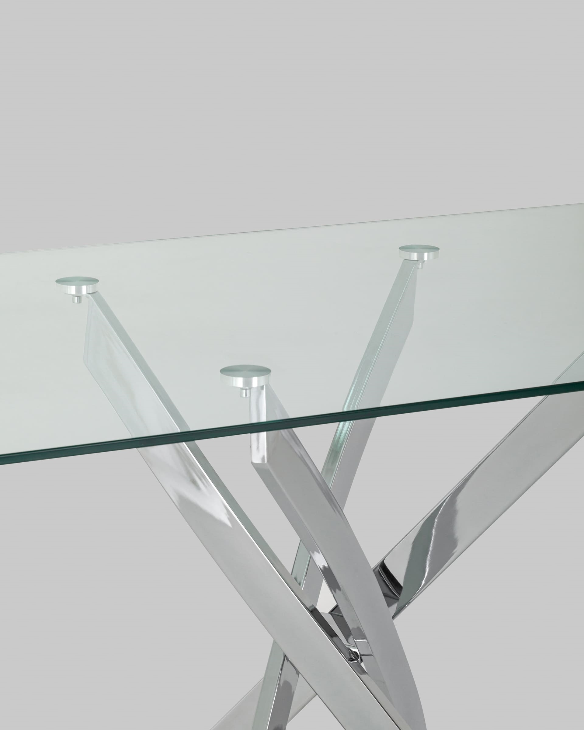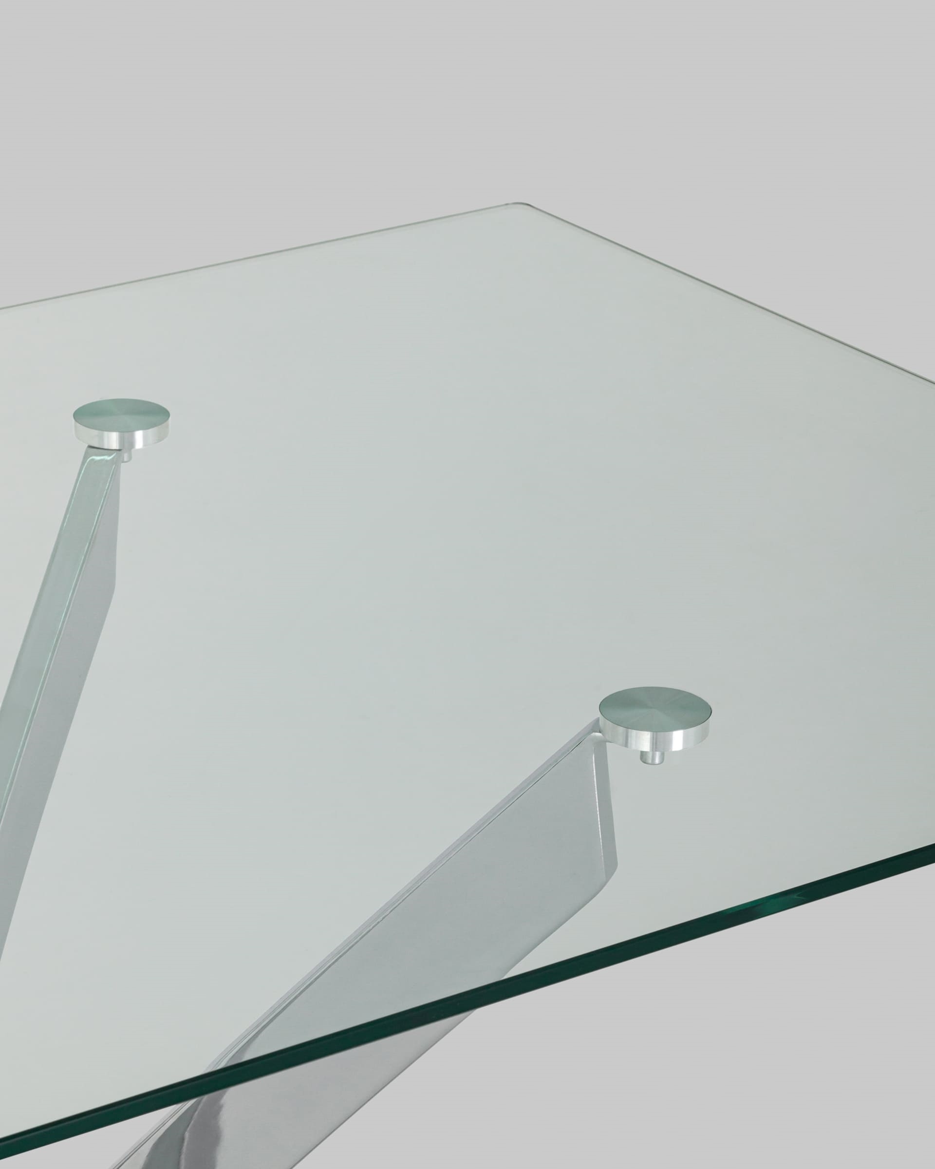 Столешница выполнена из закаленного стекла, которое обладает устойчивостью к влаге и высоким температурам. Ножки изготовлены из хромированного металла. На них предусмотрены специальные подпятники с мягкими накладками, которые предотвращают повреждения напольного покрытия.