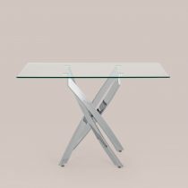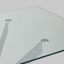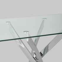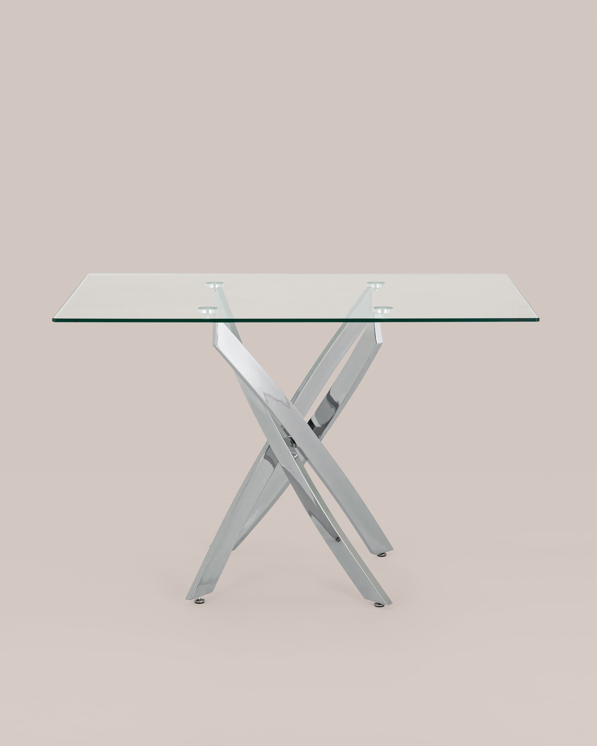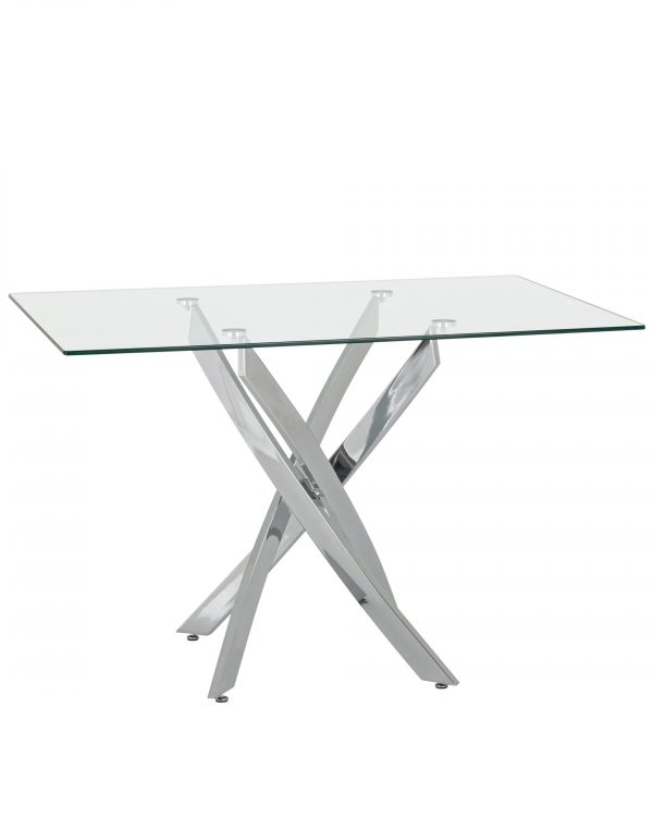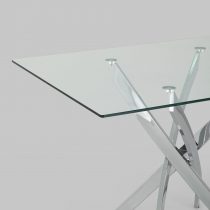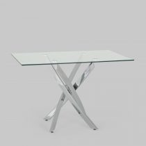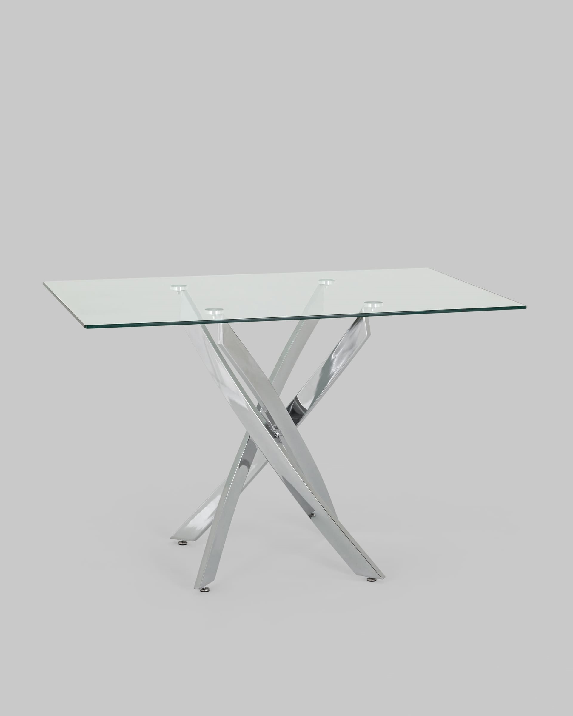 Столешница выполнена из закаленного стекла, которое обладает устойчивостью к влаге и высоким температурам. Ножки изготовлены из хромированного металла. На них предусмотрены специальные подпятники с мягкими накладками, которые предотвращают повреждения напольного покрытия.