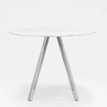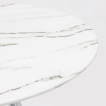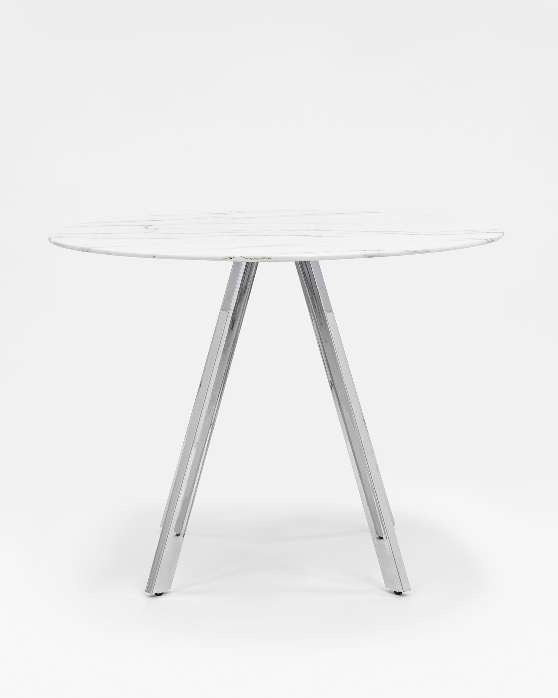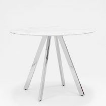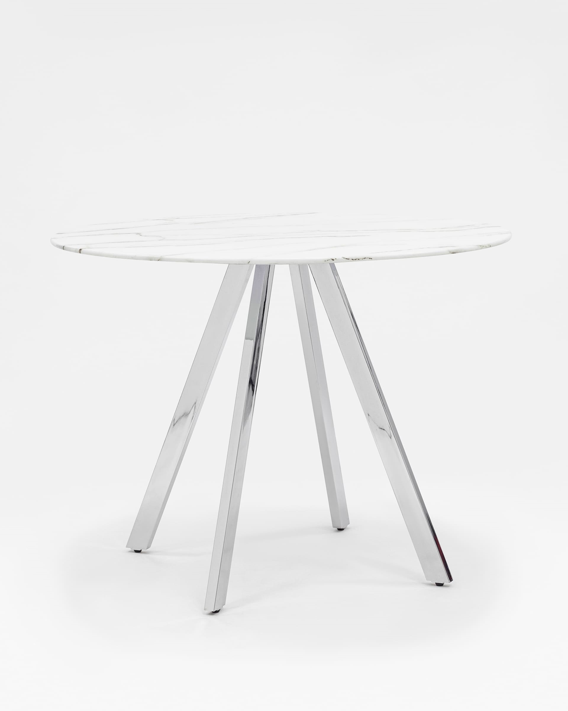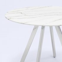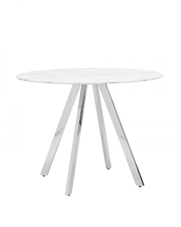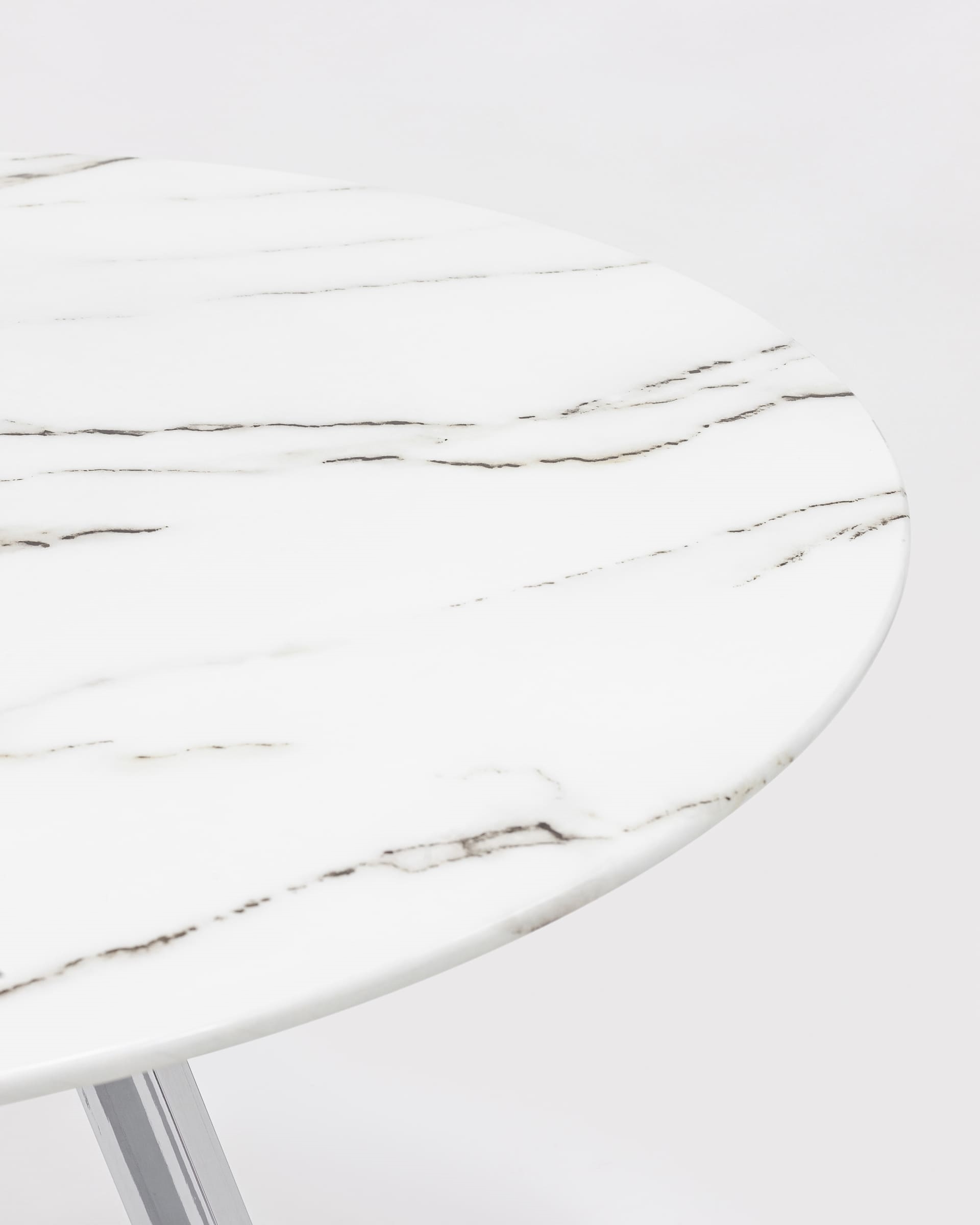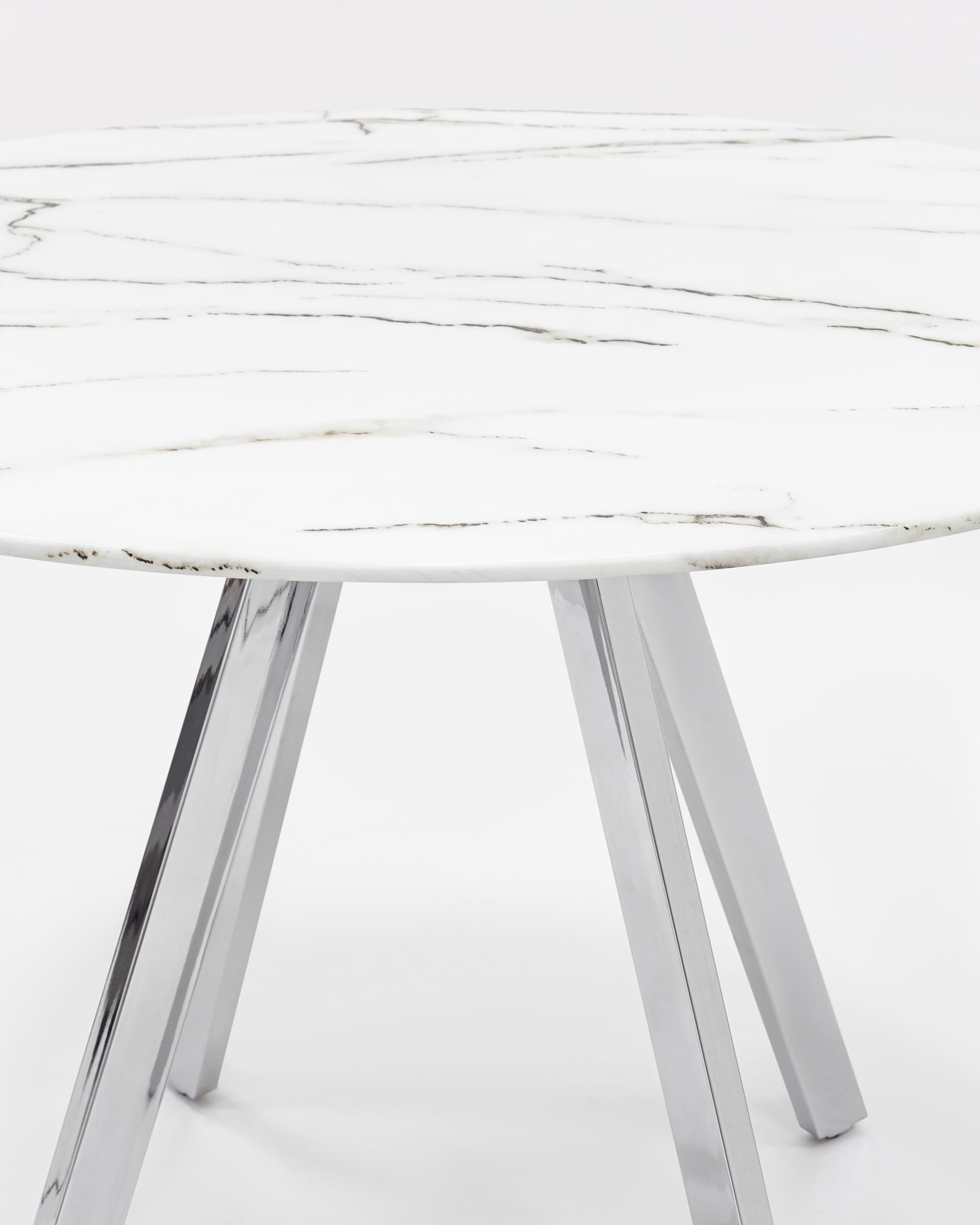 Обеденный стол с красивой стеклянной круглой столешницей белого цвета с рисунком под мрамор.