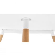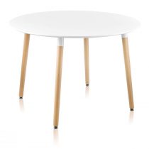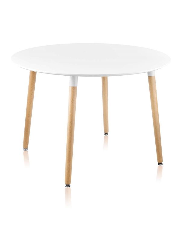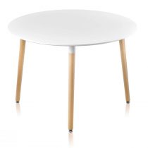Практичный стол с круглой столешницей в классическом стиле. Столешница белого цвета изготовлена из МДФ – плотный материал, более прочный и устойчивый к влаге. Ножки выполнены из светлого массива бука, а основание дополнены металлическими подпятниками с прорезиненным низом для защиты напольного покрытия. При необходимости их можно отрегулировать по высоте.