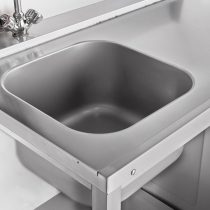 Корпус выполнен из нержавеющей стали. Ополаскивание посуды и кухонных принадлежностей происходит в цельнотянутой моечной ванне размером 400 на 400 мм. Столешница выдерживает нагрузку до 80 кг.