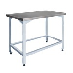 Столешница стола изготовлена из шлифованной нержавеющей стали. Каркас выполнен из стального уголка с полимерно-порошковым покрытием. Полка — сплошная из стали с полимерно-порошковым покрытием.