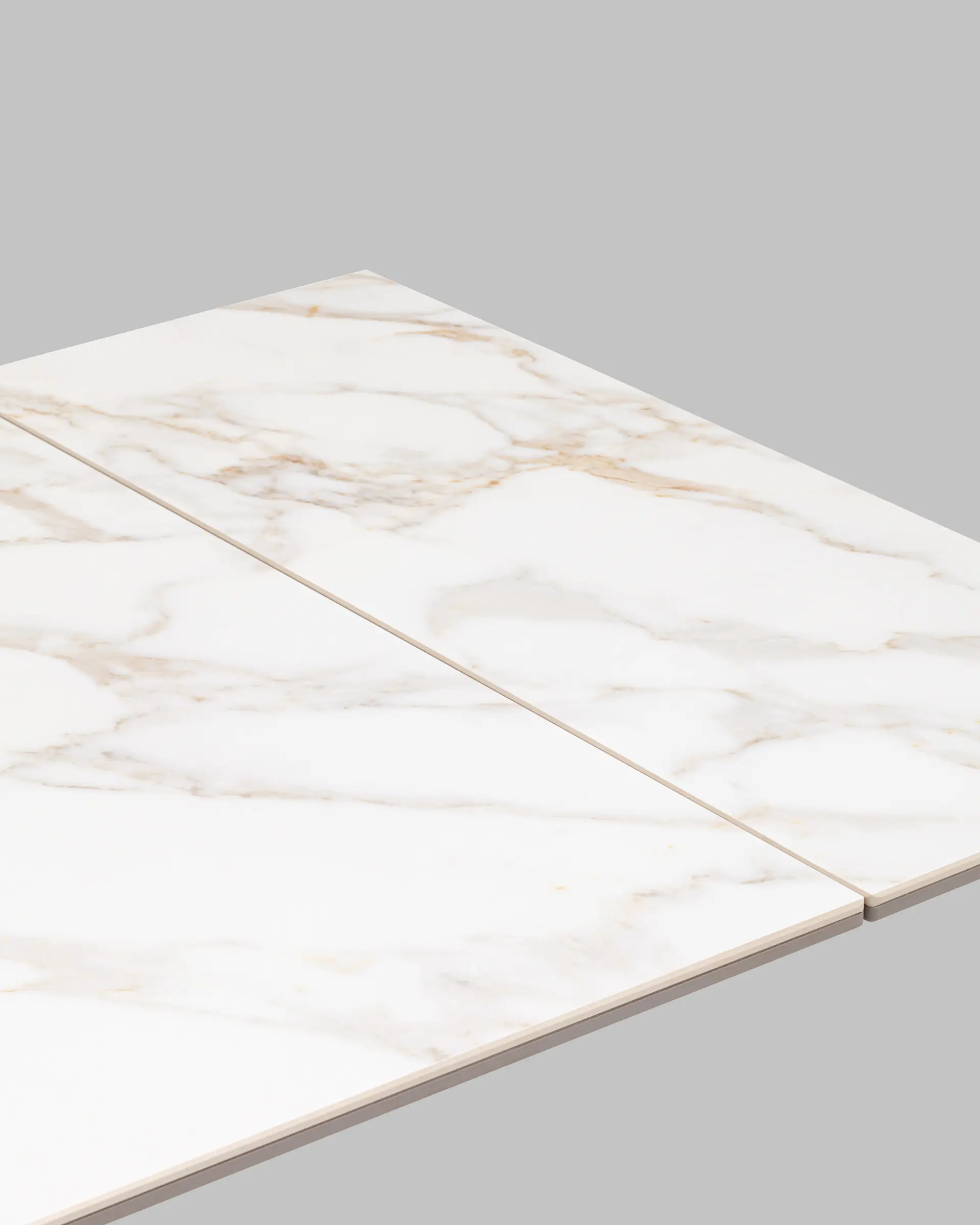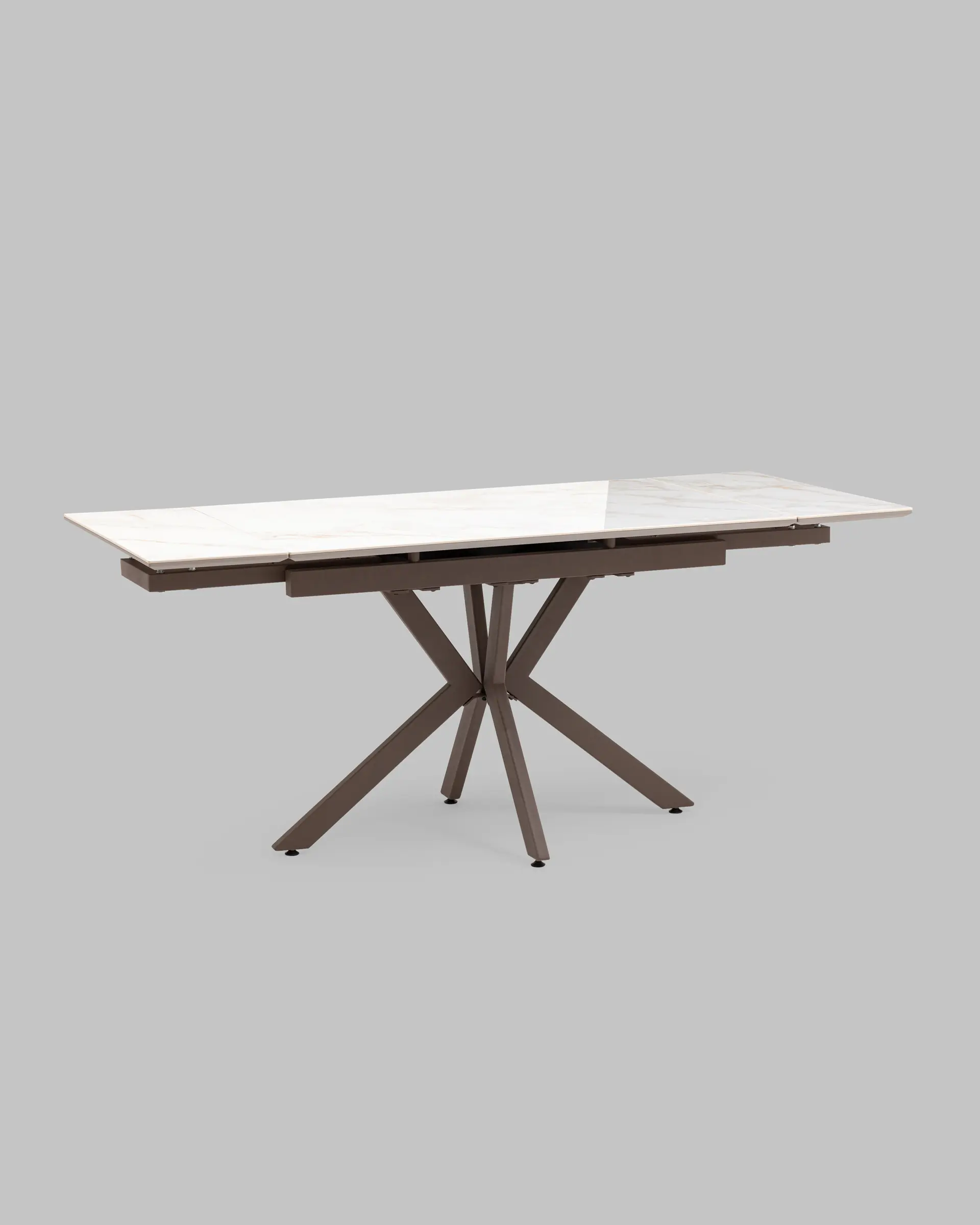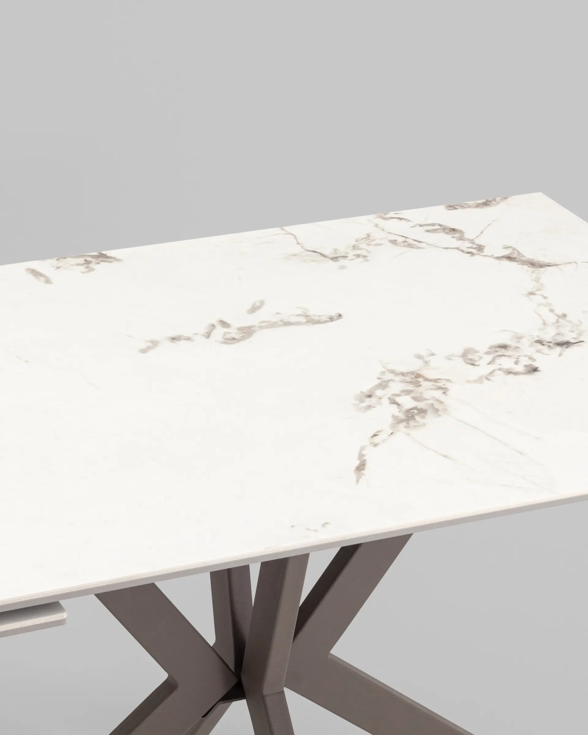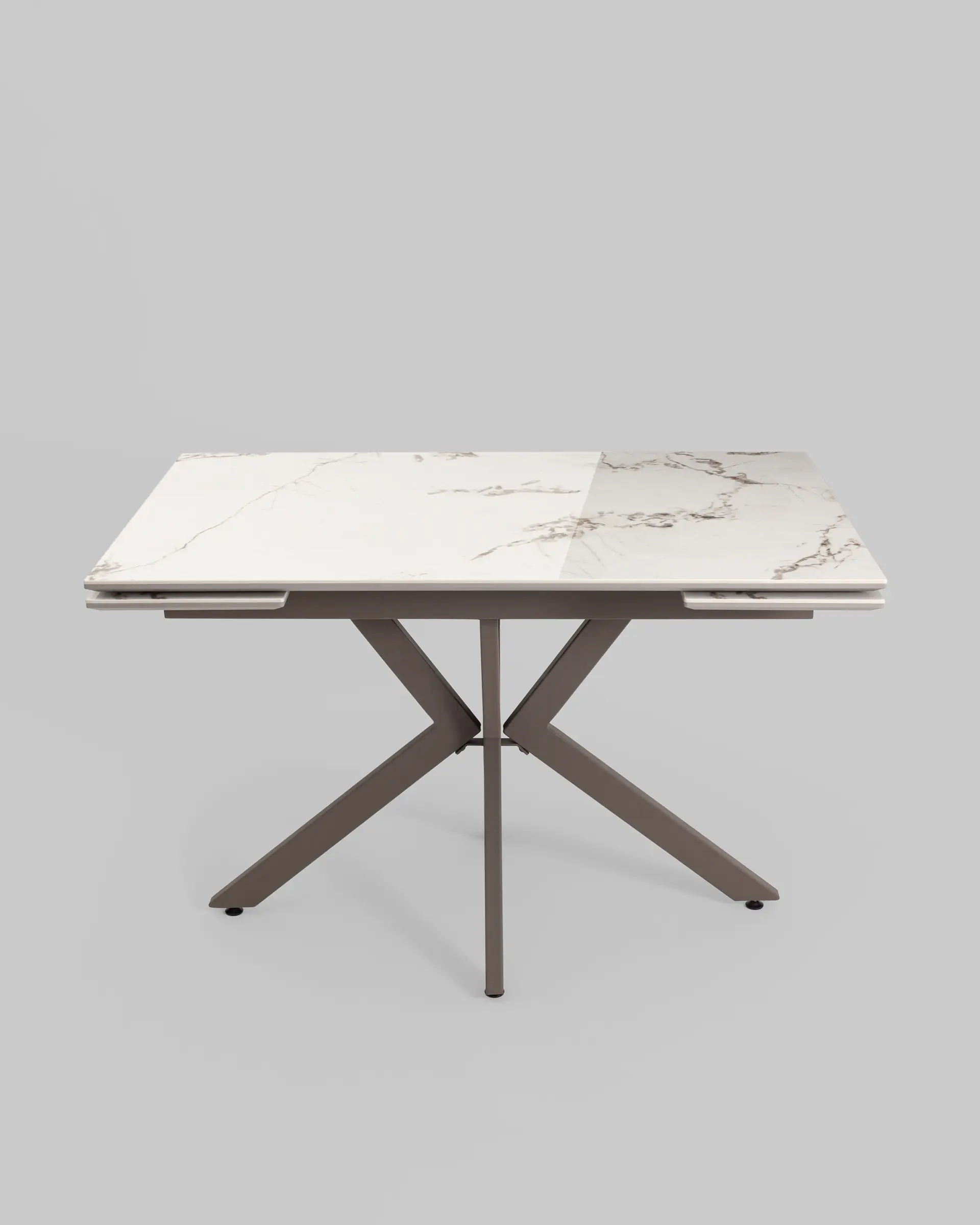 Лаконичный обеденный стол Marmer с насыщенным рисунком белого мрамора. Столешница выполнена из керамики – устойчива к перепадам температуры, к чрезмерной влаге, а любые загрязнения на поверхности легко устранимы. При необходимости длину стола можно увеличить со 120 см до 180 см. Раздвижной механизм позволяет легко раздвигать и сдвигать стол одному человеку с минимальным физическим усилием. Аккуратные металлические ножки в цвете капучино образуют простую и надёжную конструкцию. Благодаря металлическому каркасу стол прочный и устойчивый, а пластиковые насадки надежно защищают пол от царапин. Стол раскладной Marmer станет практичным украшением любой кухни или обеденной зоны.