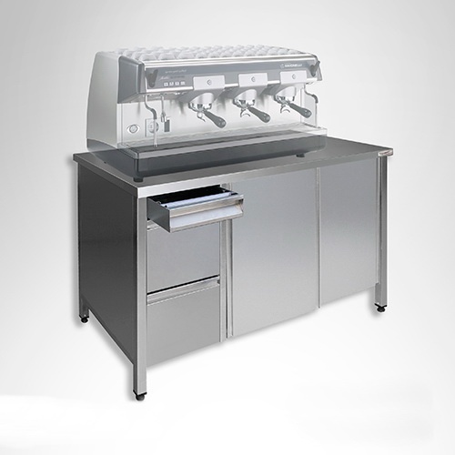 Стол-тумба под кофемашину серии «СТПкн» используется в сфере общественного питания в качестве вспомогательного оборудования. Предназначен для размещения кофемашины и хранения кухонного инвентаря, столовых приборов, чашек, а также пищевых продуктов в кофейне. Наличие встроенного нок-бокса обеспечивает аккуратную, удобную и быструю утилизацию отходов кофе.