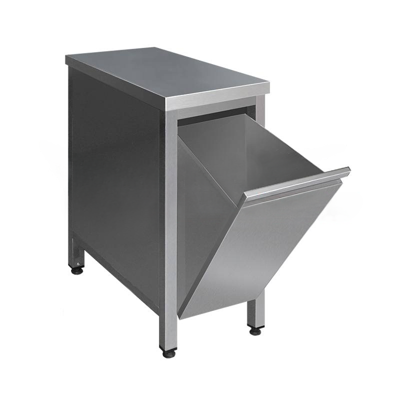 Стол с бункером для сбора отходов серии «СТПб» обеспечивает лёгкий доступ к бункеру, в то же время надежно скрывает мусор и неприятный запах от него. Не портит эстетический вид цеха. Стол имеет рабочую поверхность, выполнен из нержавеющей стали. Для удобства монтажа изделий стандартный отступ задних ног составляет 90 мм.