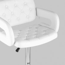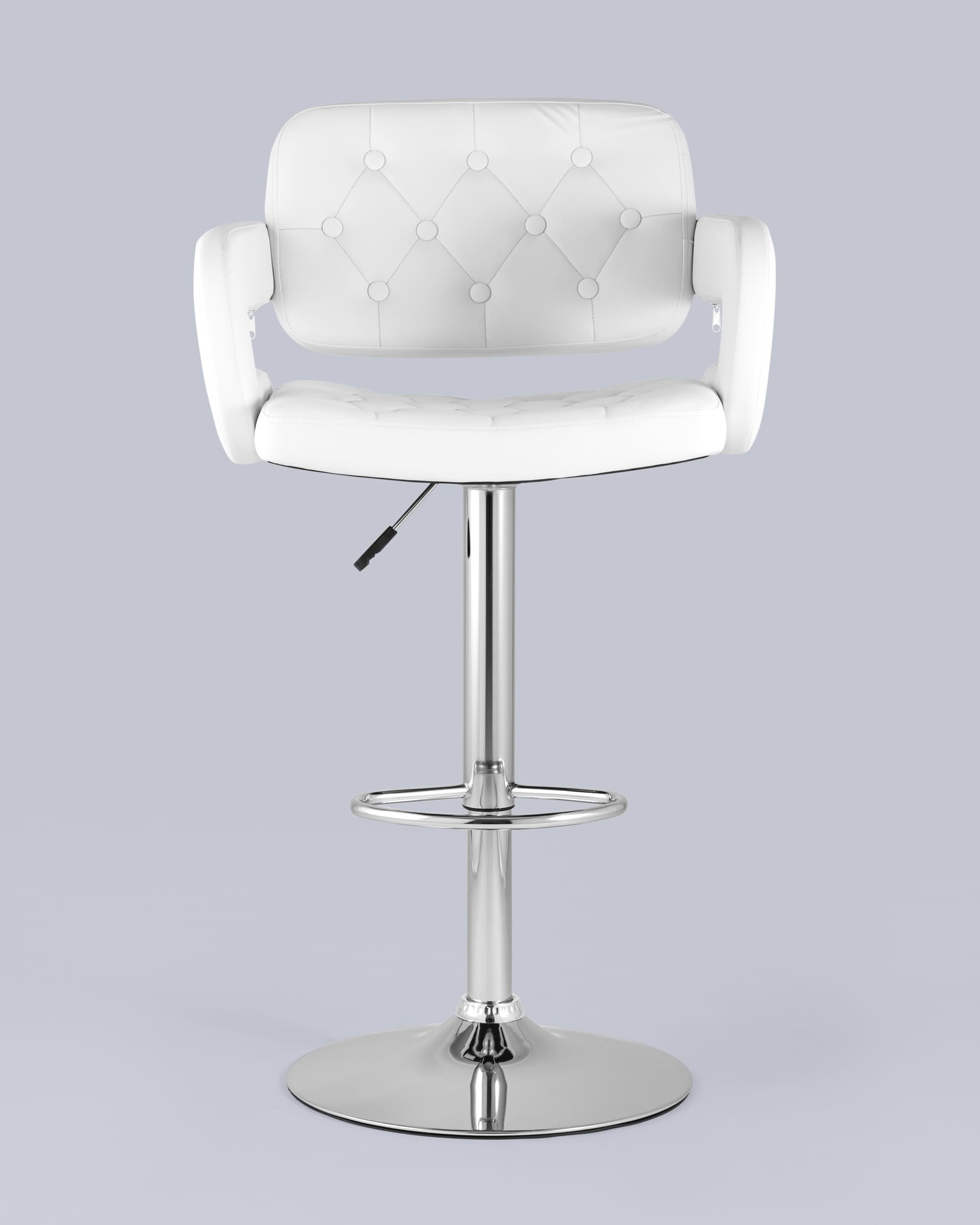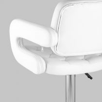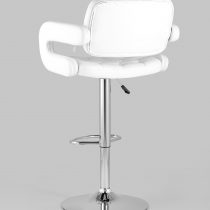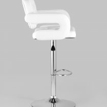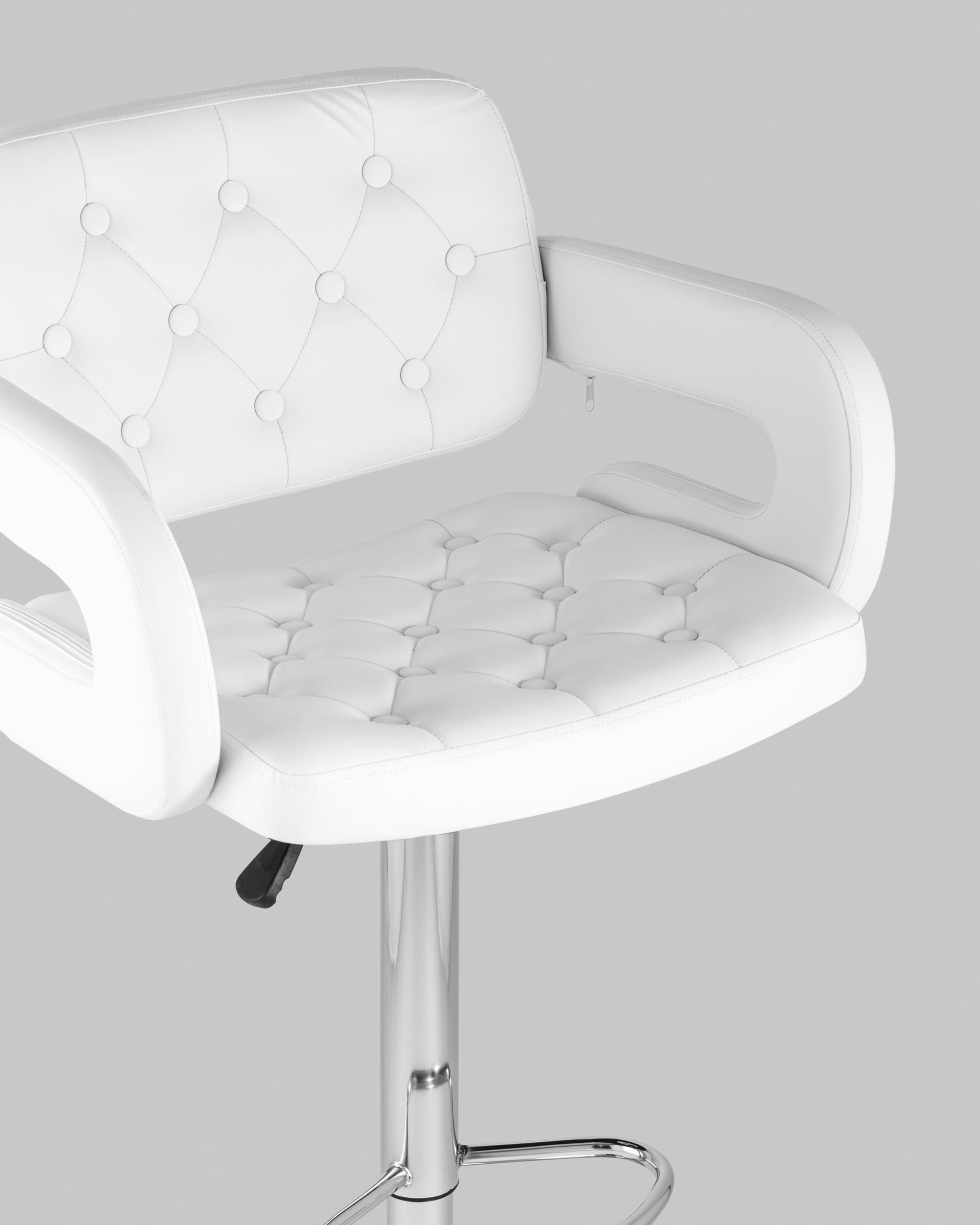Для обивки сиденья барного стула использована PU-кожа – искусственный материал с высокой прочностью, износостойкостью и естественной фактурой. Каретная стяжка в оформлении спинки сиденья и белый цвет сочетаются с металлическим блеском гладкого хромированного основания. Высота сиденья регулируется от 62 до 83 сантиметров – можно подогнать под барную стойку или столешницу любого размера.