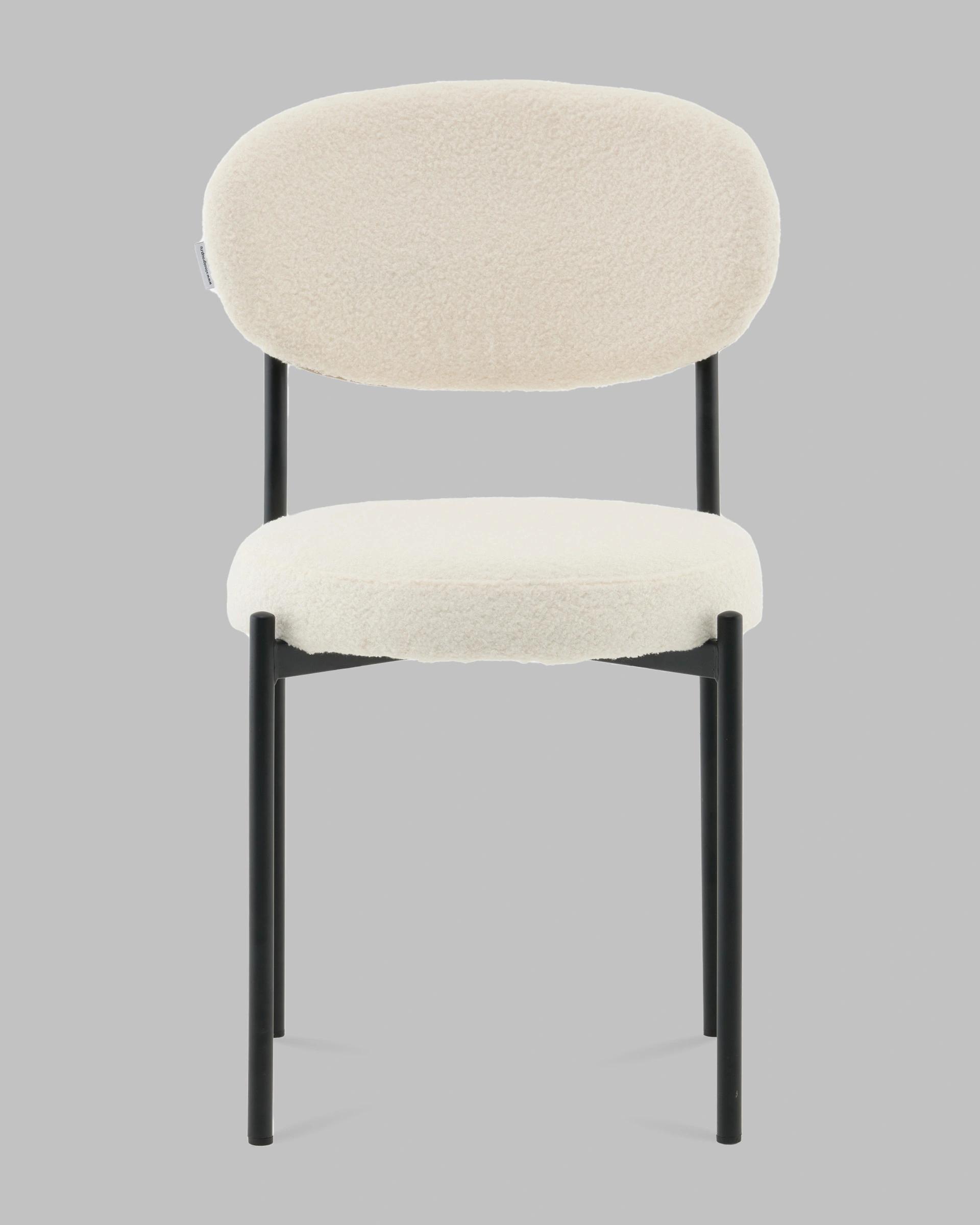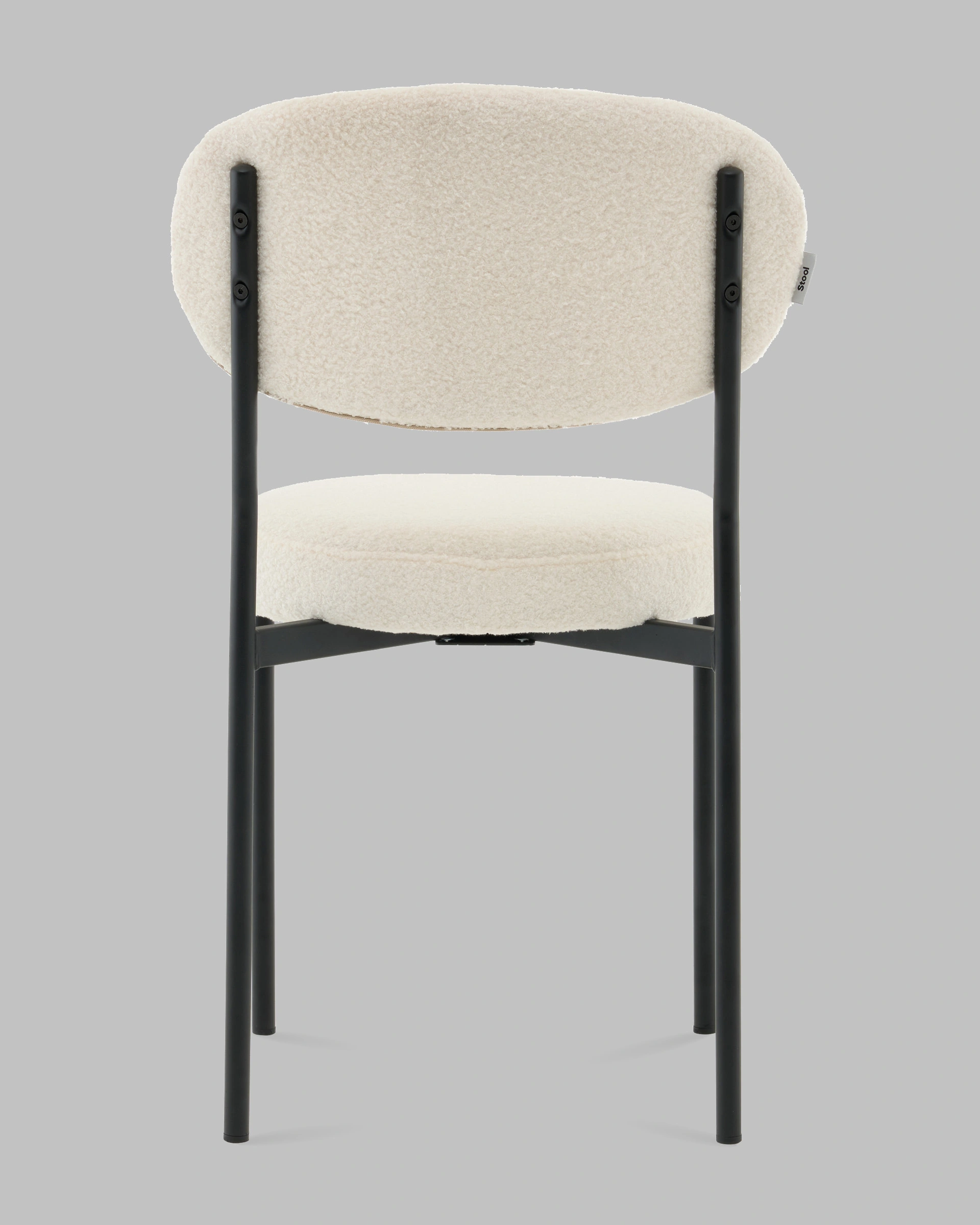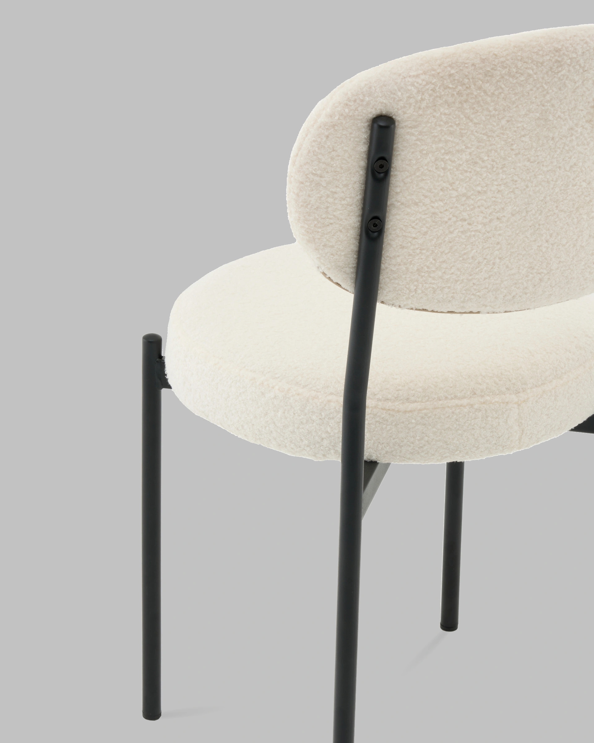 Обивка из плотного материала букле, которая обладает мягкостью и долговечностью, ножки изготовлены из металла в черном цвете. На ножках дополнительно предусмотрены специальные подпятники, которые предотвращают скольжение и повреждение напольного покрытия.
