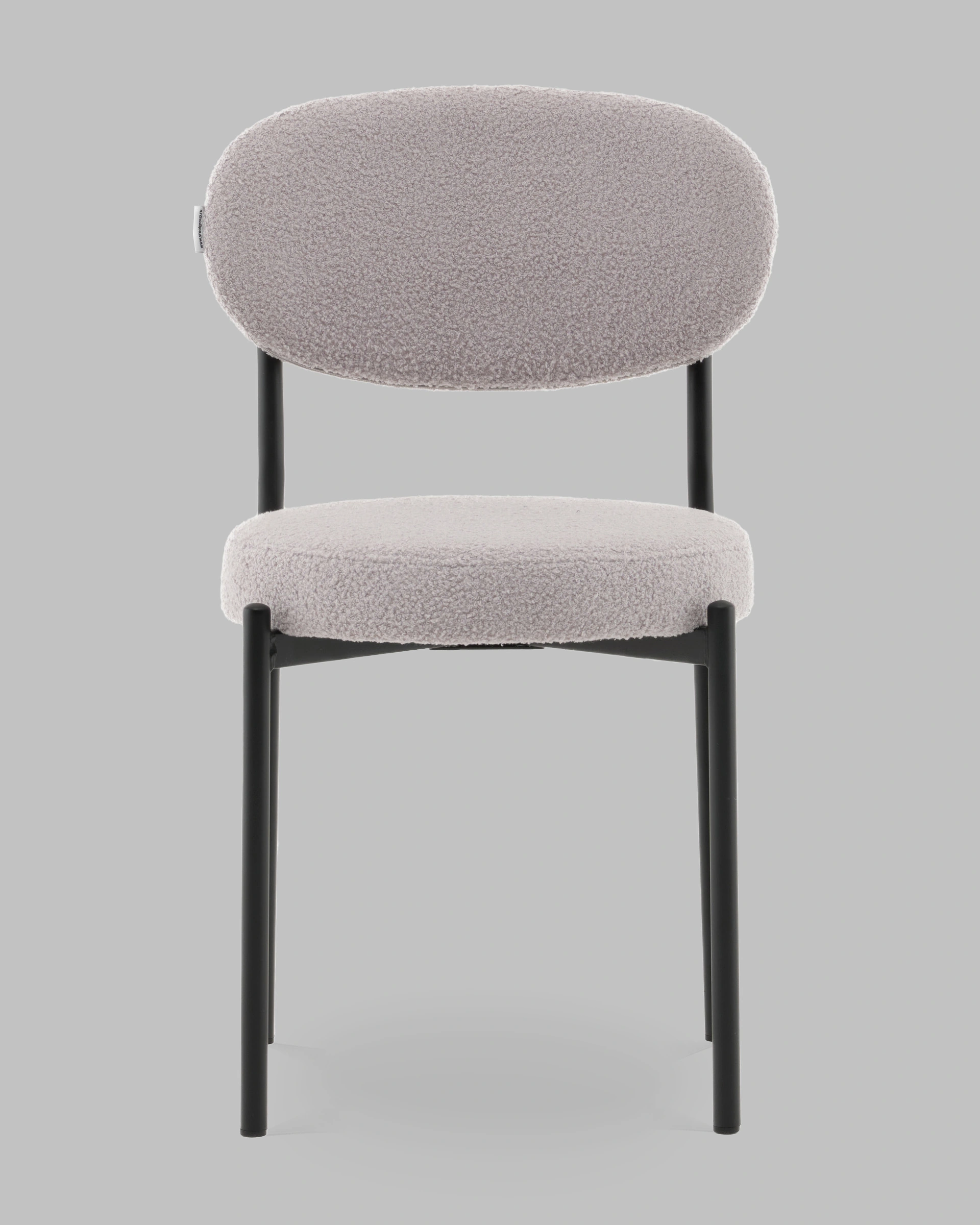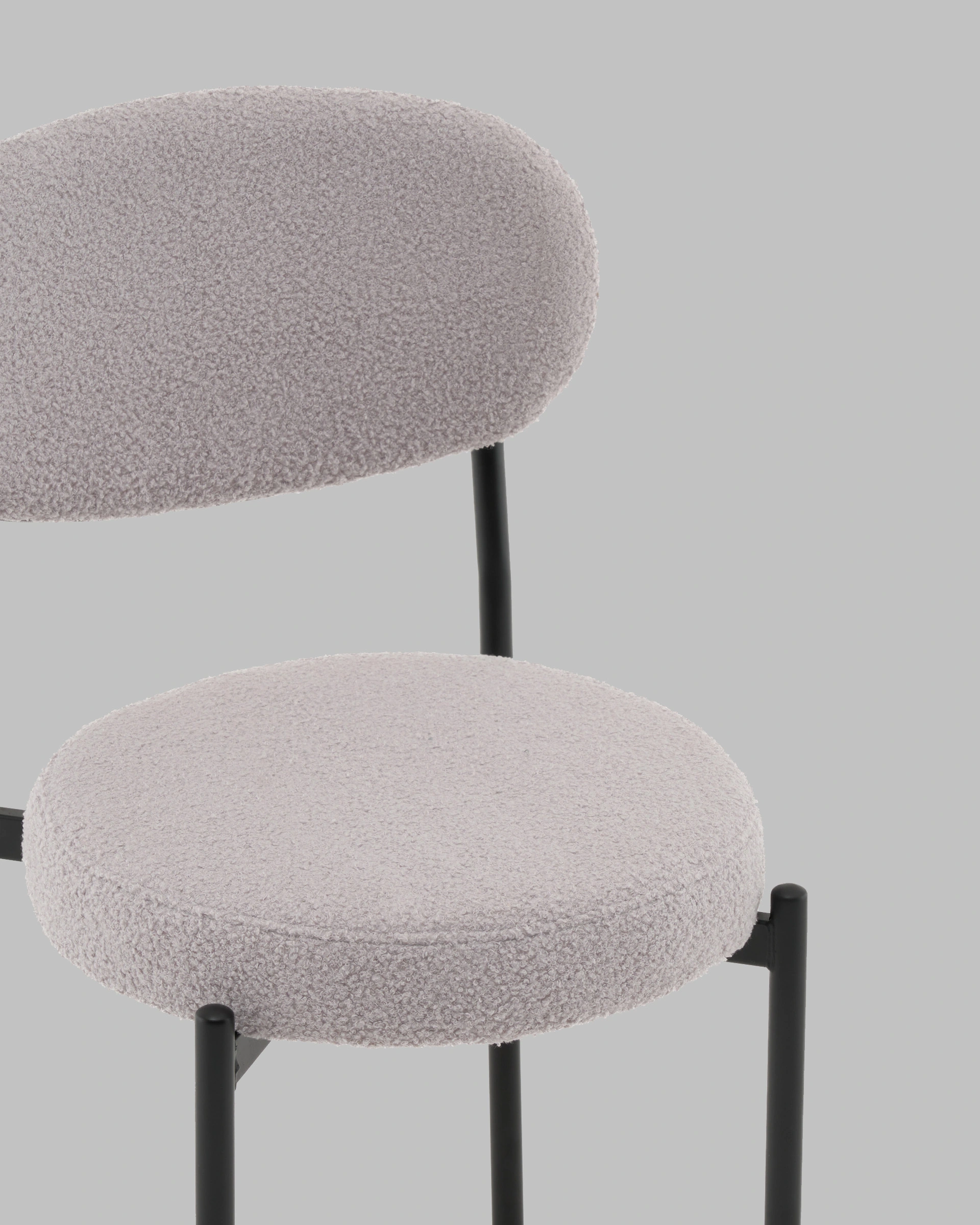 Обивка из плотного материала букле, которая обладает мягкостью и долговечностью, ножки изготовлены из металла в черном цвете. На ножках дополнительно предусмотрены специальные подпятники, которые предотвращают скольжение и повреждение напольного покрытия.