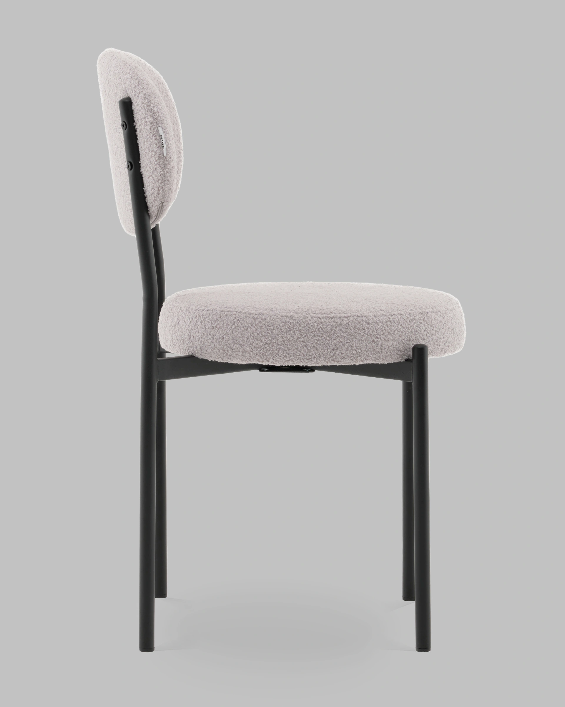 Обивка из плотного материала букле, которая обладает мягкостью и долговечностью, ножки изготовлены из металла в черном цвете. На ножках дополнительно предусмотрены специальные подпятники, которые предотвращают скольжение и повреждение напольного покрытия.