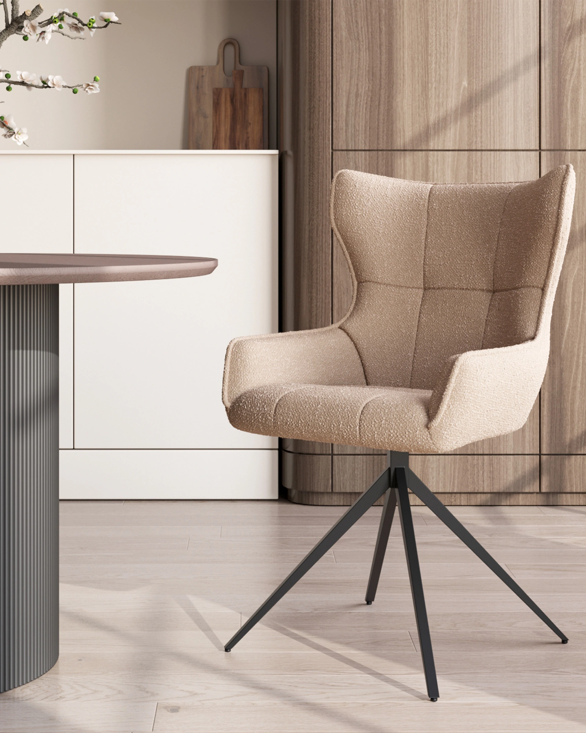 Сиденье и высокая спинка обиты тканьюшенилл— приятной на ощупь, с выразительной текстурой и устойчивостью к истиранию. Материал не только создаёт ощущение мягкости и тепла, но и легко поддаётся уходу. Стеганые детали добавляют объёма и подчёркивают визуальную лёгкость модели.