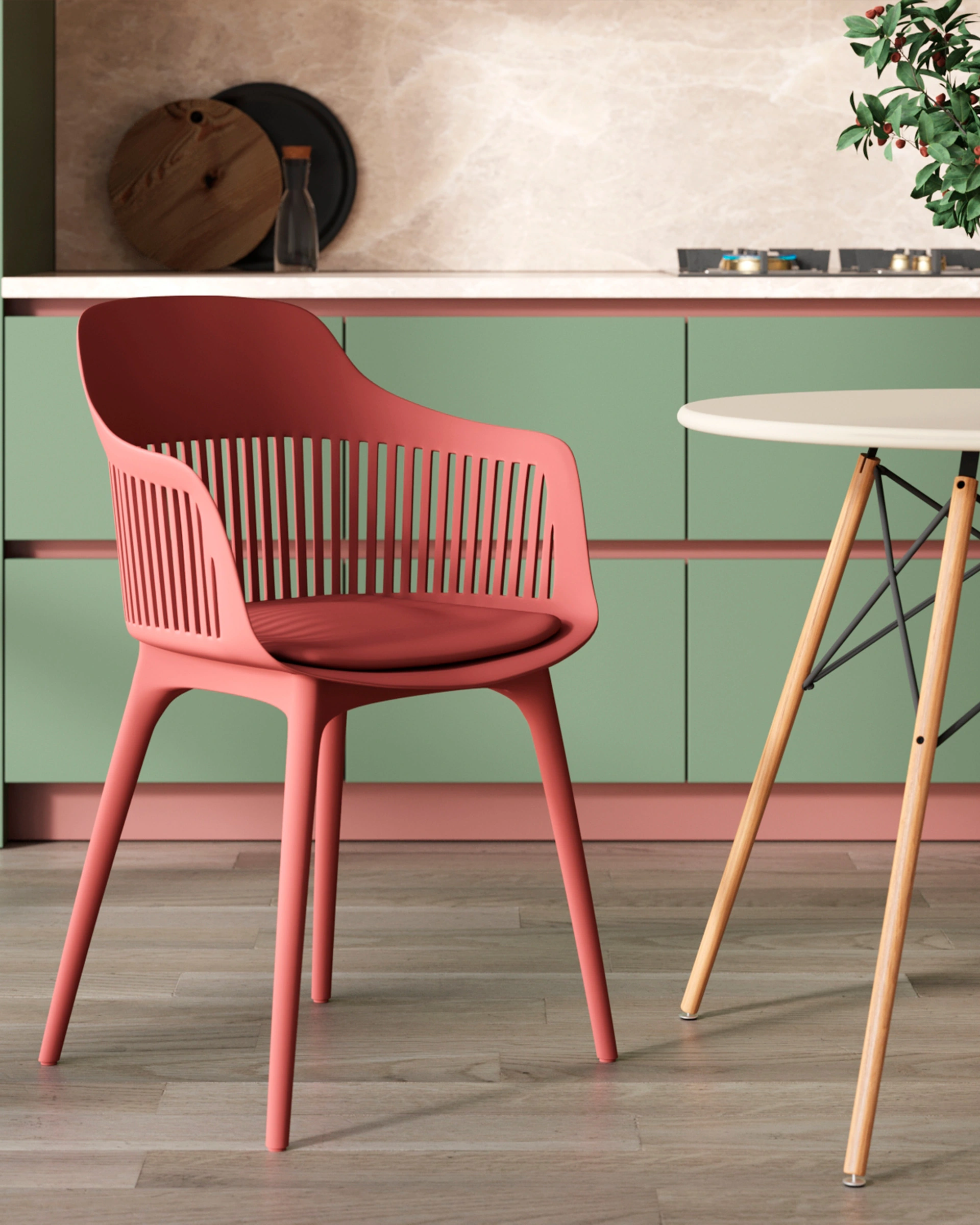 Стул Crocus предназначен для обустройства обеденных зон, кухонь, гостиных. Декорированная спинка, переходящая в подлокотники, сиденье и ножки стула выполнены из ударопрочного, износостойкого пластика. Эргономичная форма обеспечит надежную опору, а удобные подлокотники добавят уюта. Для большего комфорта, на сиденье имеется подушка в обивке из экокожи. Такой материал устойчив к действию влаги, не деформируется, легко поддается чистке и не содержит вредных компонентов.