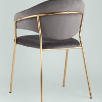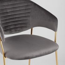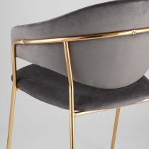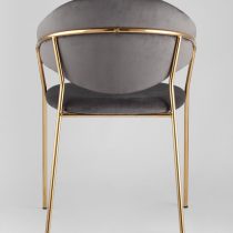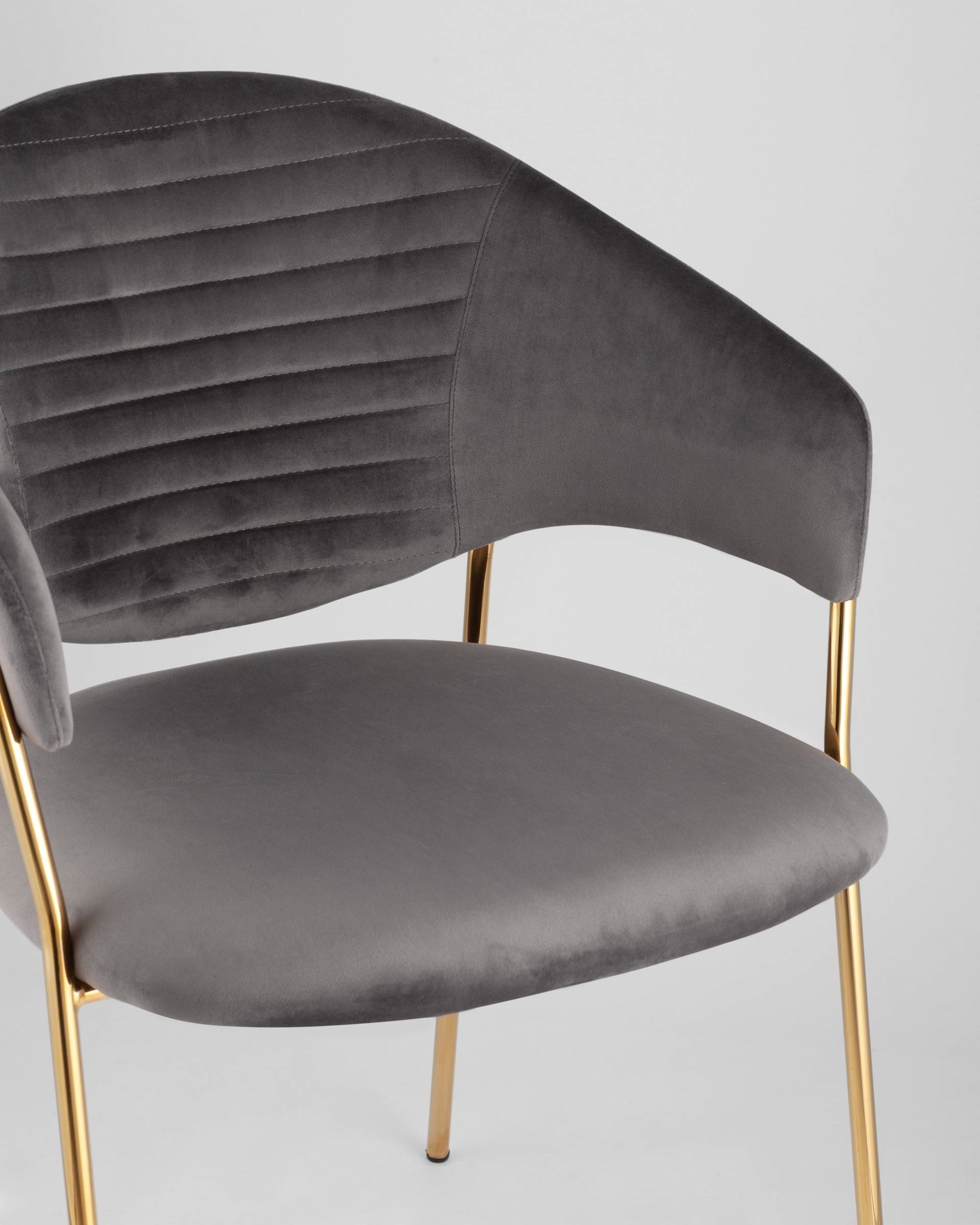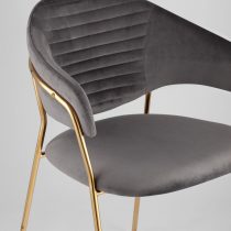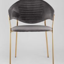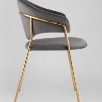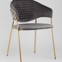 Стильный кухонный стул с оригинальной формой спинки, высокой поддержкой и подлокотниками. В качестве обивки используется мягкий велюр. Металлический каркас золотого цвета огибает спинку и выступает аккуратным акцентом модели. Широкое сиденье обеспечивает удобную посадку и уют.