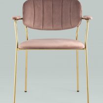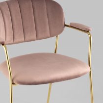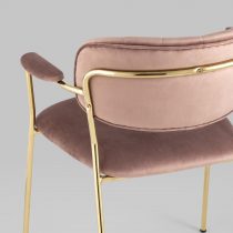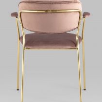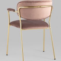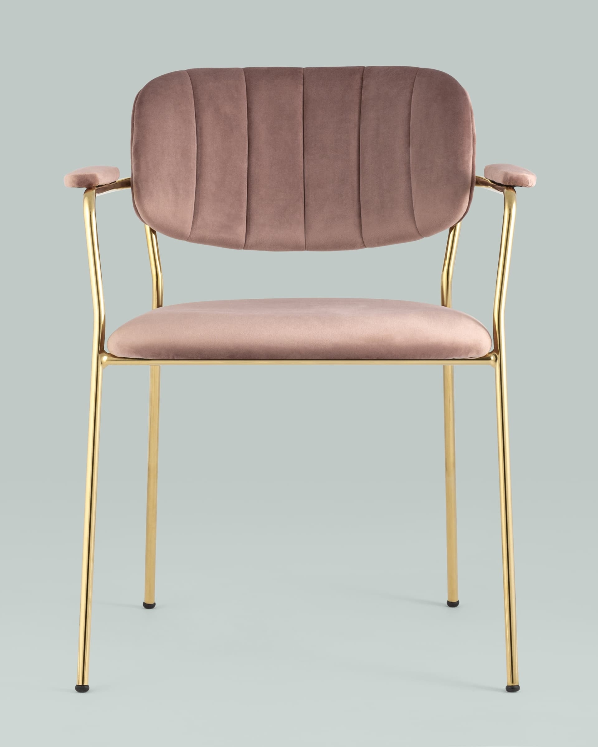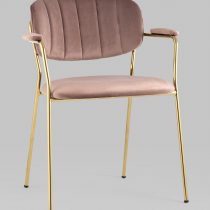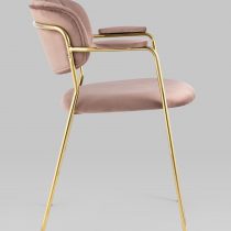 Современный обеденный стул с подлокотниками и металлическими ножками. Обивка выполнена из мягкого велюра. Металлический каркас золотого цвета огибает спинку и плавно переходит из подлокотников в ножки. Широкое сиденье обеспечивает удобную посадку и уют. На подлокотниках для дополнительного комфорта предусмотрены мягкие накладки.