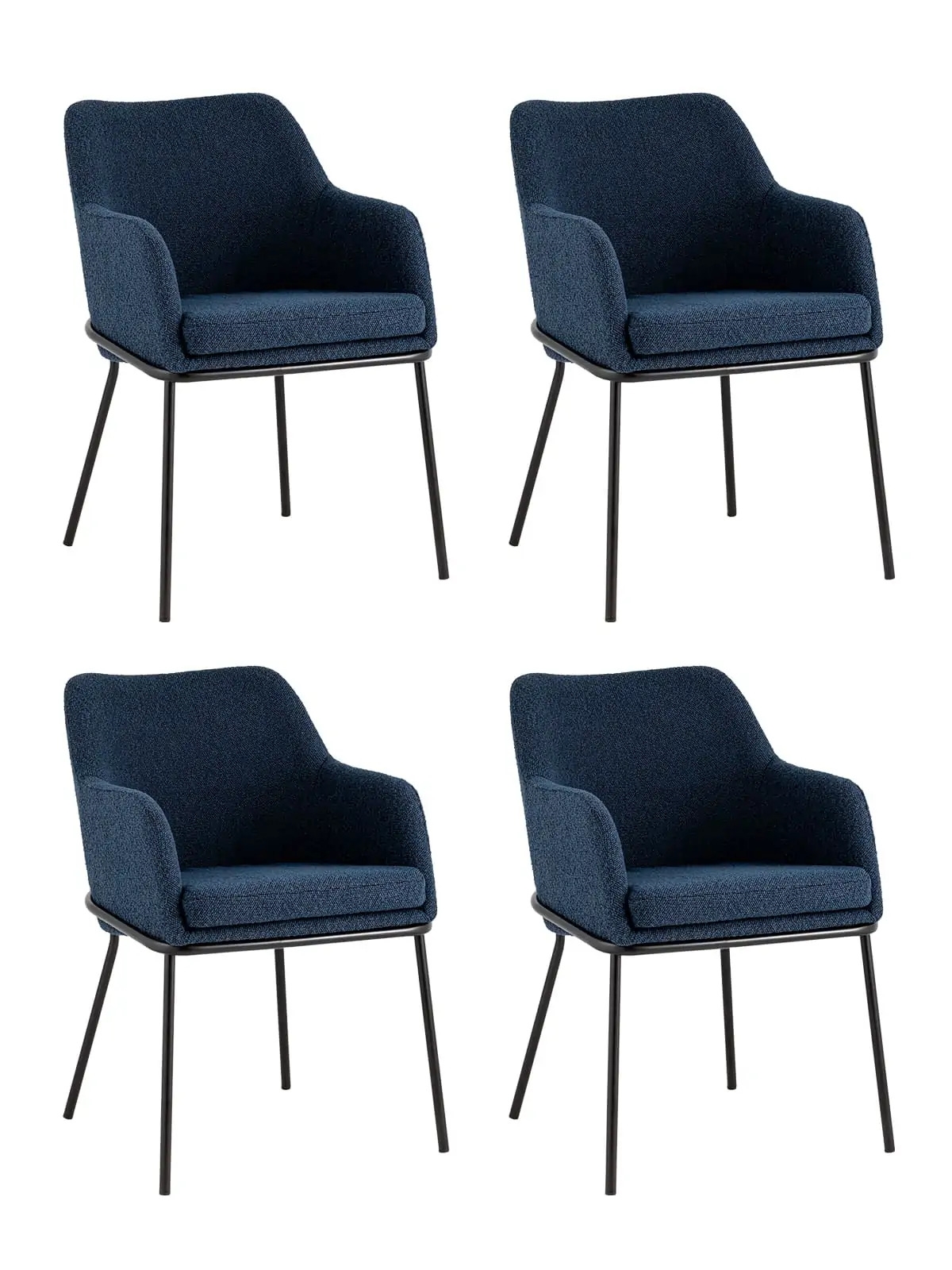 Комплект из четырех стульев. Изящный стул с комфортным сиденьем и спинкой. Основание и ножки черного матового цвета изготовлены из прочного металла. Обивка выполнена из прочной ткани с мягким ворсом в стиле букле, необычная фактура и мягкость добавляют стулу больше уюта.
