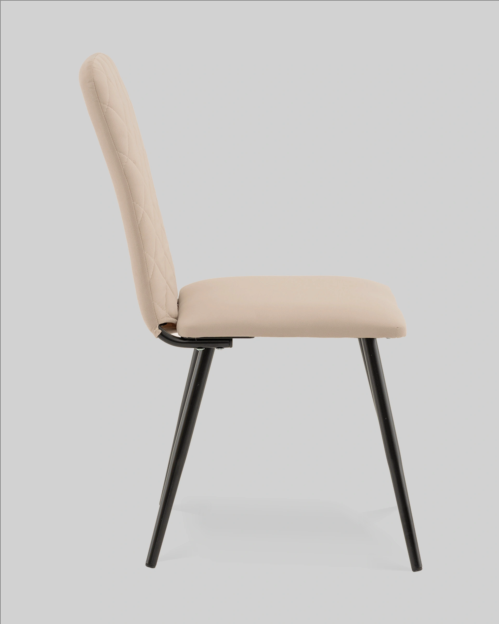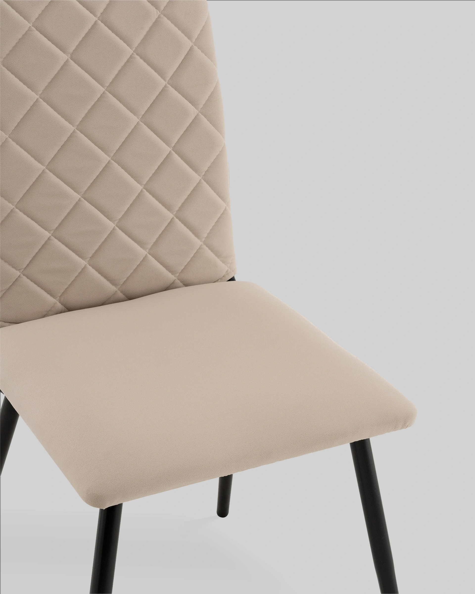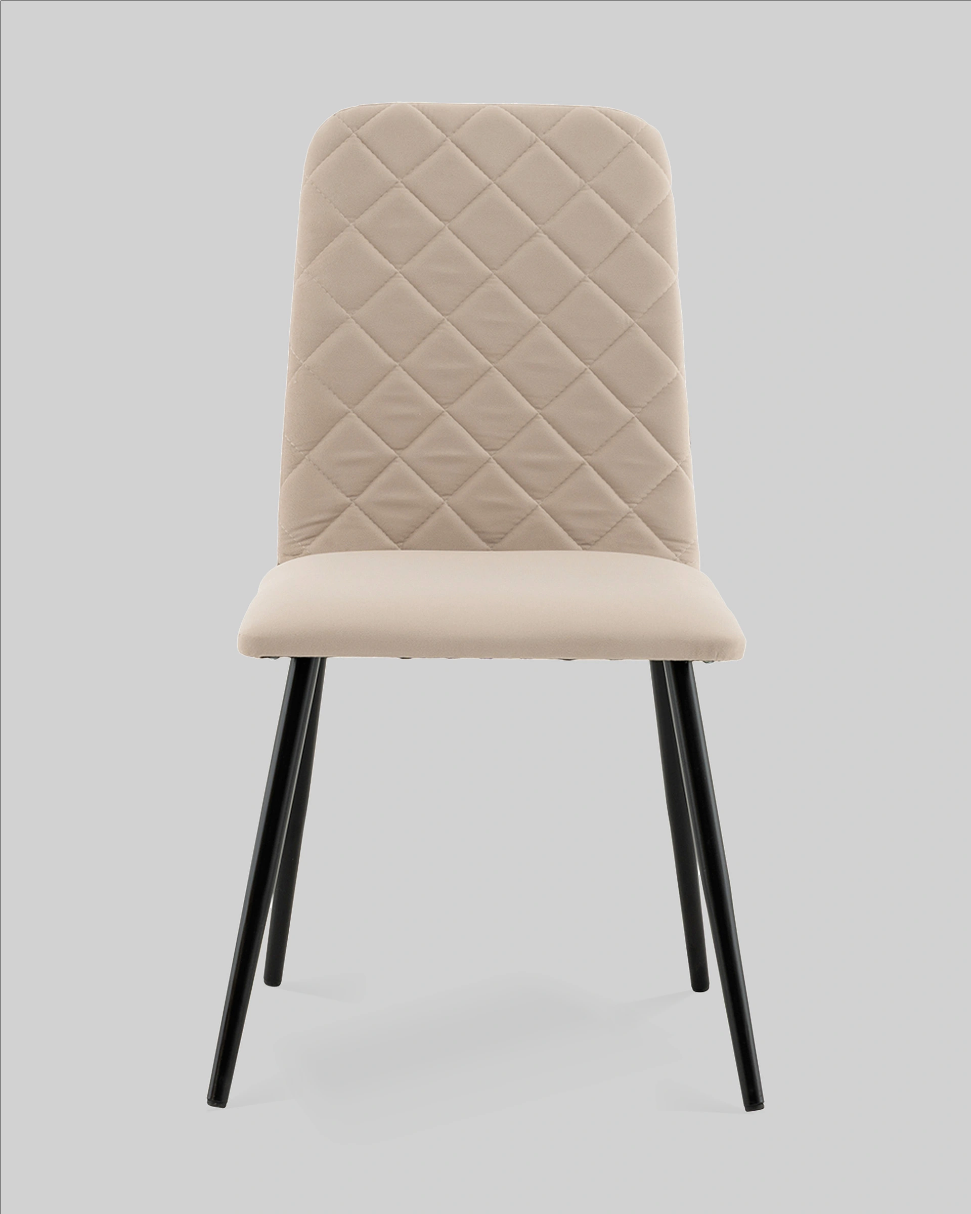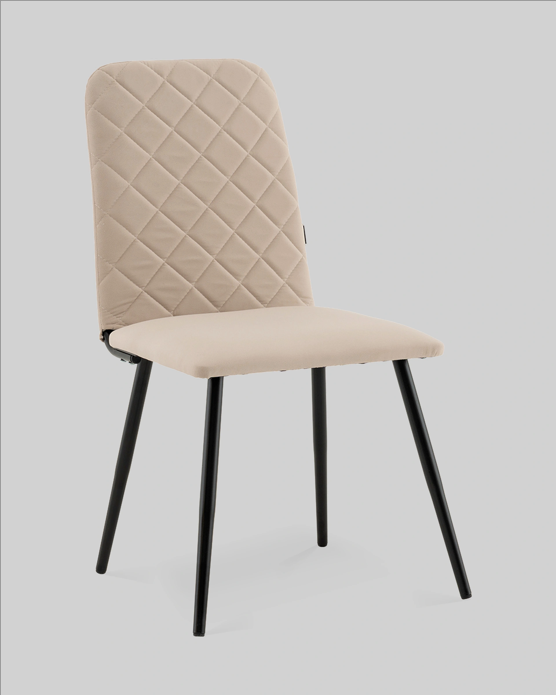 Спинка стула украшена аккуратной стёжкой в виде ромбов, добавляющей визуальный интерес и подчёркивающей уютный характер. Прямое сиденье и слегка наклонённая спинка обеспечивают удобную посадку для повседневных трапез и бесед. Прочные металлические ножки в чёрном цвете гарантируют надёжность и устойчивость конструкции.