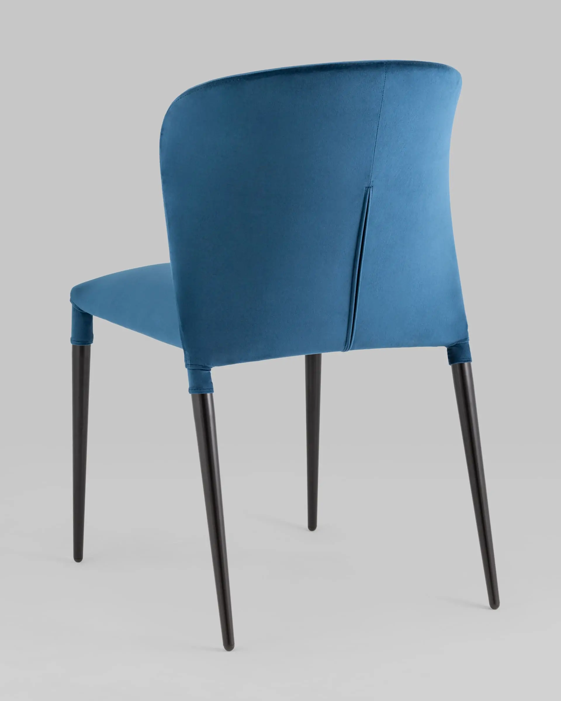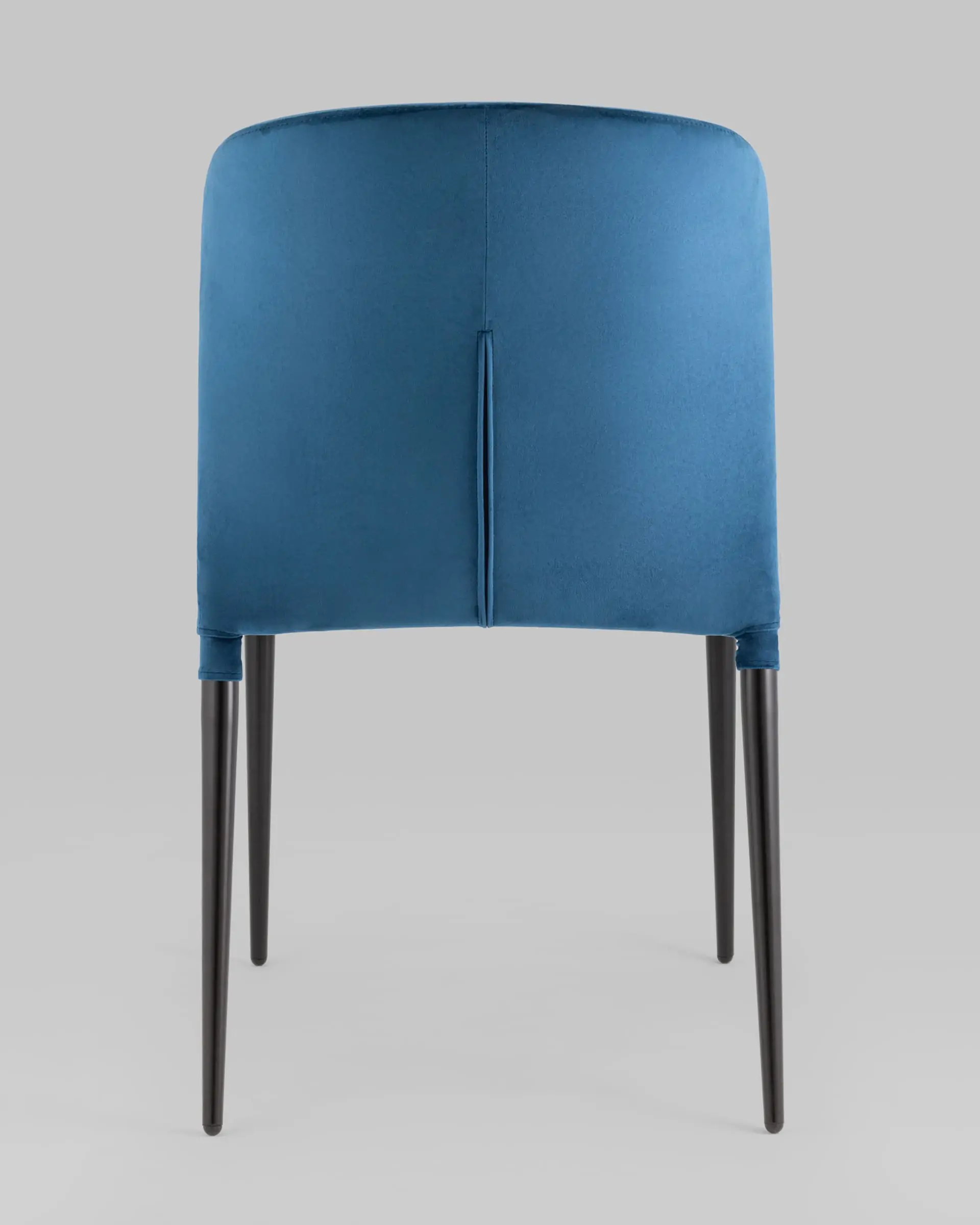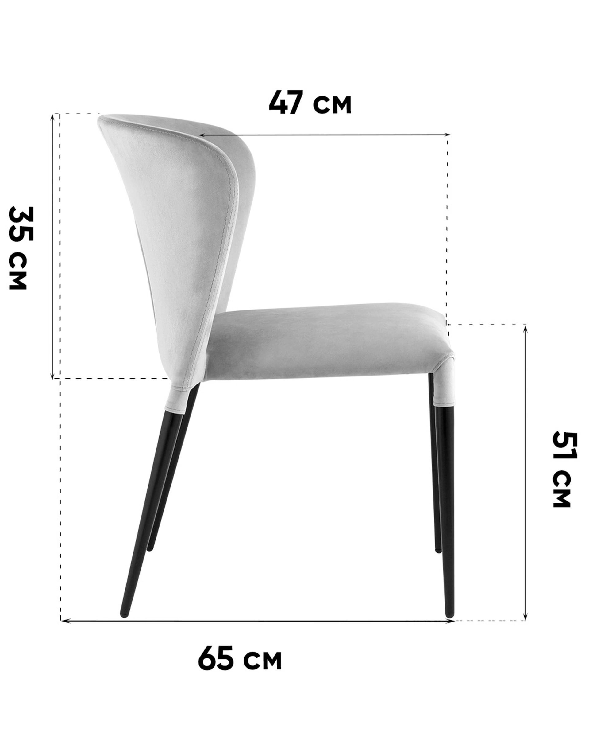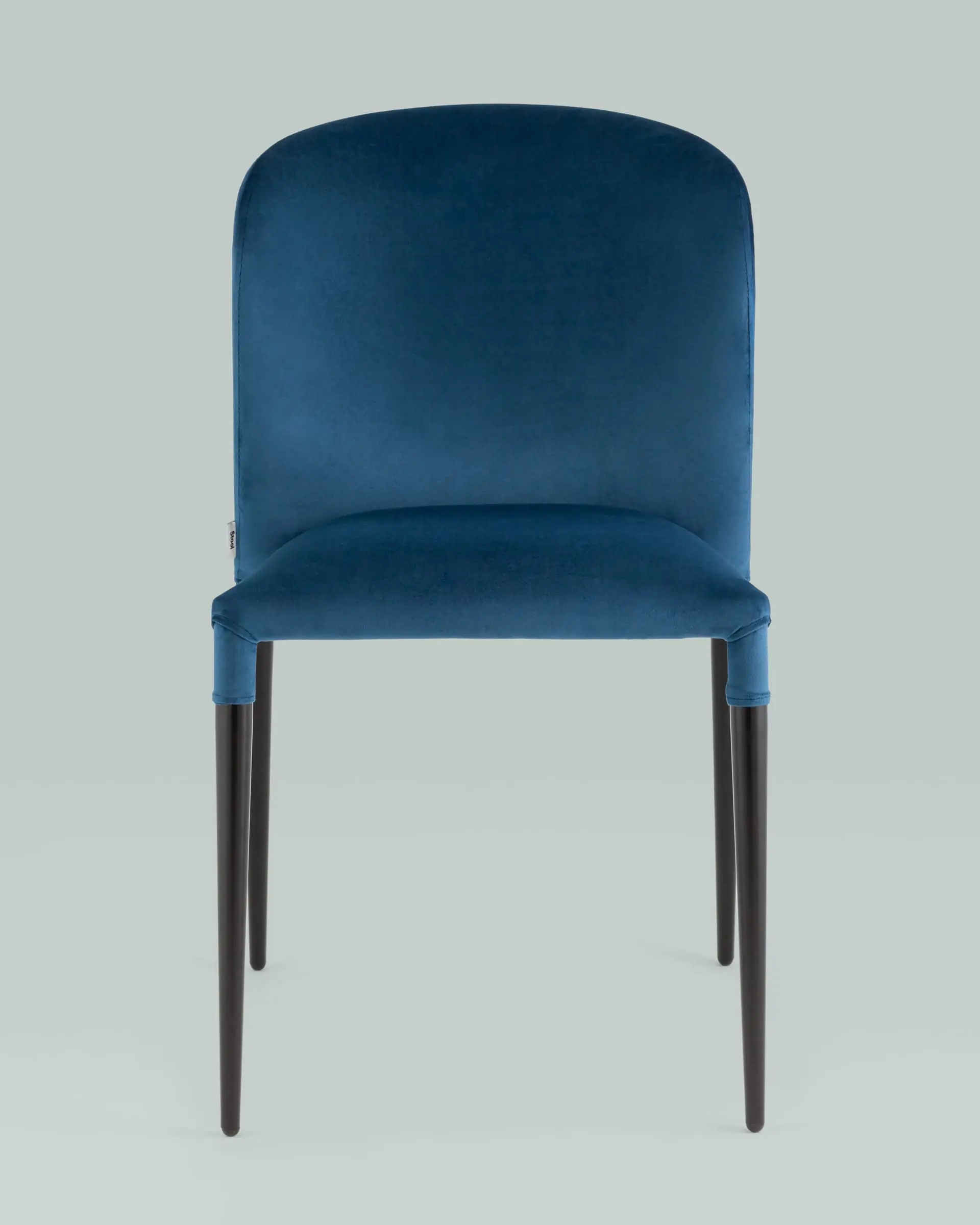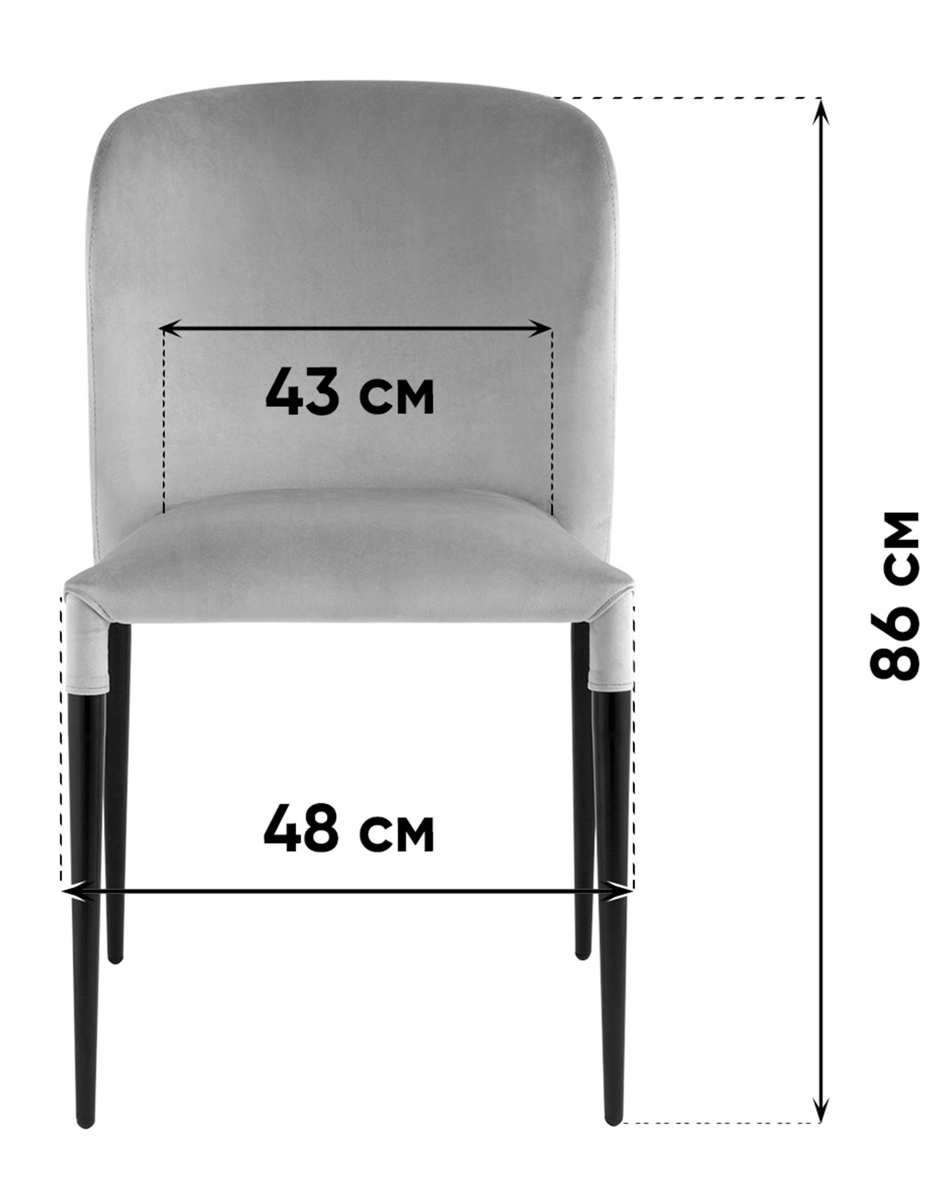 Обивка стула выполнена из велюра. Материал тактильно приятный, износостойкий, прост в уходе и быстро восстанавливает первоначальную форму. Ножки изготовлены из металла в черном цвете. Закругленная эргономичная спинка с выступающими по бокам элементами обеспечивает максимальный комфорт. На ножках предусмотрены специальные подпятники, которые предотвращают скольжение и не царапают напольное покрытие.