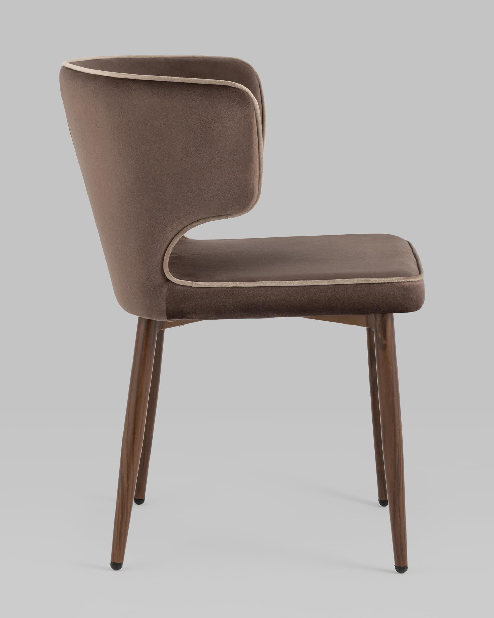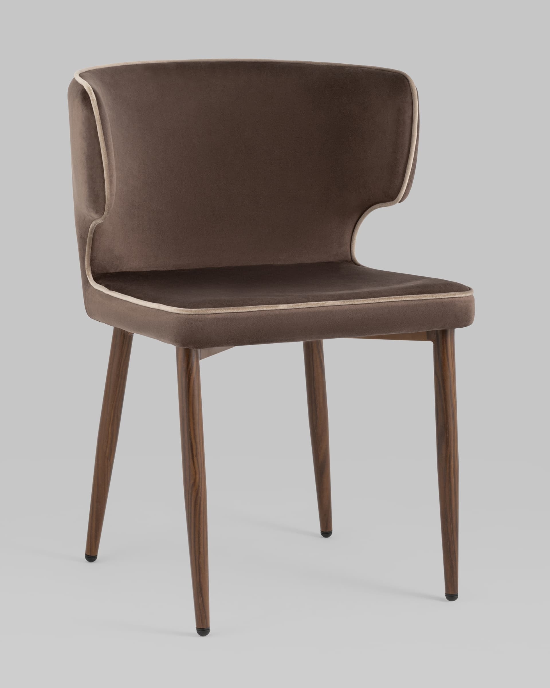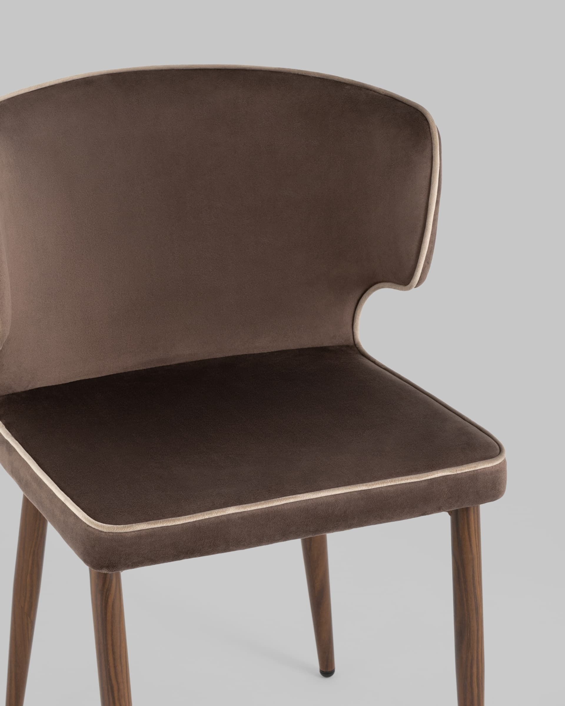В качестве обивки используется велюр – прочный износостойкий материал. Прямые металлические ножки, стилизованные под темное дерево, имеют нестандартную форму в виде перевернутого конуса, поэтому обеспечивают хорошую устойчивость и делают стул оригинальным.