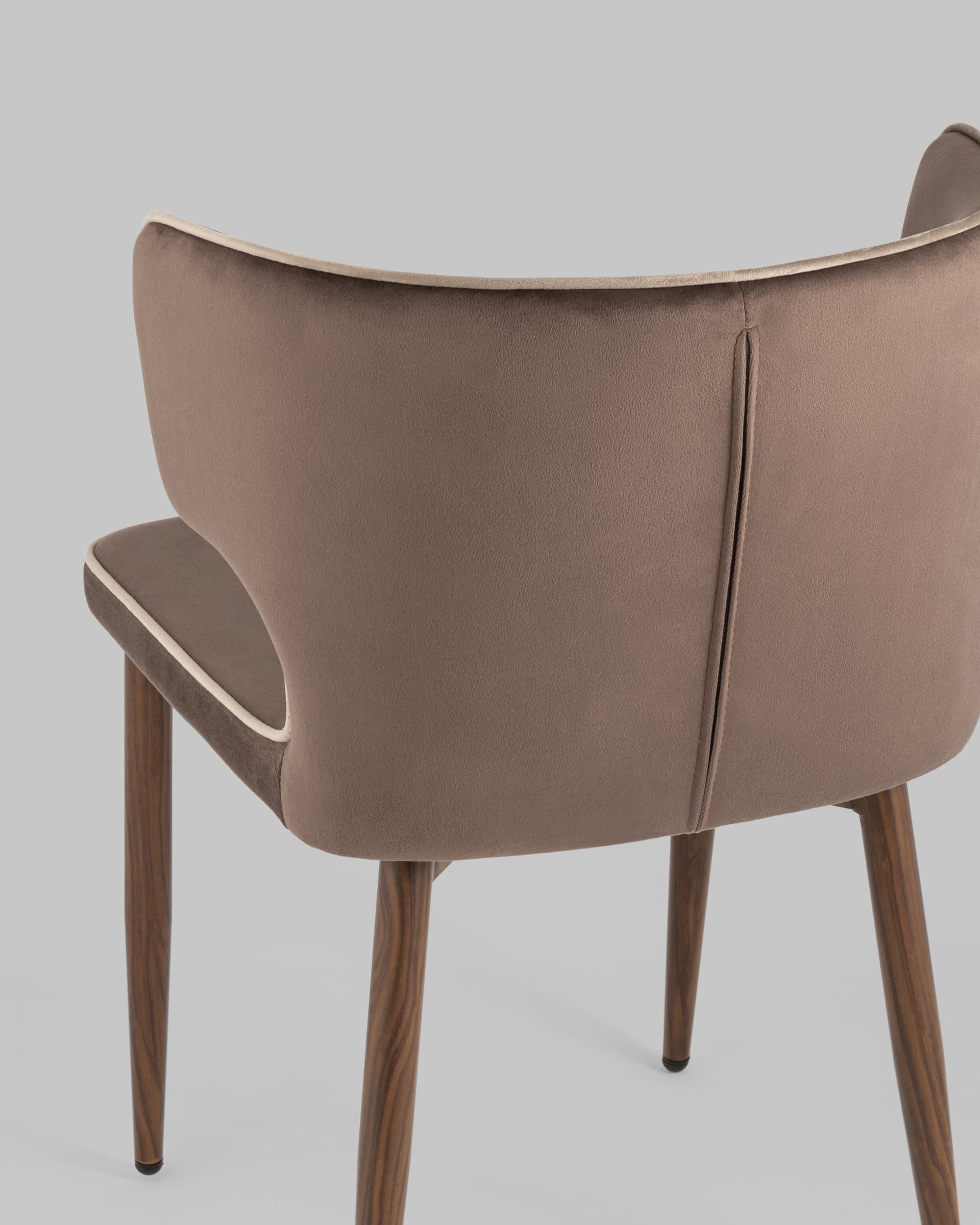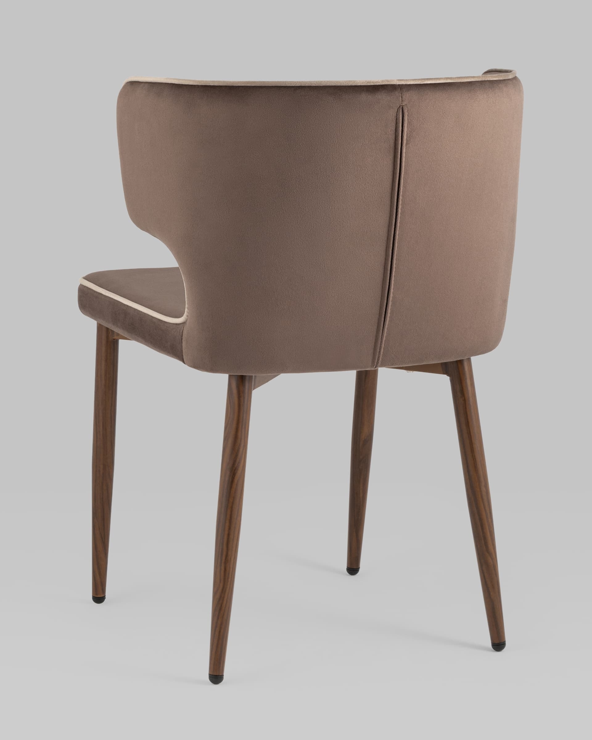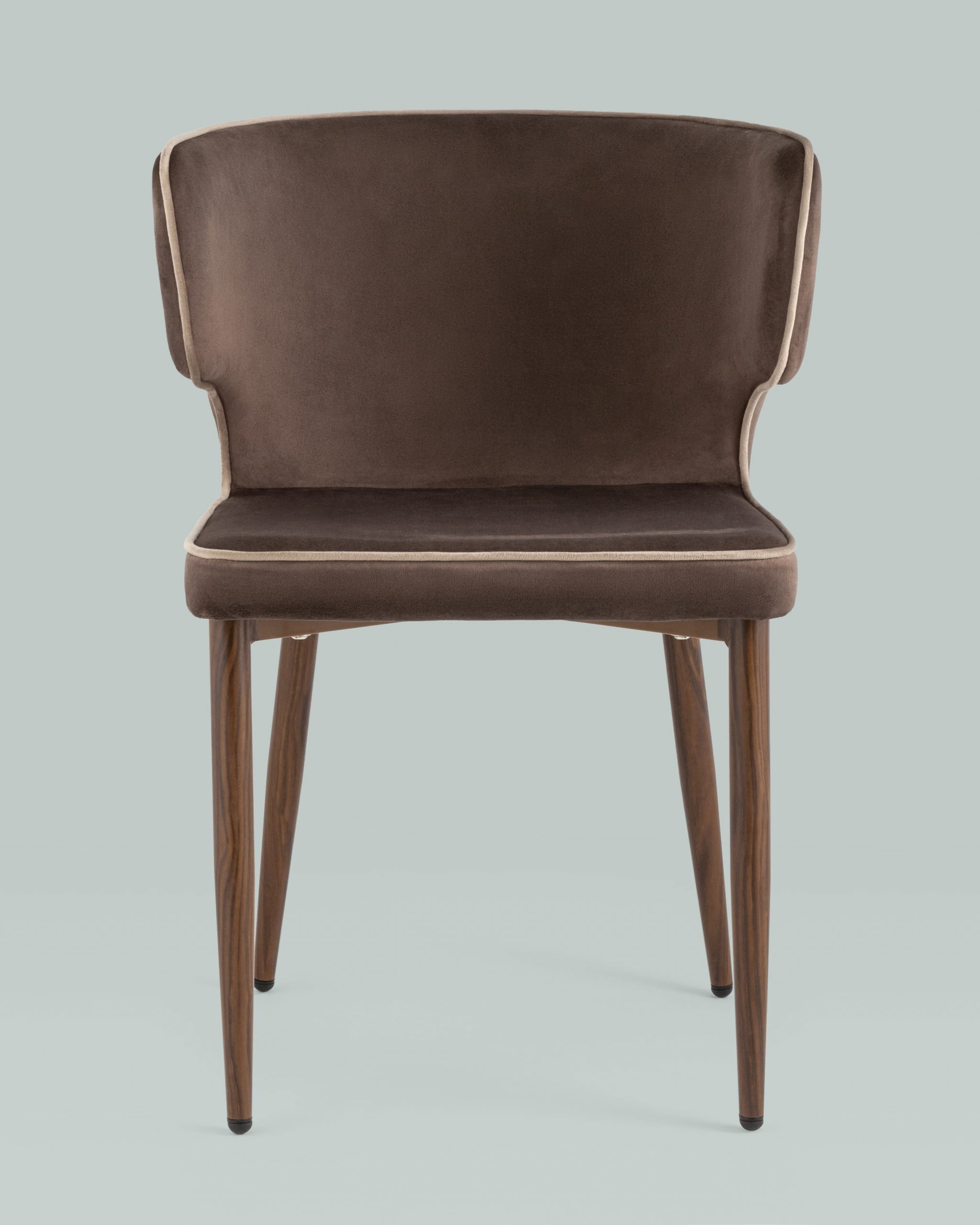 В качестве обивки используется велюр – прочный износостойкий материал. Прямые металлические ножки, стилизованные под темное дерево, имеют нестандартную форму в виде перевернутого конуса, поэтому обеспечивают хорошую устойчивость и делают стул оригинальным.