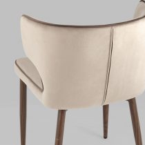 В качестве обивки используется велюр – прочный износостойкий материал. Прямые металлические ножки, стилизованные под темное дерево, имеют нестандартную форму в виде перевернутого конуса, поэтому обеспечивают хорошую устойчивость и делают стул оригинальным.