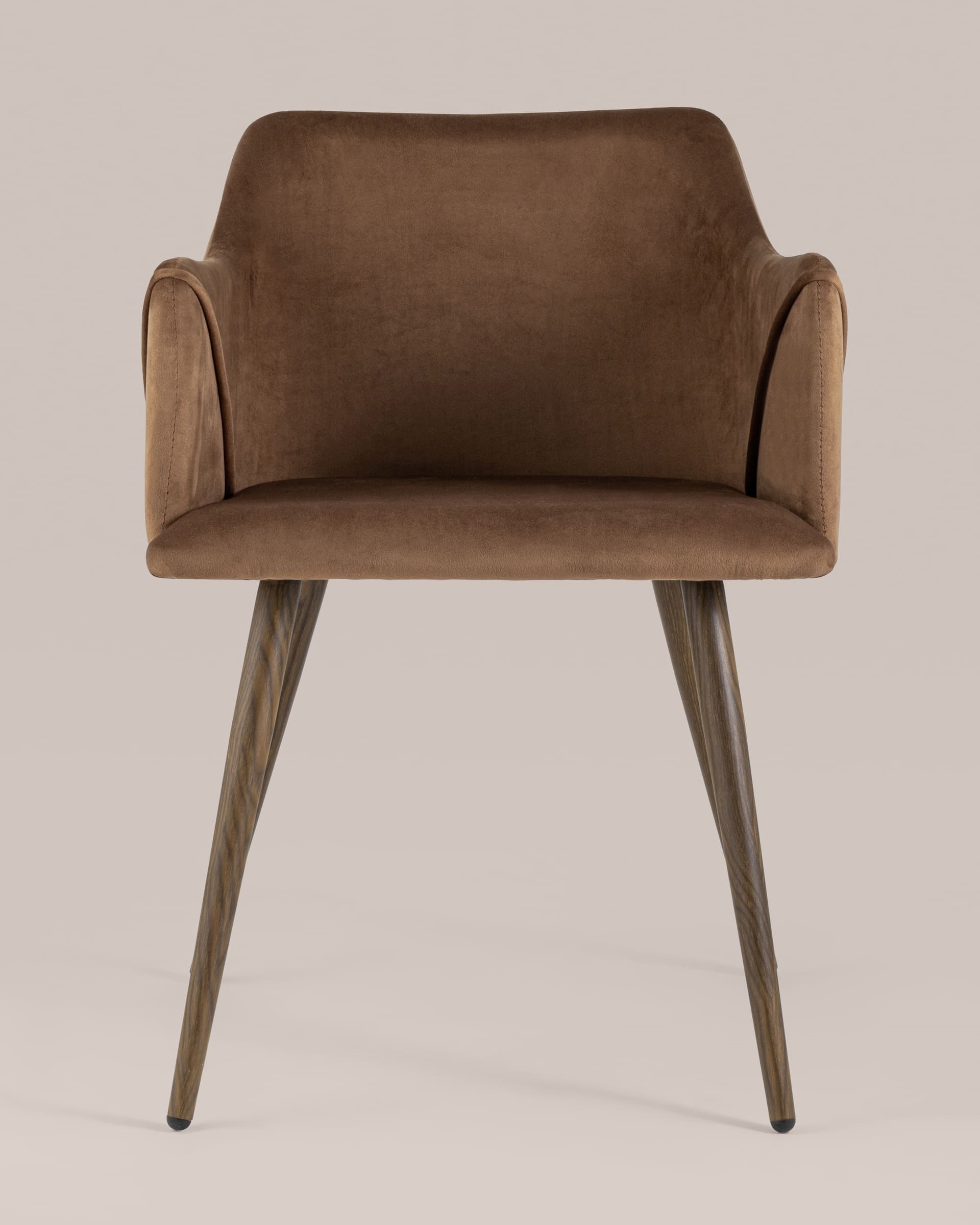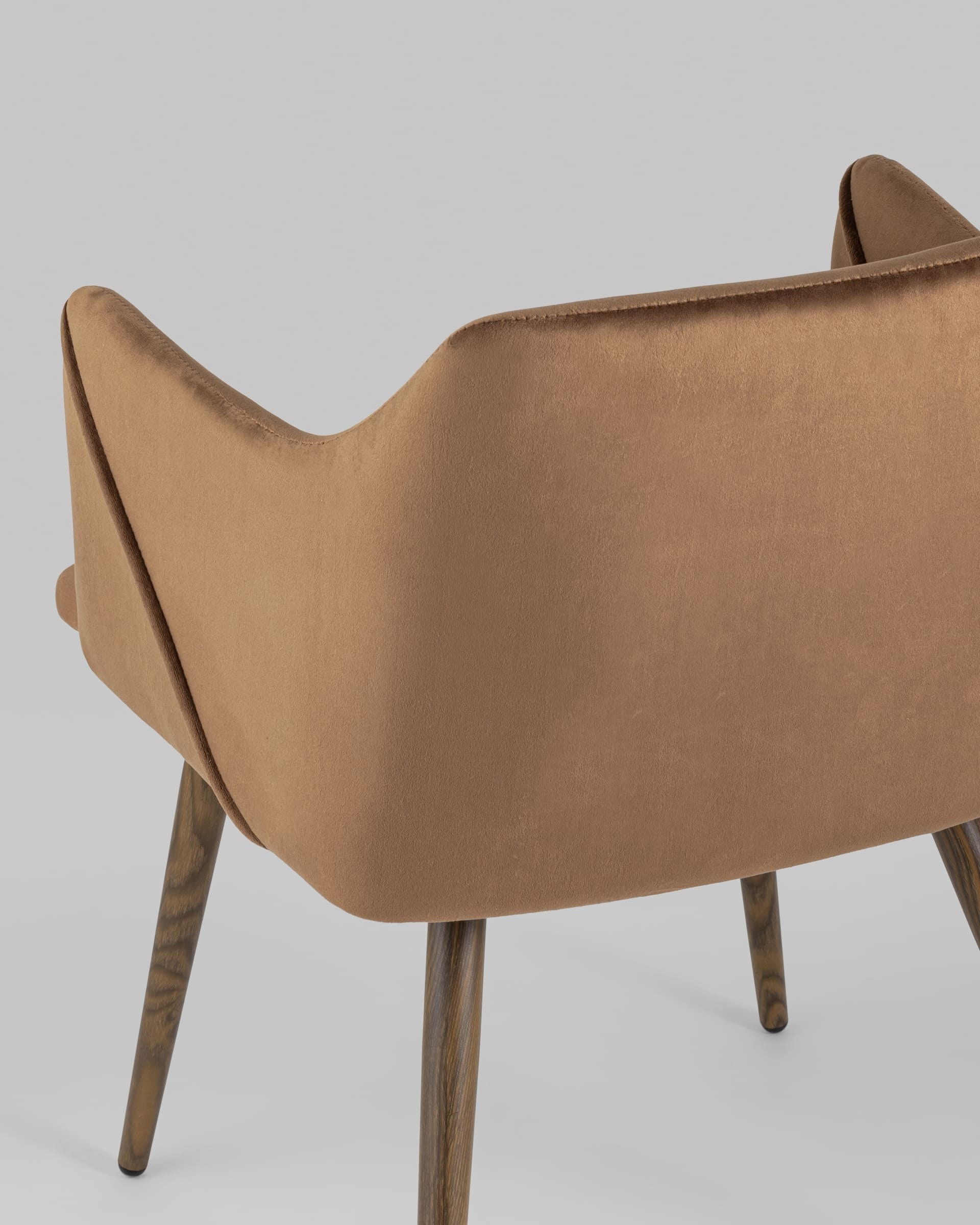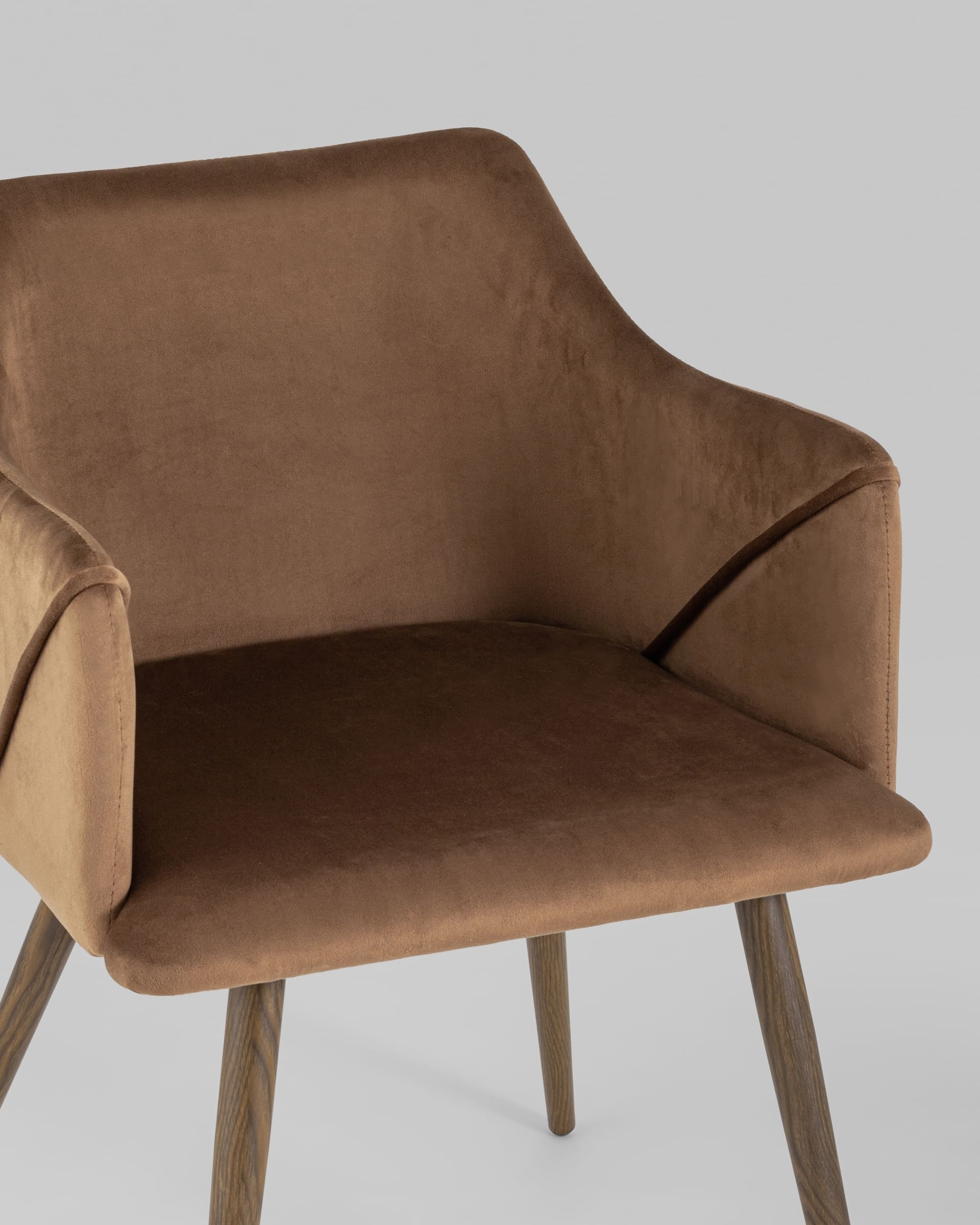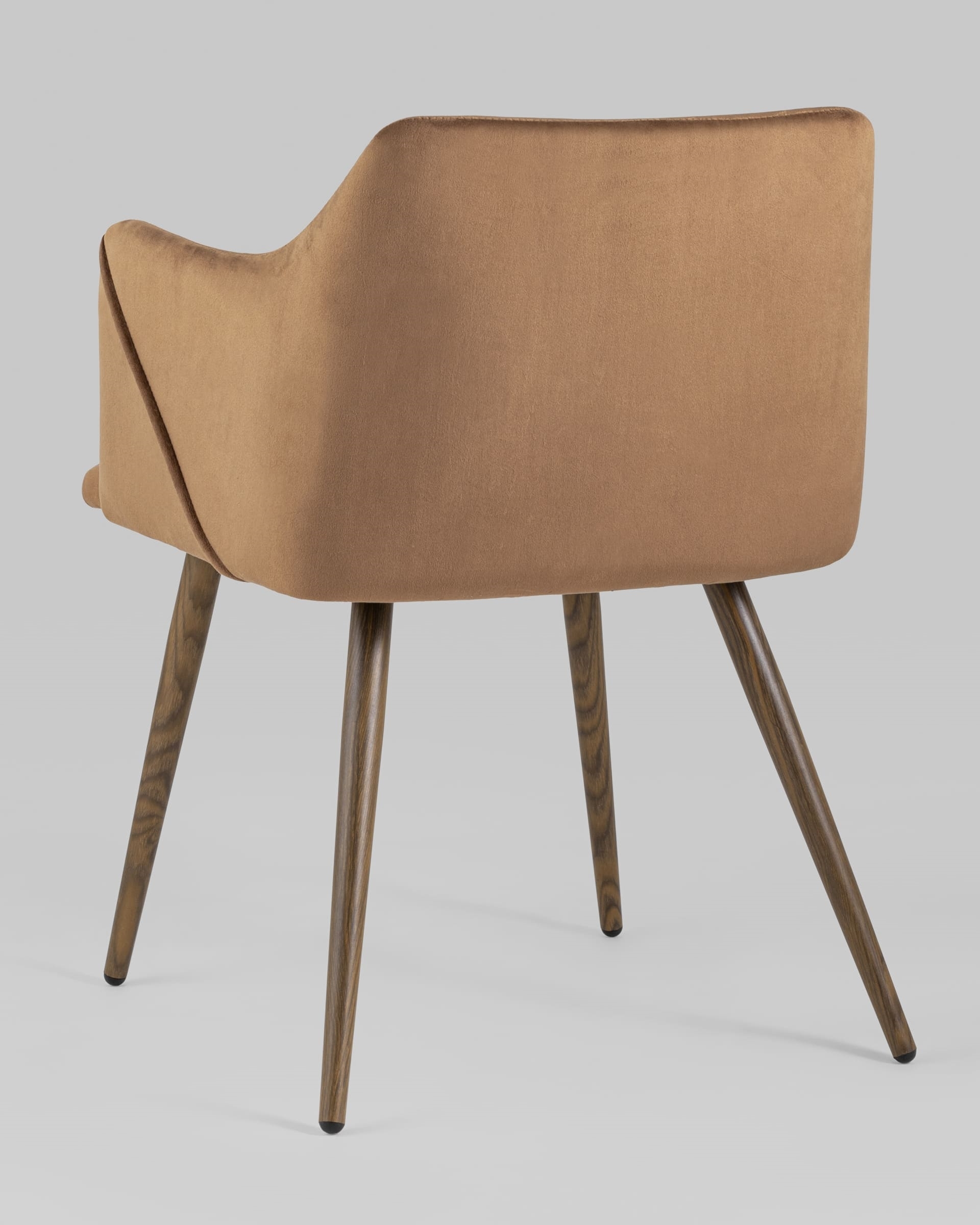 Стильный и мягкий кухонный стул имеет широкую эргономичную спинку и удобные подлокотники. Обивкой послужила высококачественная плотная ткань. Ножки металлические с принтом под дерево.