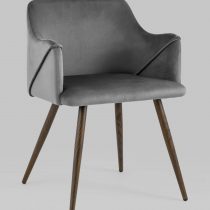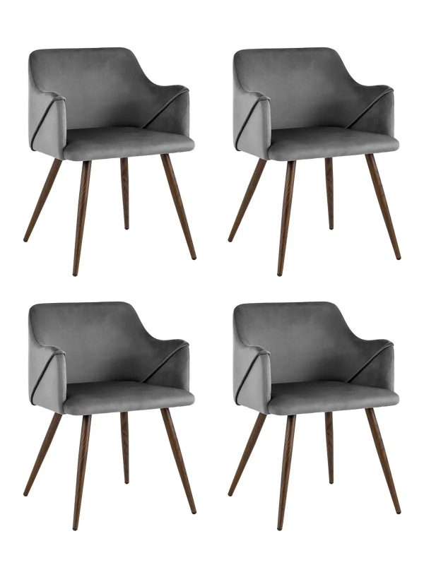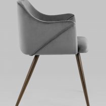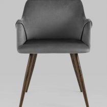 Комплект из четырех стульев. Стильный и мягкий кухонный стул имеет широкую эргономичную спинку и удобные подлокотники. Обивкой послужила высококачественная плотная ткань. Ножки металлические с принтом под дерево. Высота подлокотников от пола – 63,5 см.